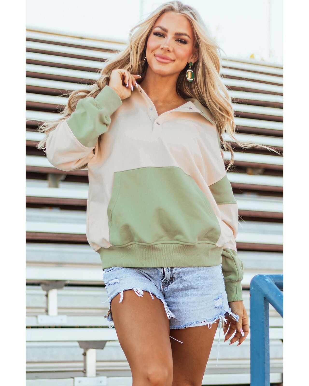 • Laurel Green Colorblock Patchwork Buttoned Collar Kangaroo Pocket Sweatshirt