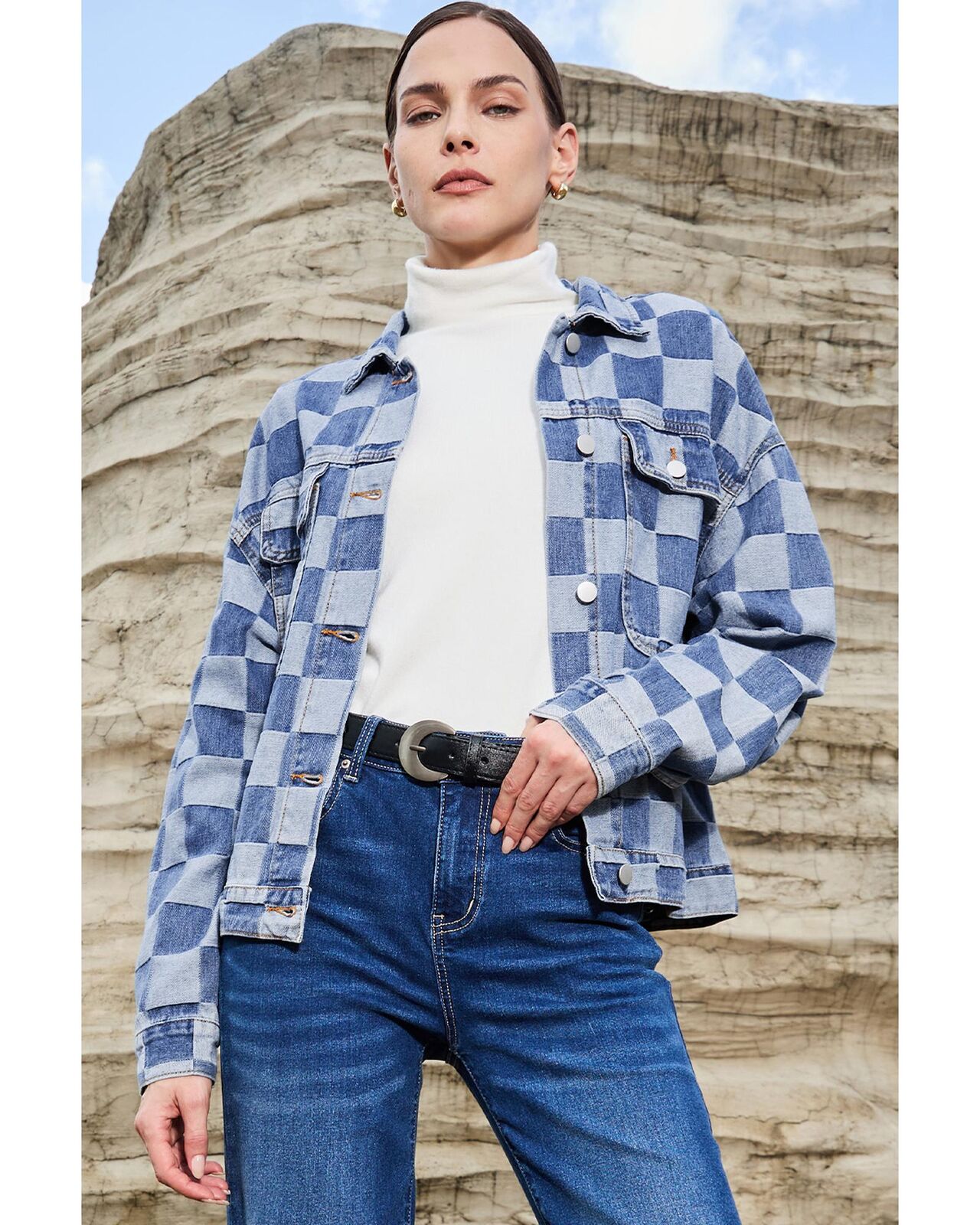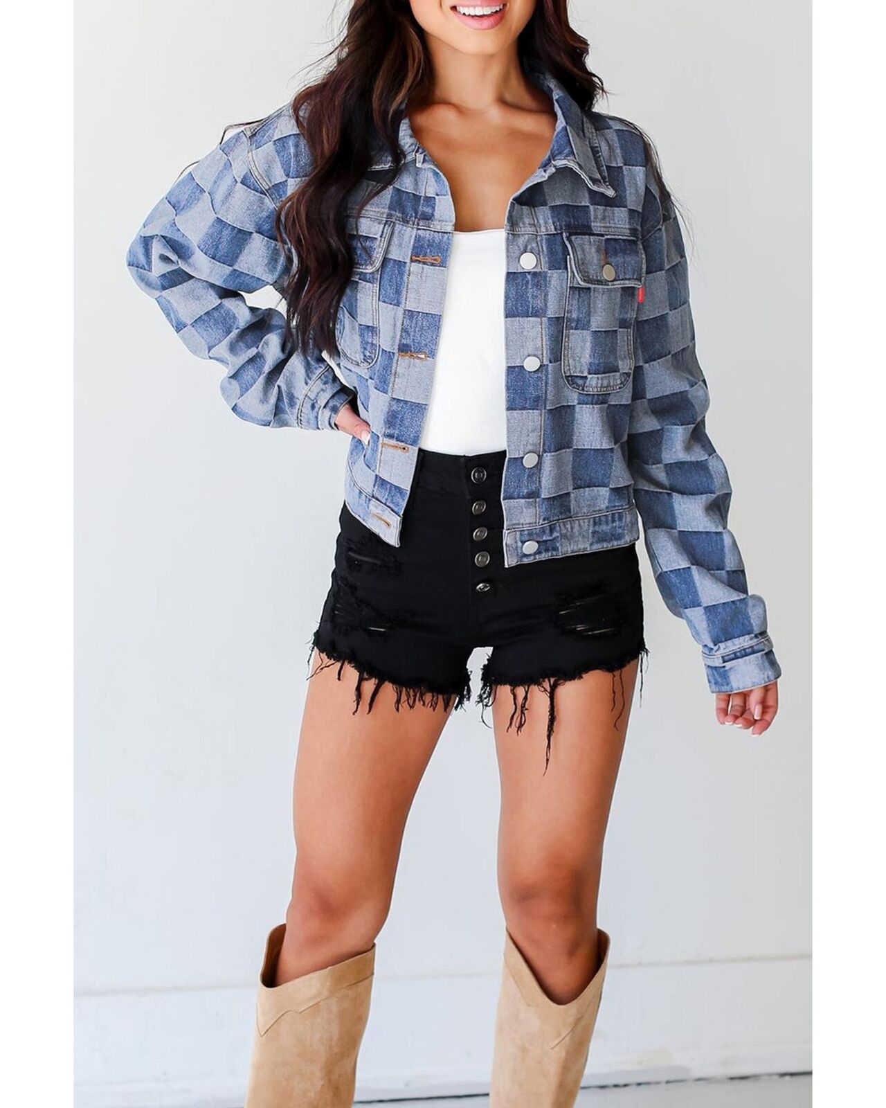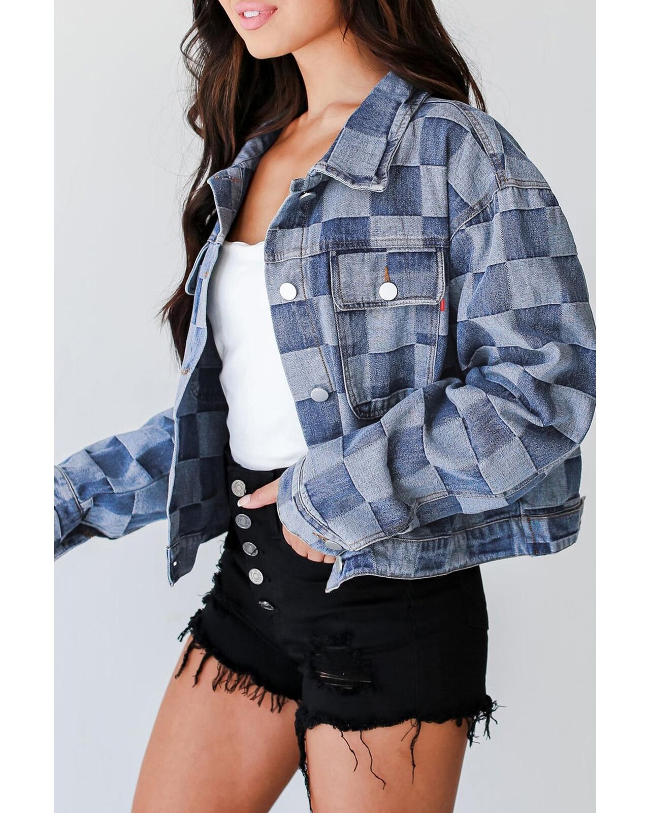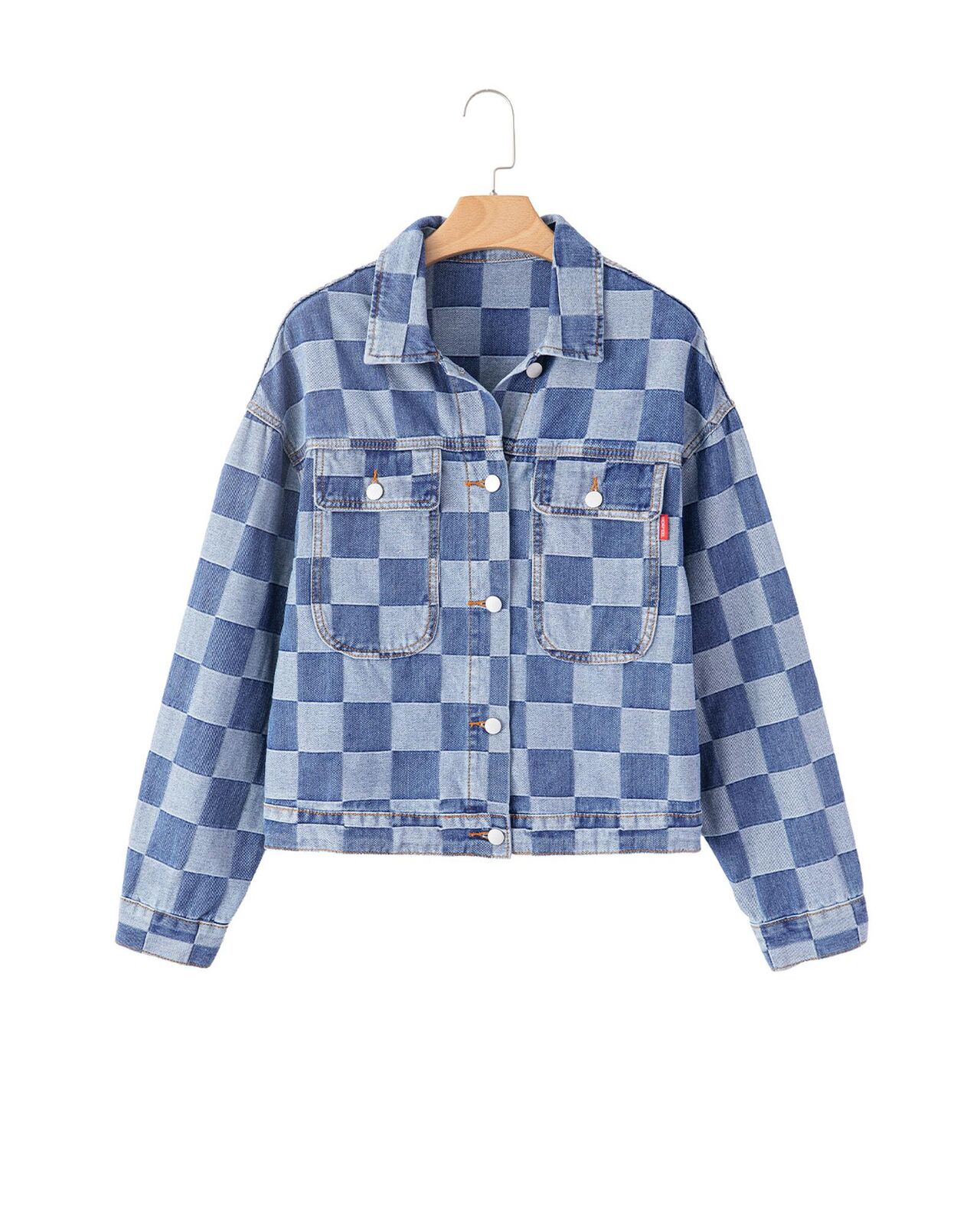 • Light Blue Checkered Patchwork Button up Denim Jacket