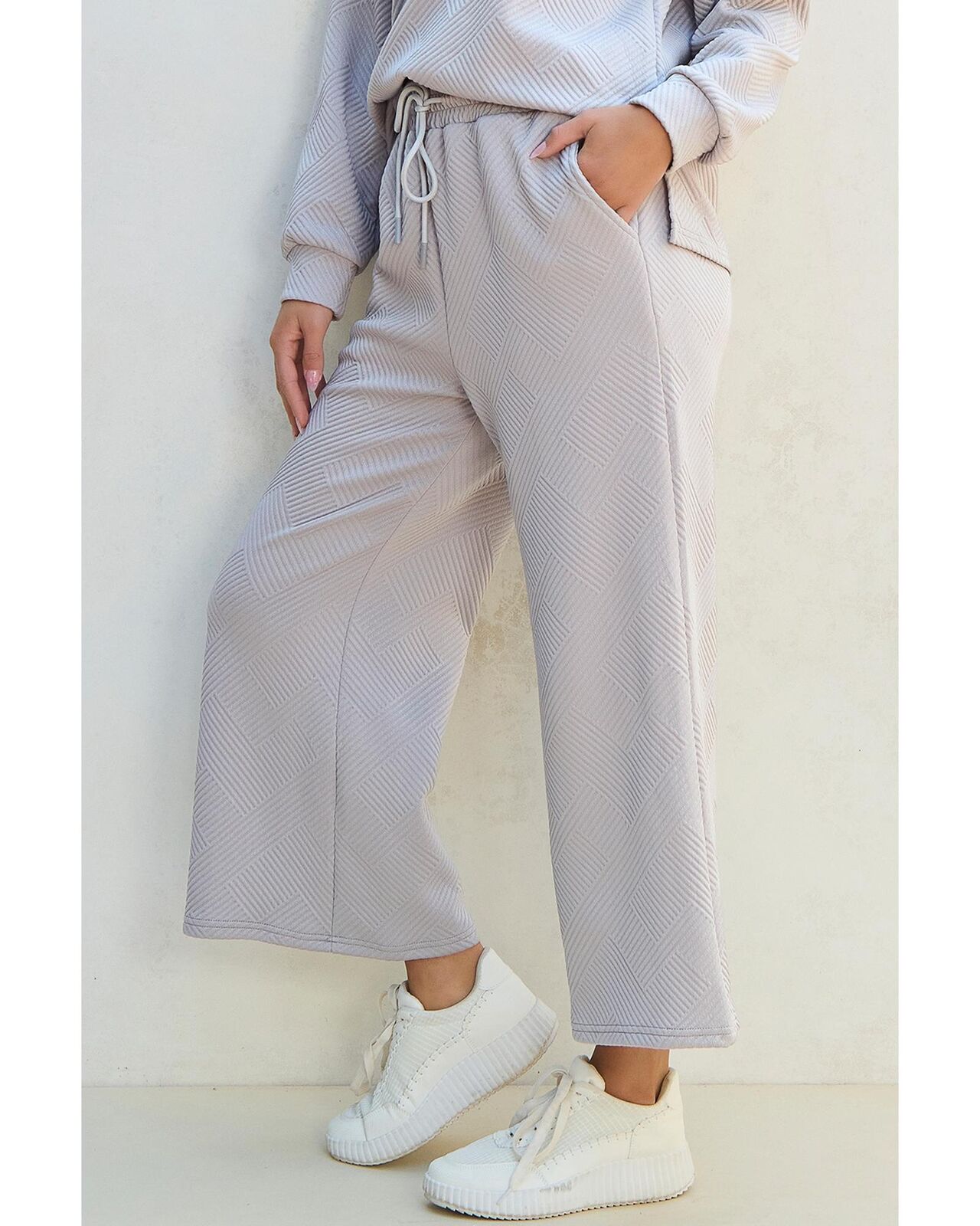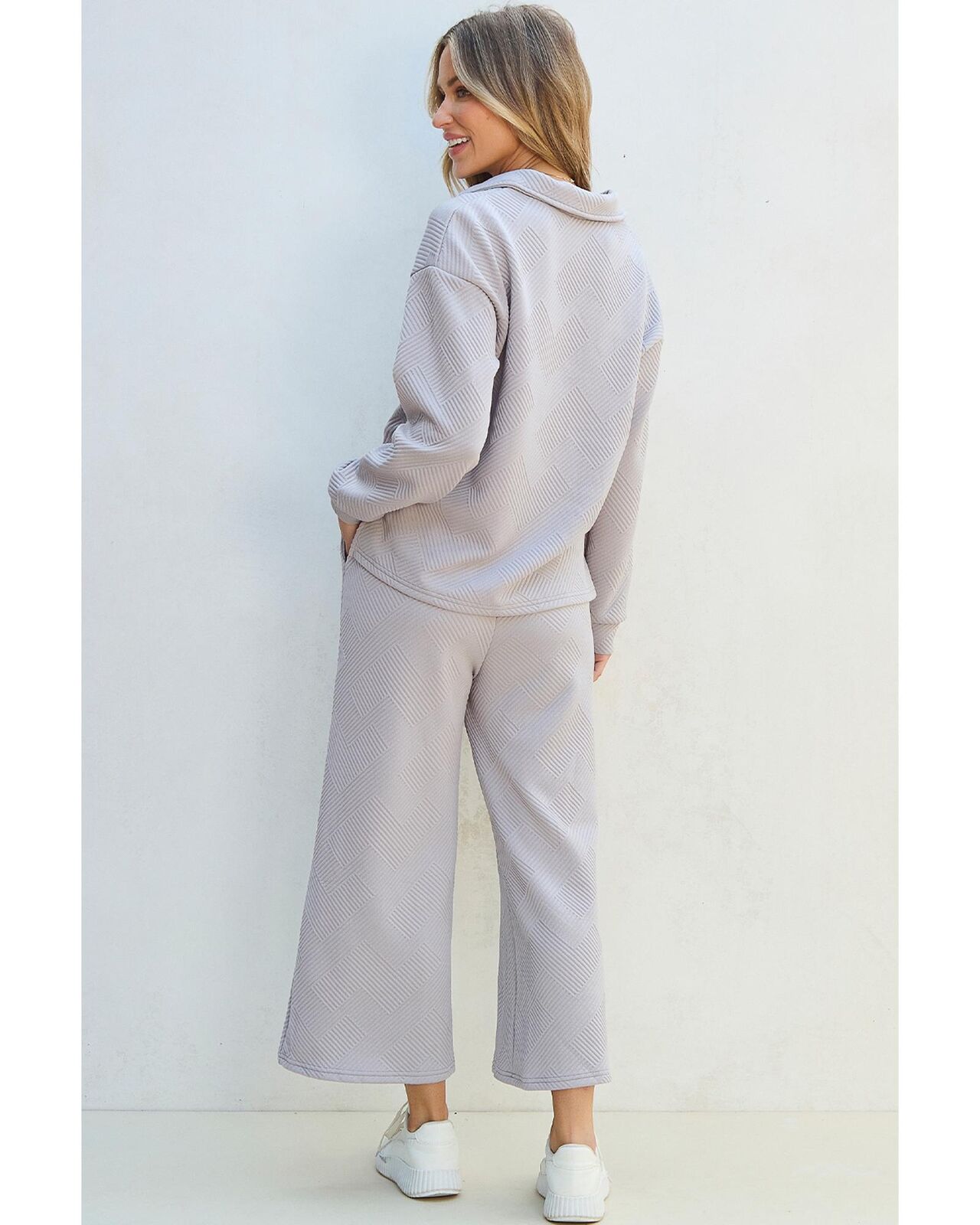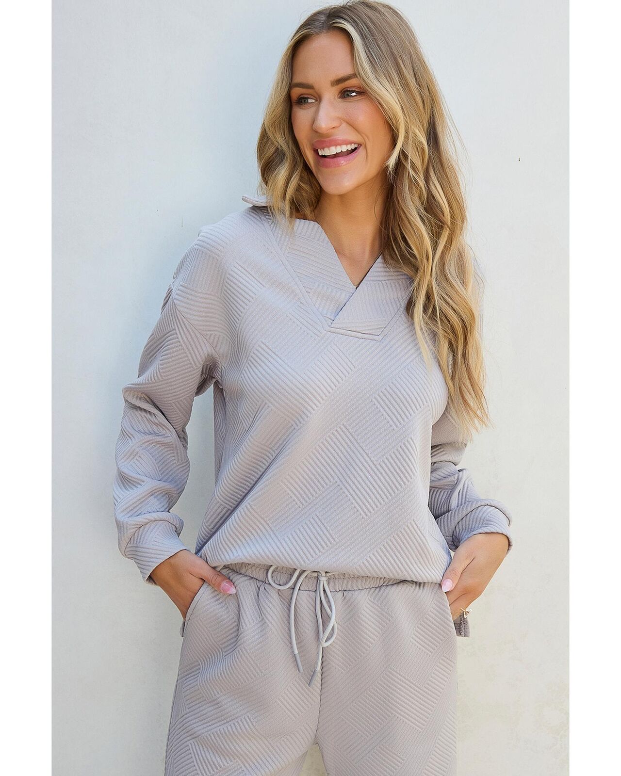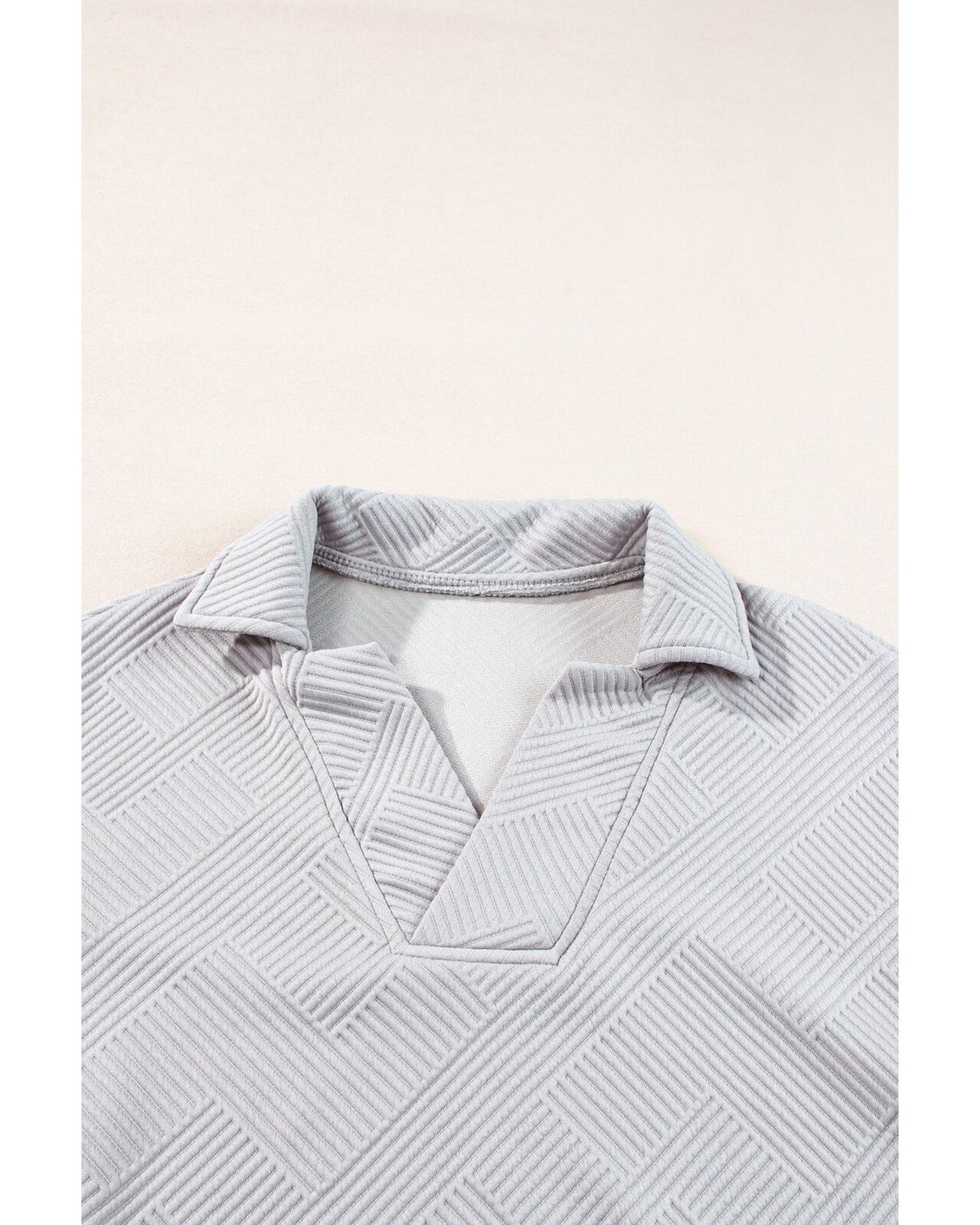 • Light Grey Solid Textured Collared V Neck Top and Wide Leg Pants Set