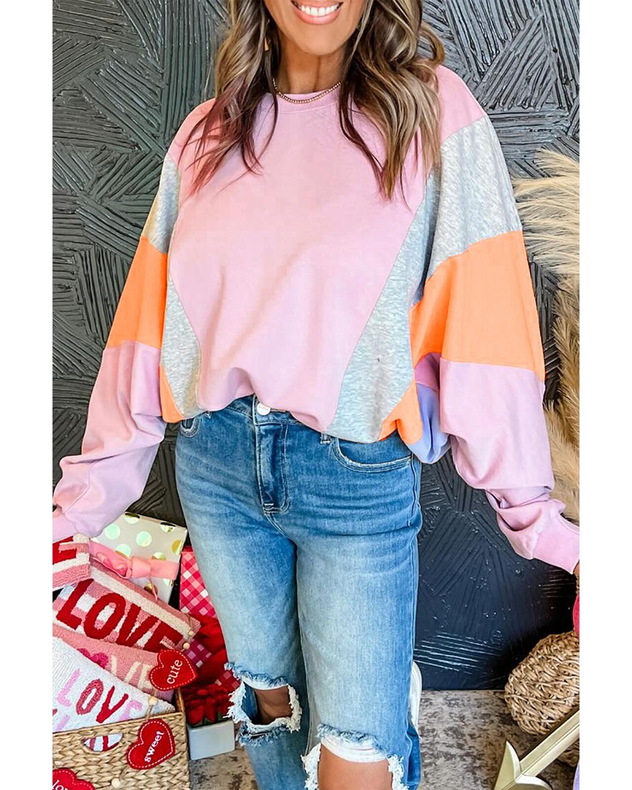 • Light Pink Color Block Batwing Sleeve Loose Fit Sweatshirt