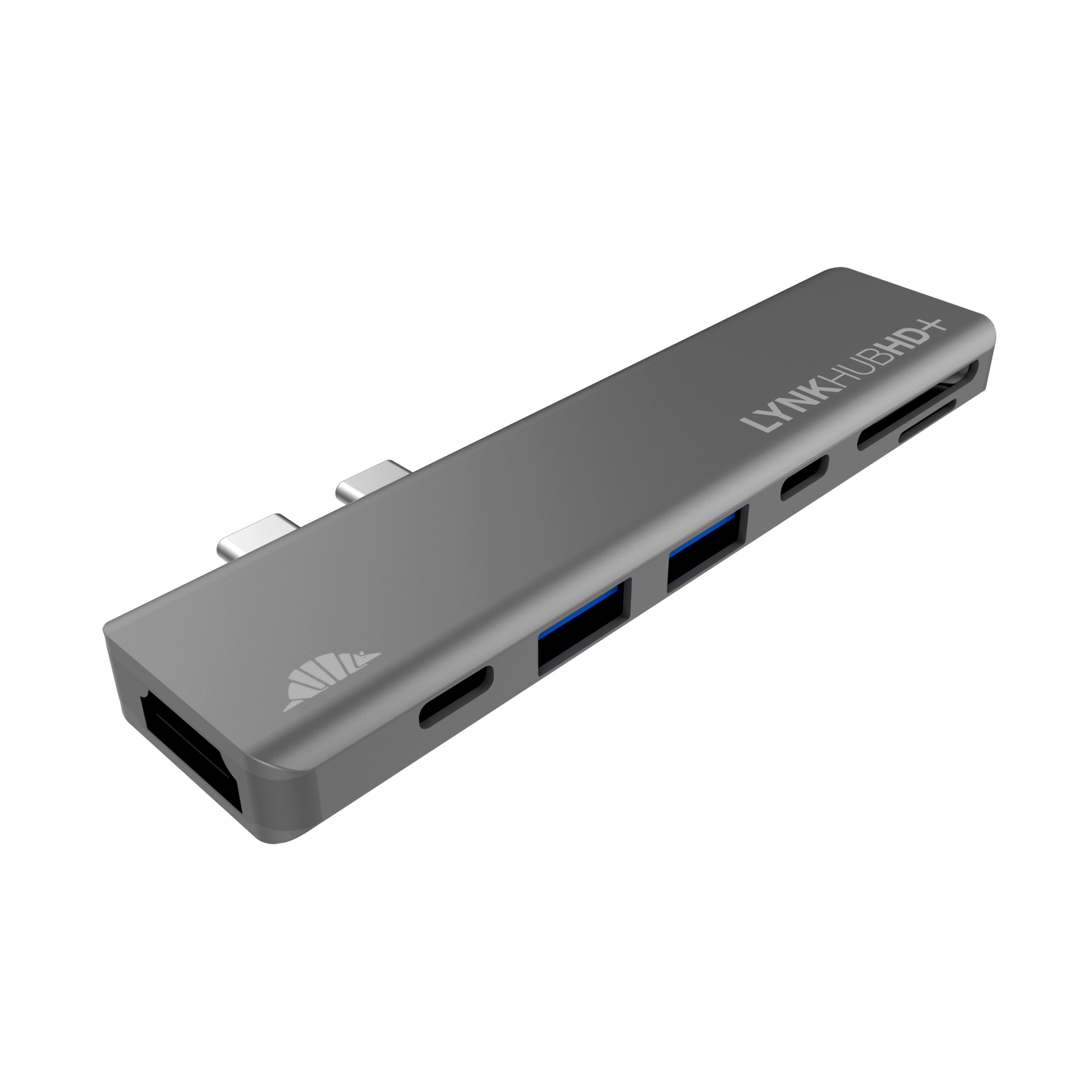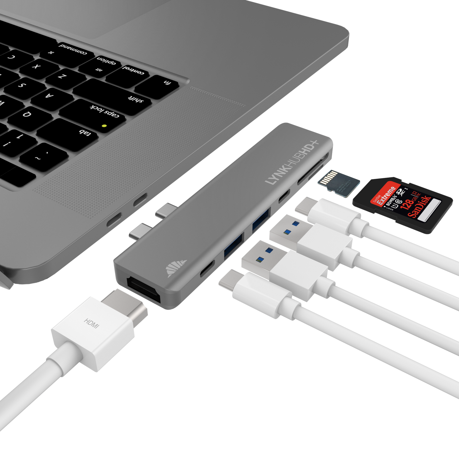 TheLynkHUB HD+ is a 7-in-1 adapterthat connects to all of the ports you need! With multiple USB ports, a SD and MicroSD slot, and HDMI connection, you\'ll be able to connect tons of devices to your laptop. The available ports in the lynkHUB HD+ are as follows: USB C, two USB ports, SD Card Reader, MicroSD Card Reader, and a HDMI port.