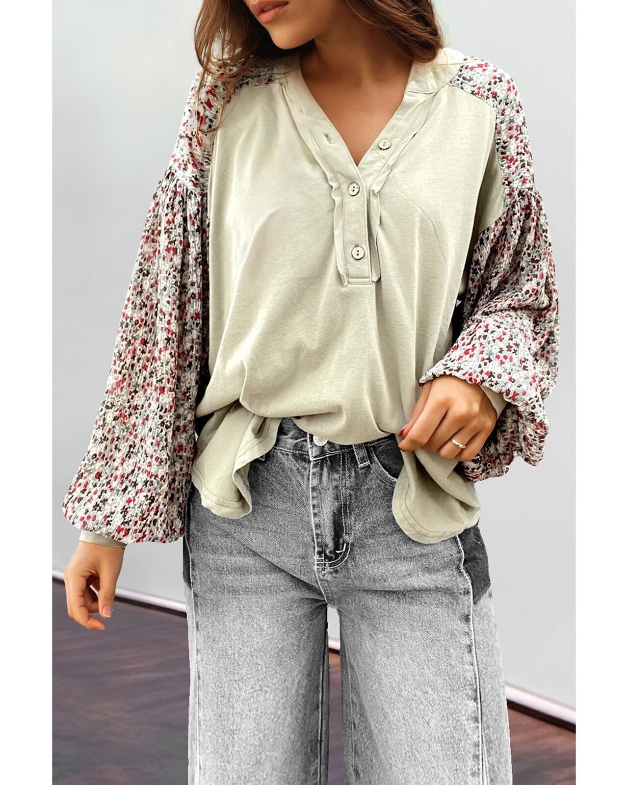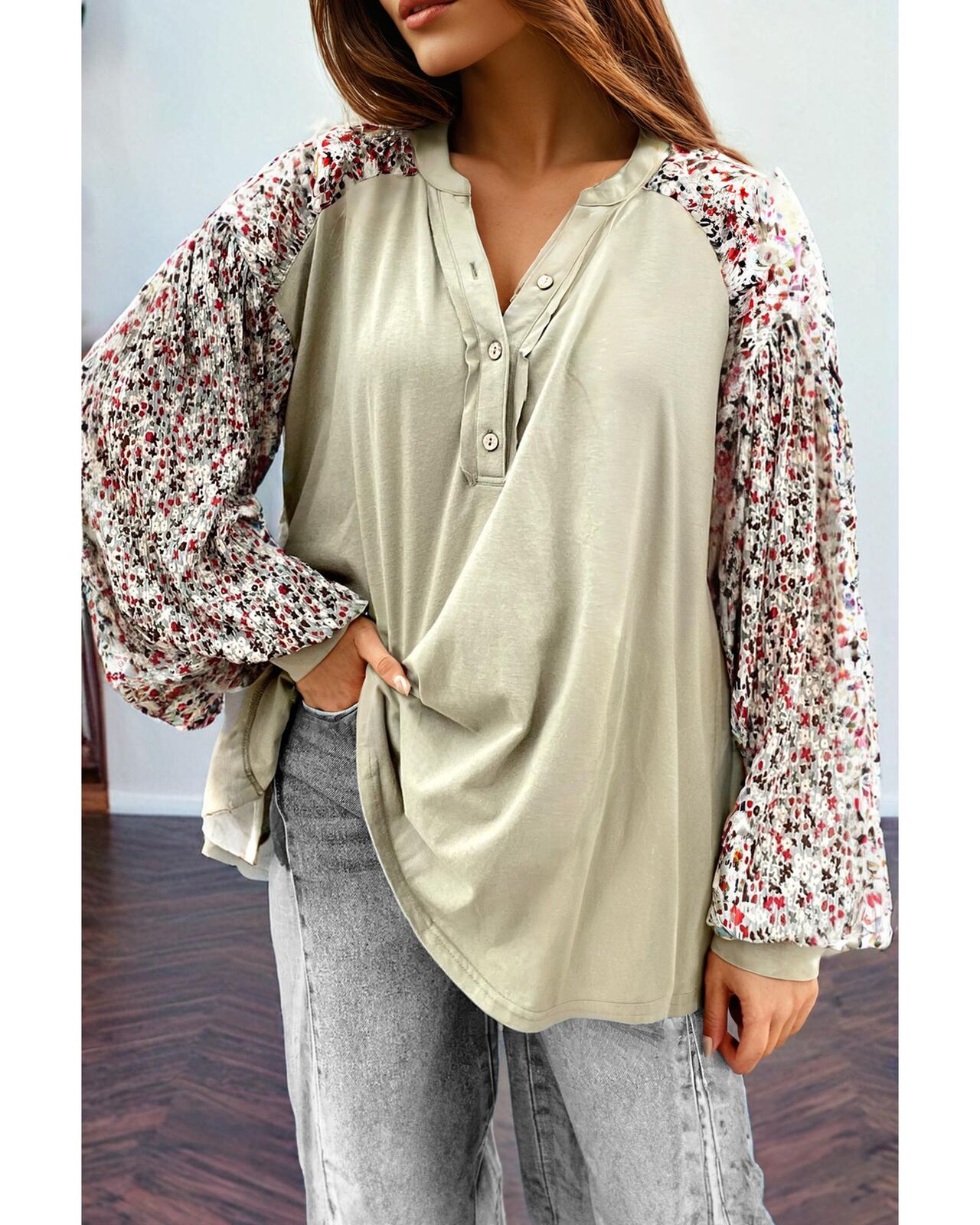 • Meadow Mist Green Contrast Printed Bubble Sleeve Henley Loose Top with Slits