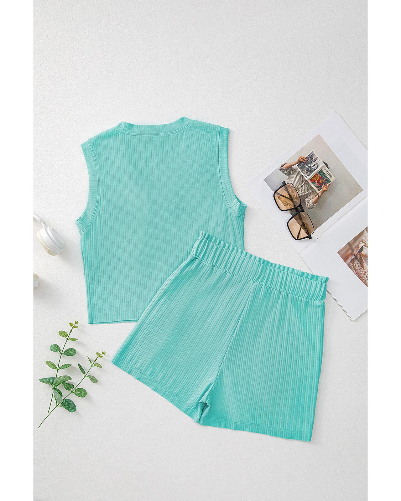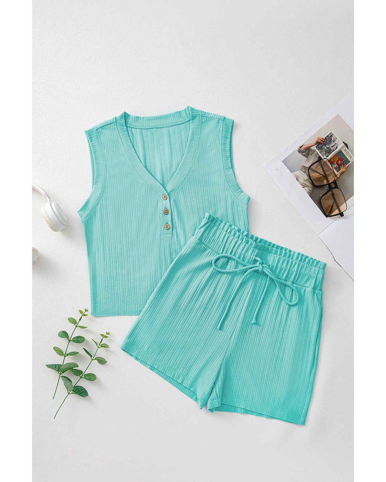 • Mint Green Ribbed Button V Neck Tank Top and Shorts Set