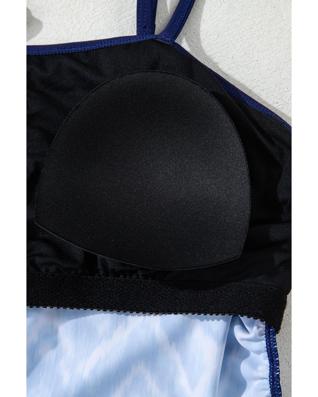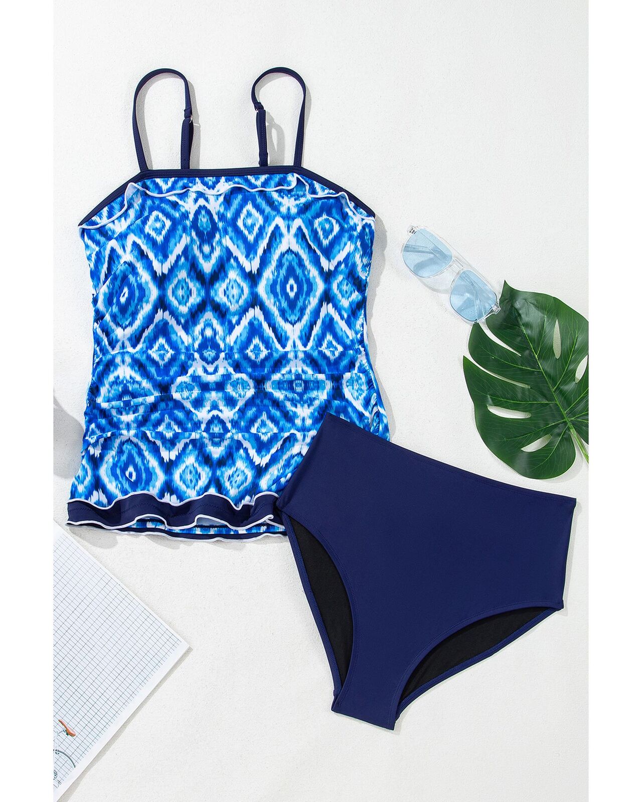 • Navy Blue Abstract Print Frilled Trim Spaghetti Straps Tankini Set