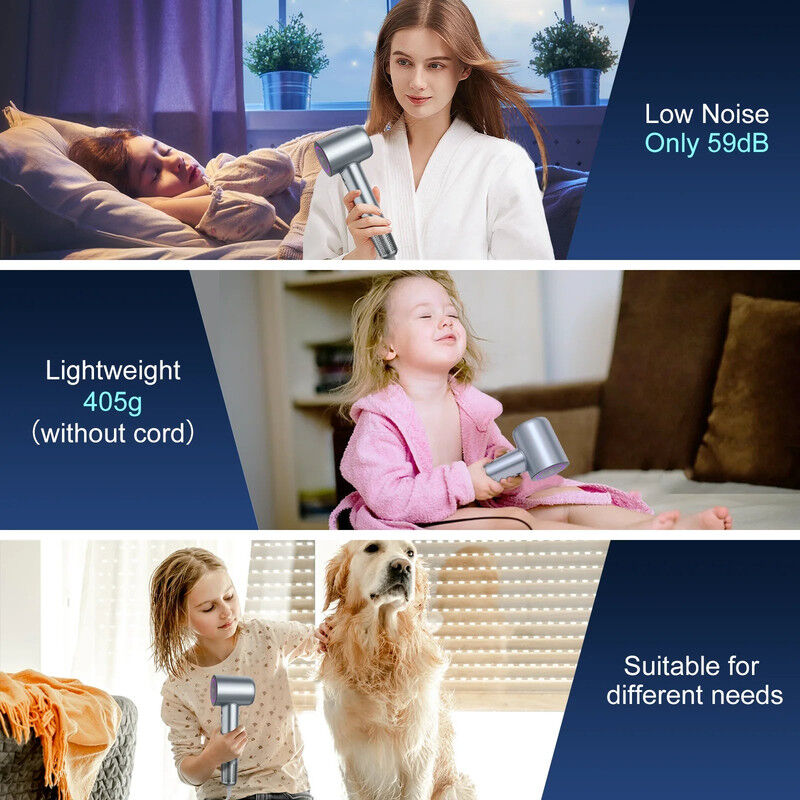 Featuring advanced negative ion technology, the dryer emits 200 million negative ions to eliminate static and frizz, leaving your hair smooth, shiny, and healthy. The dryer offers both hot and cold air modes, with 5 smart settings to cater to all your styling needs. Despite its powerful performance, the NNEOBA dryer operates quietly at just 59dB and is lightweight at 405g, making it comfortable to use for extended periods.