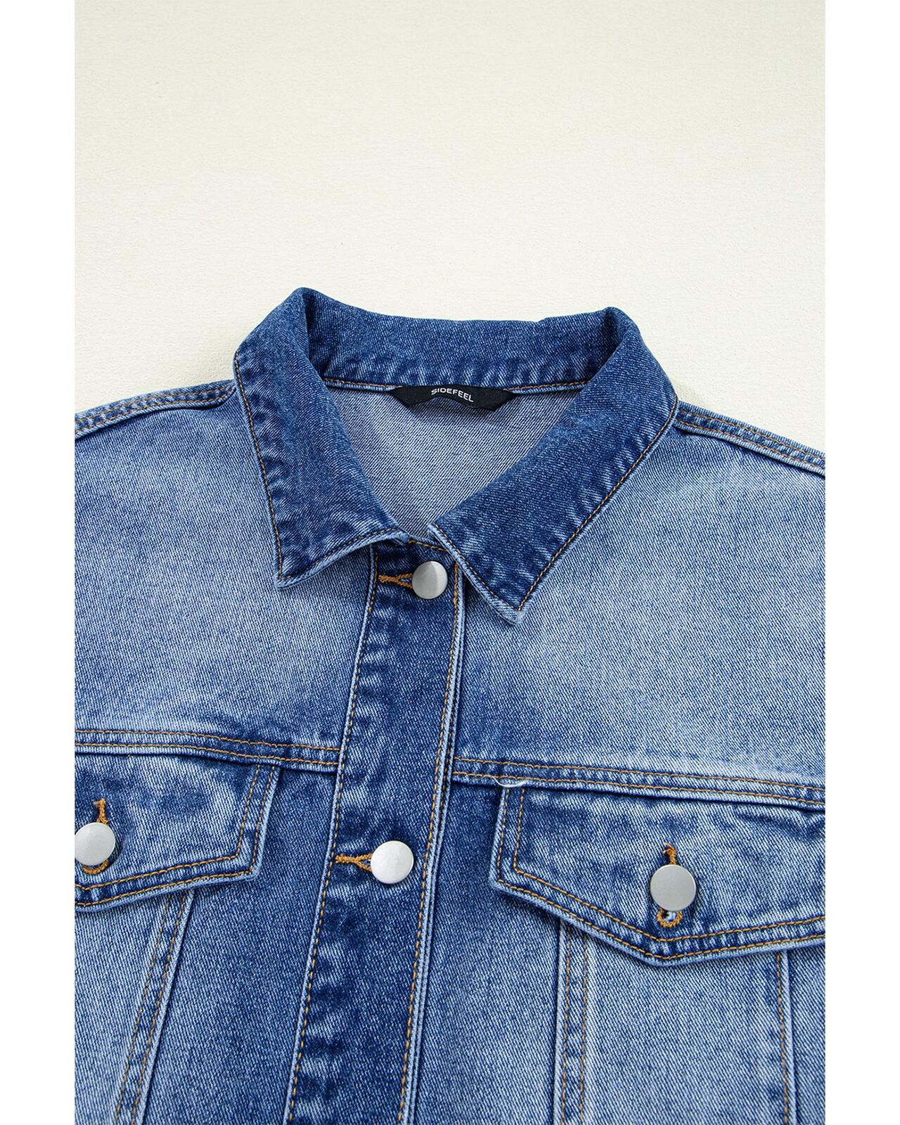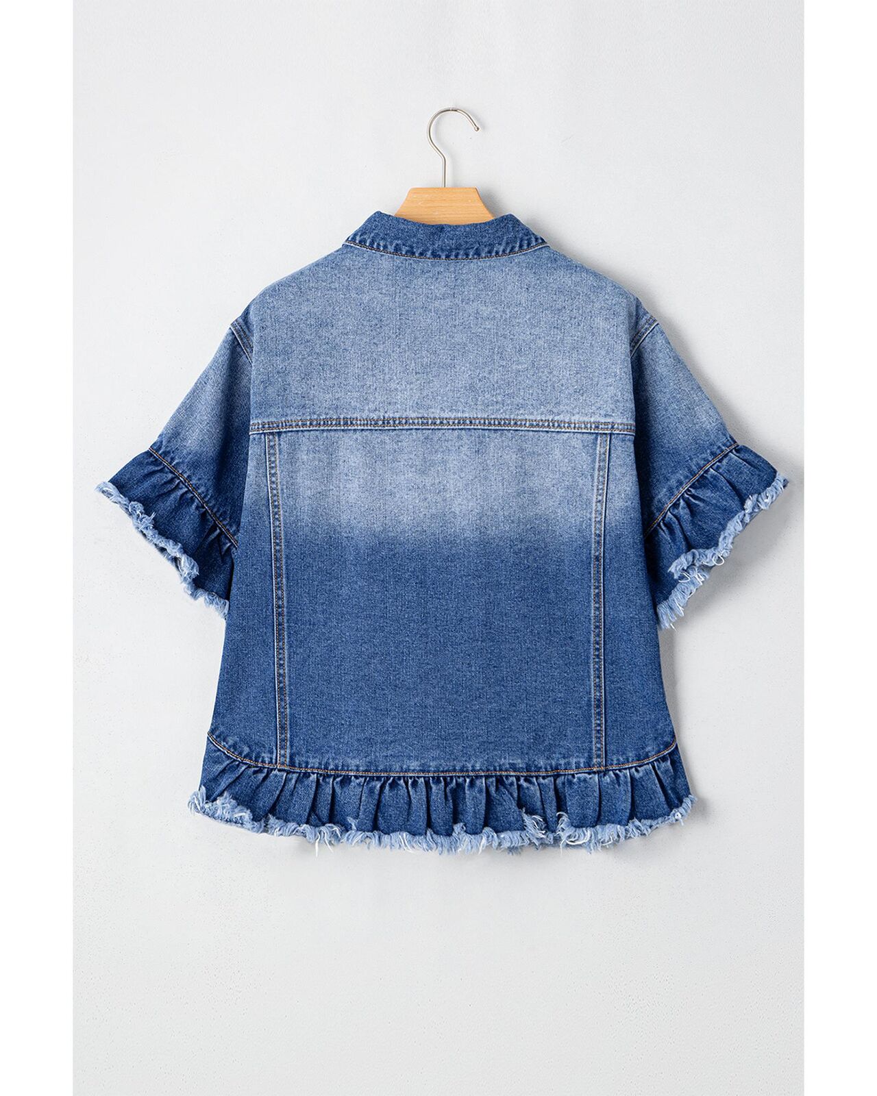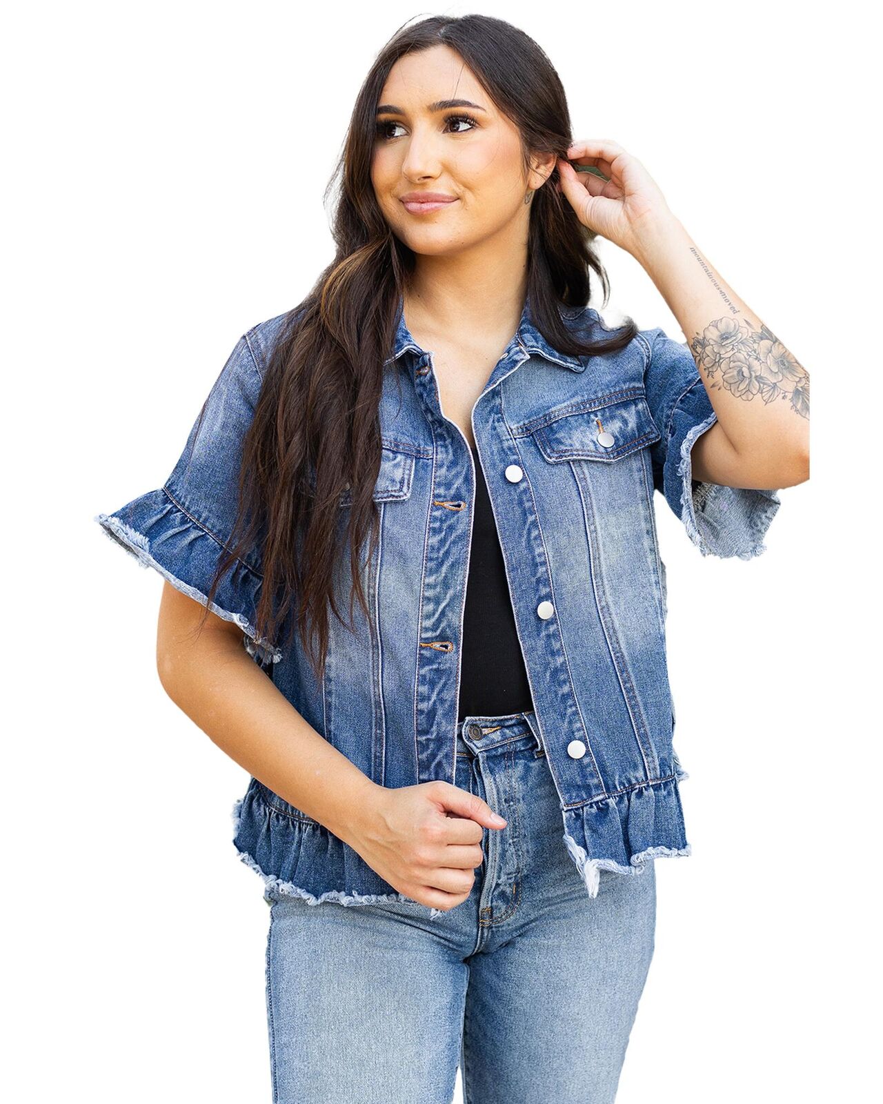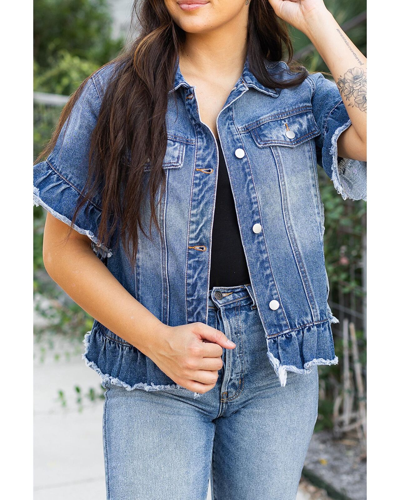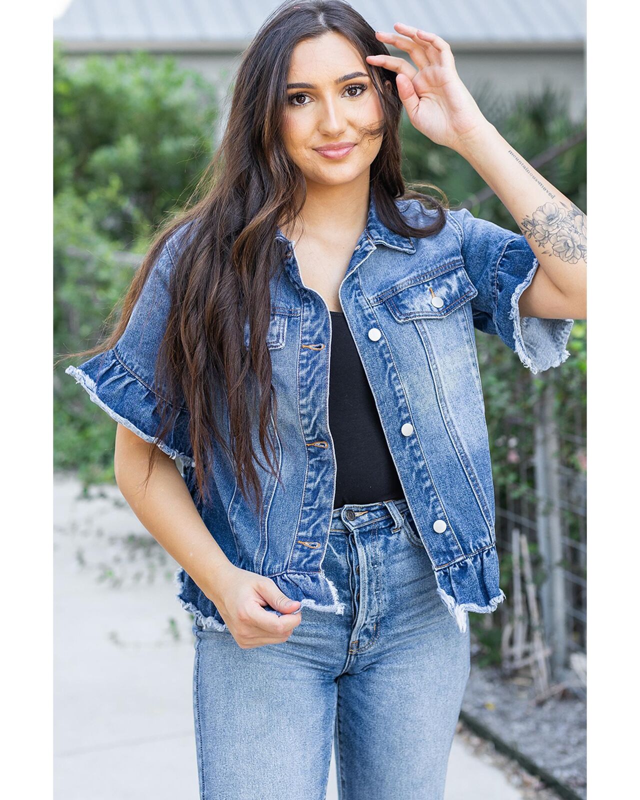 • Peacock Blue Raw Edge Ruffled Short Sleeve Denim Jacket