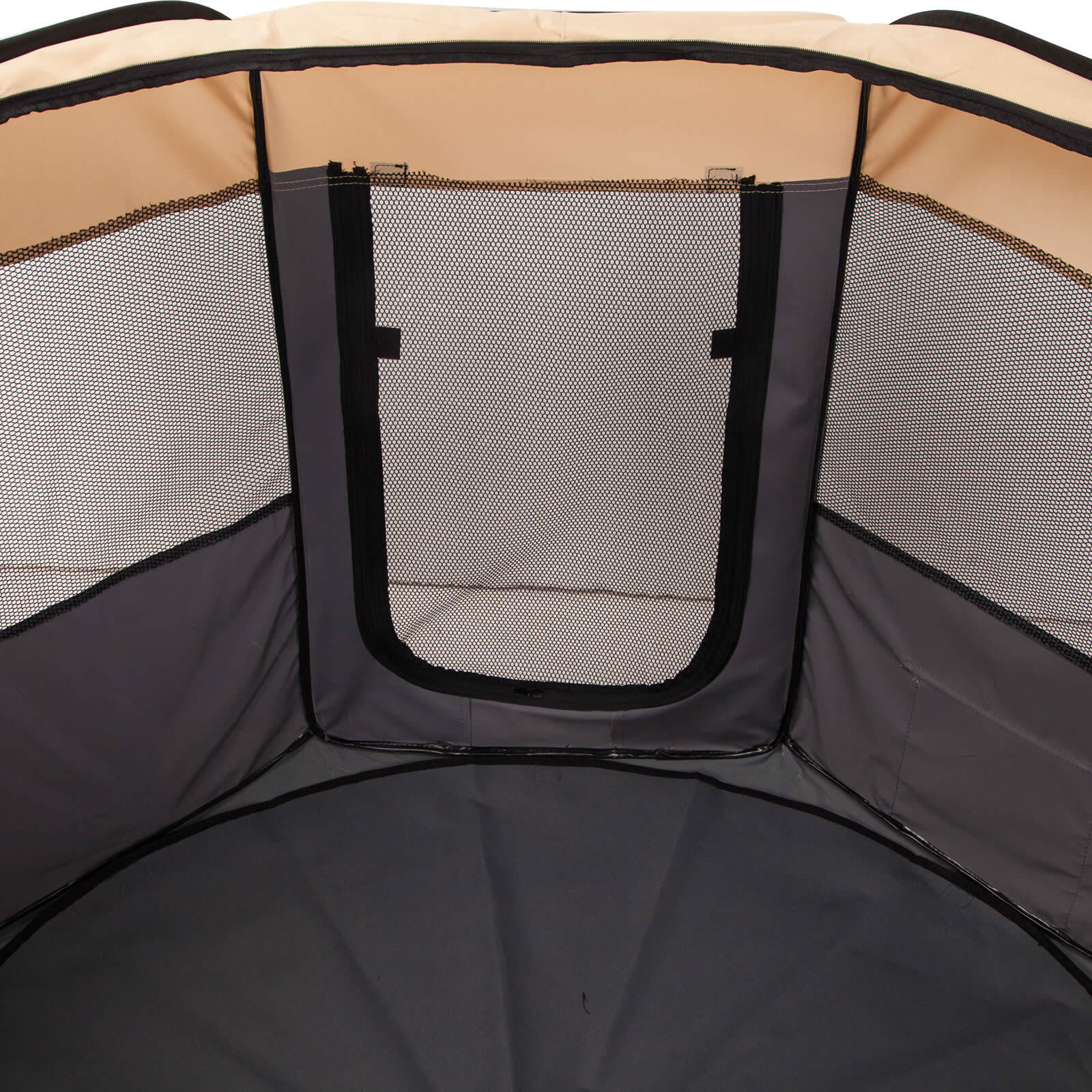 The tent consists of 8 foldable panels and strong steel frames which creates a space for your pet to stay freely inside. It is made of high-quality strong and durable PVC coated 600D polyester fabric. There are two big zip up doors so getting in and out will not be an issue. It has mesh windows in order to provide better ventilation and also allow you to monitor your pet. On the sides, you will find 2 pockets and 1 mesh pouch which are very convenient to store your pet's items. The roof is removable so your pet and you can stay comfortably inside the playpen so you can play with your pet as well!