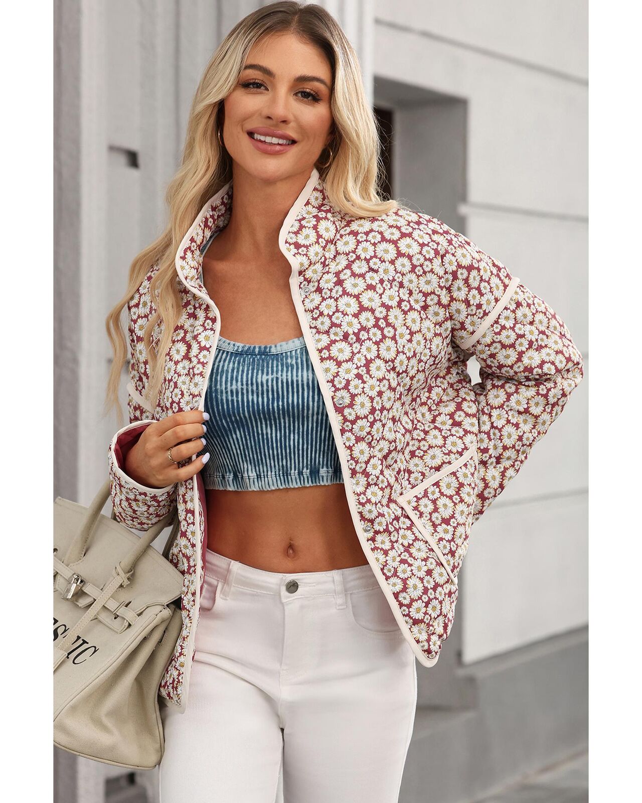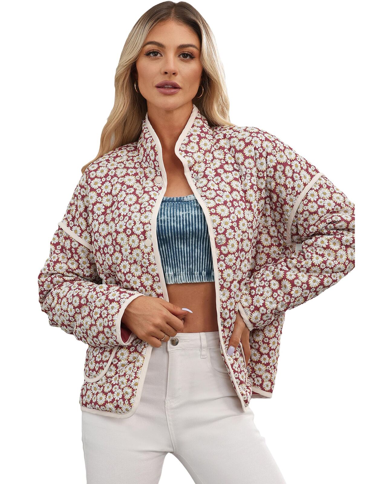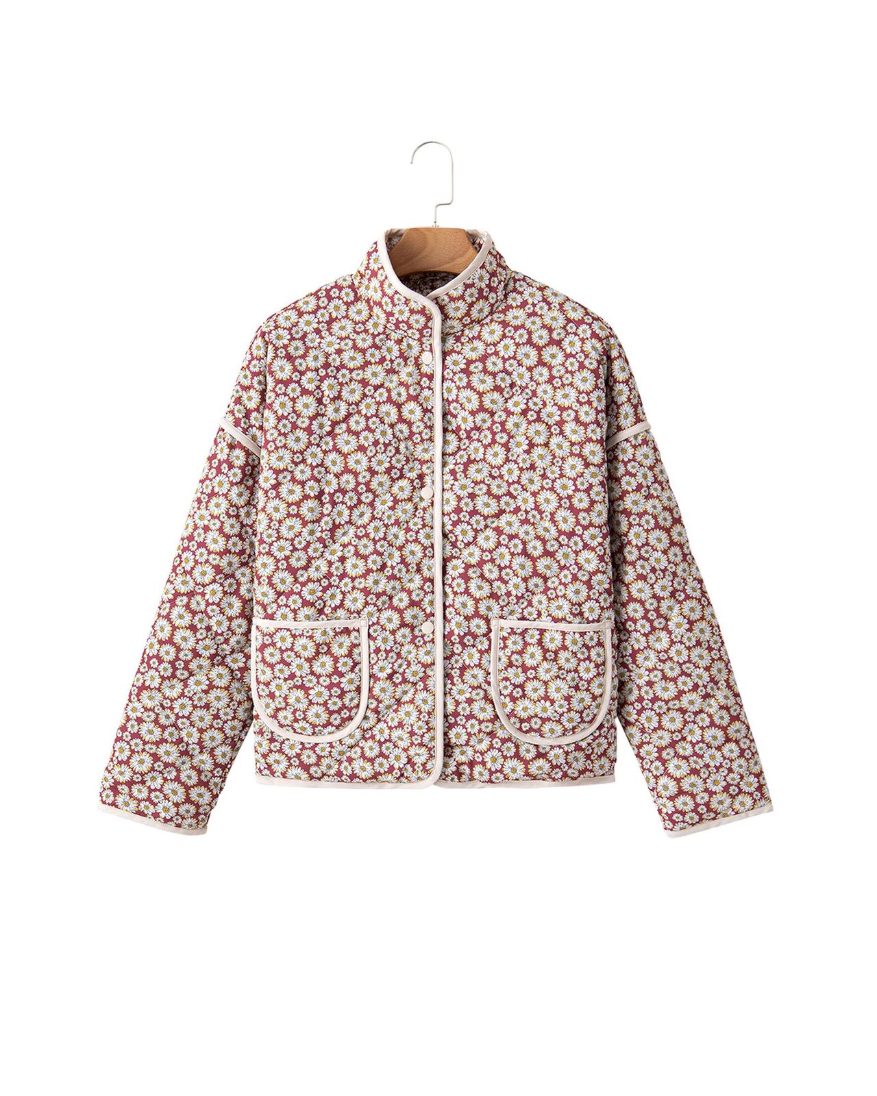 • Pink Floral Print Contrast Edge Pocketed Stand Neck Jacket