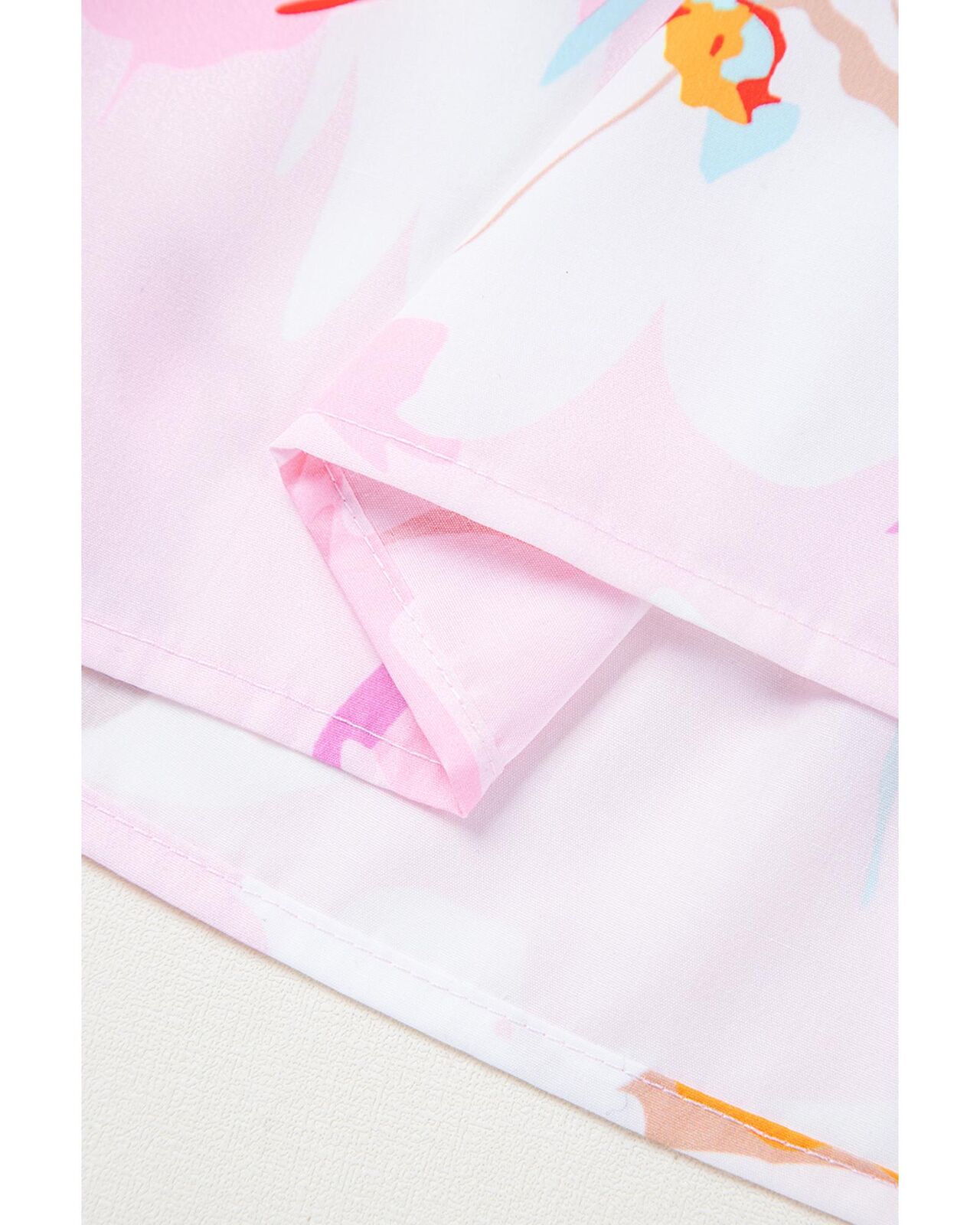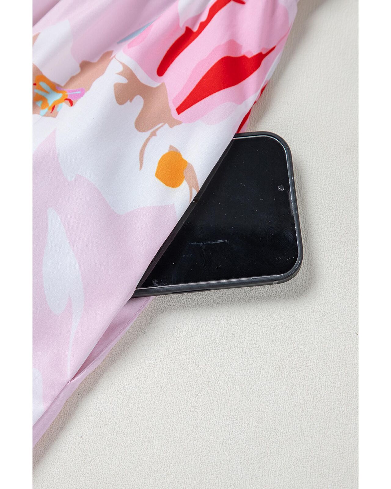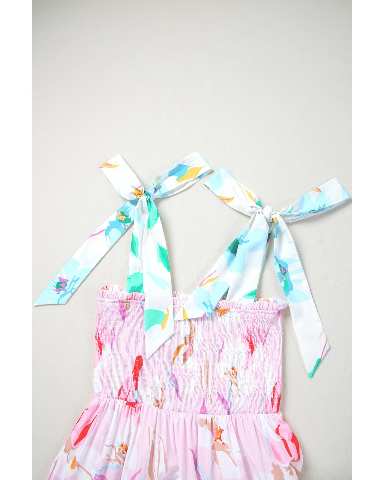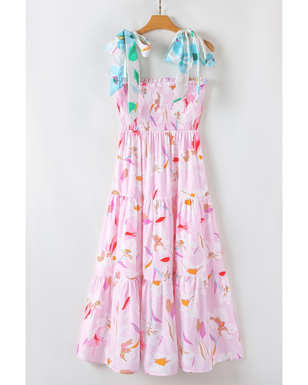 • Pink Floral Print Knotted Shoulder Smocked Maxi Dress