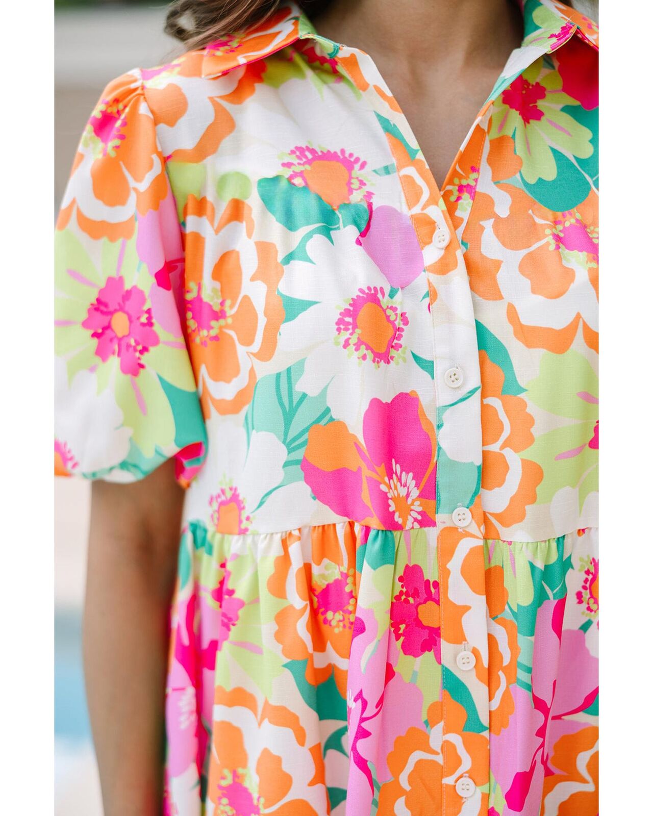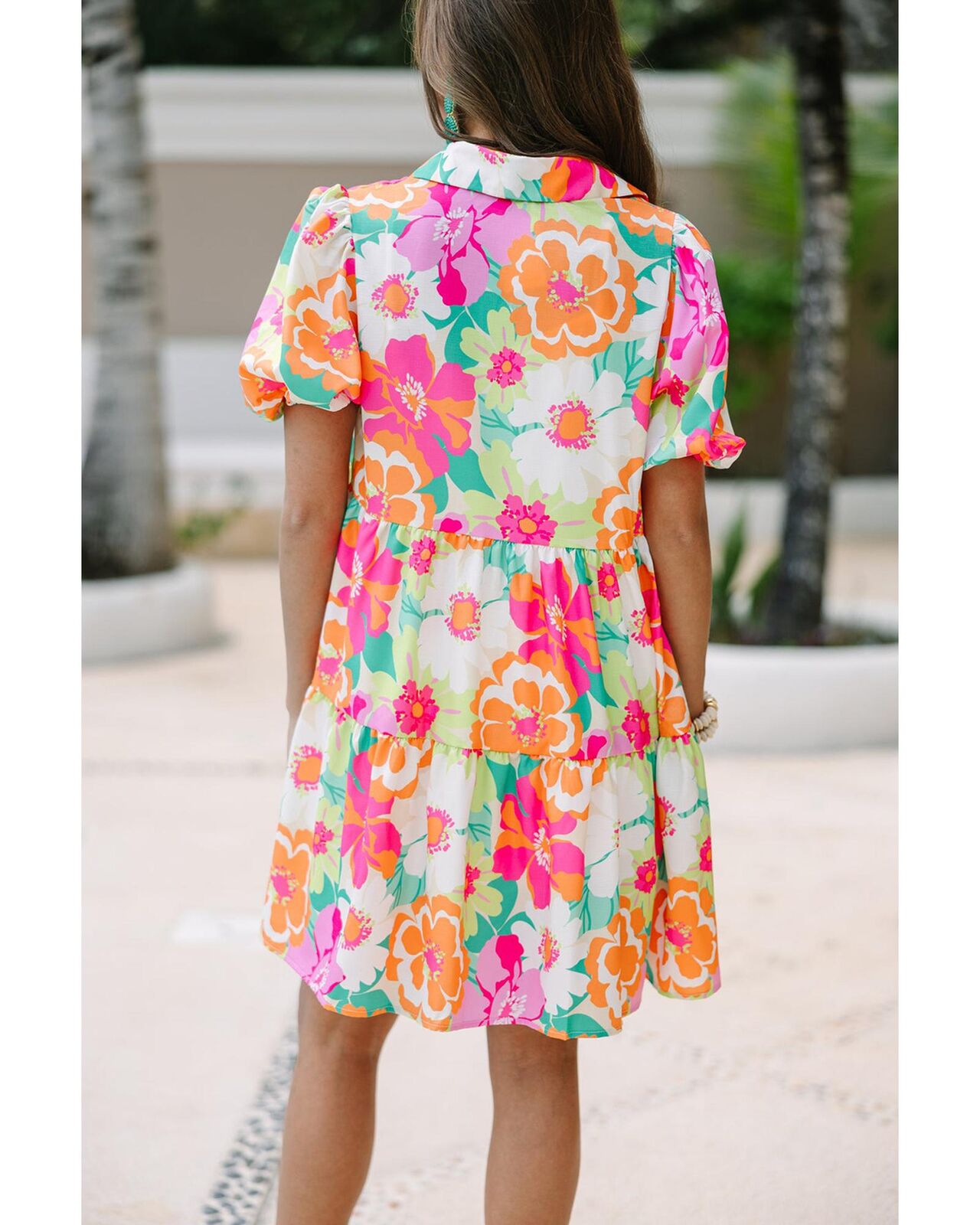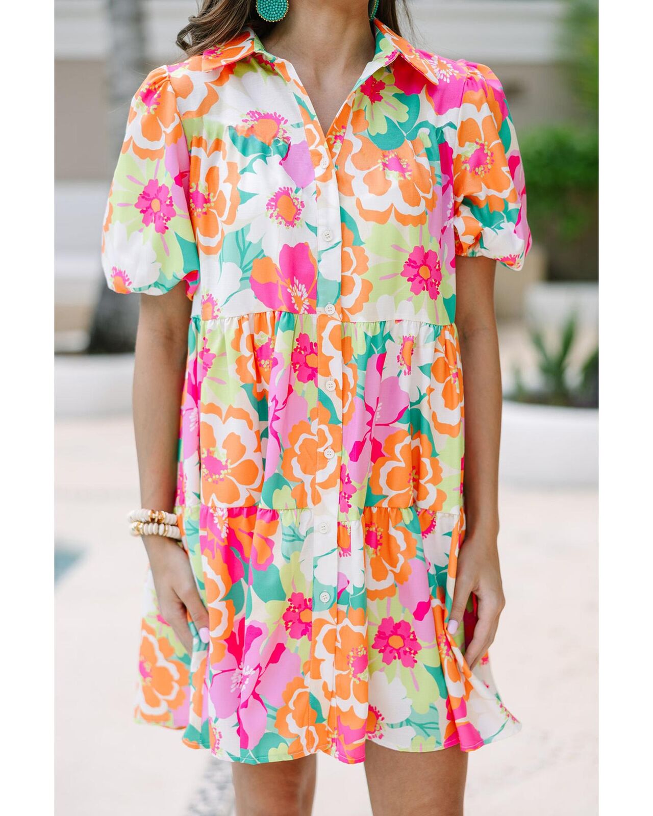 • Pink Floral Puff Sleeve Collar Buttoned Babydoll Dress