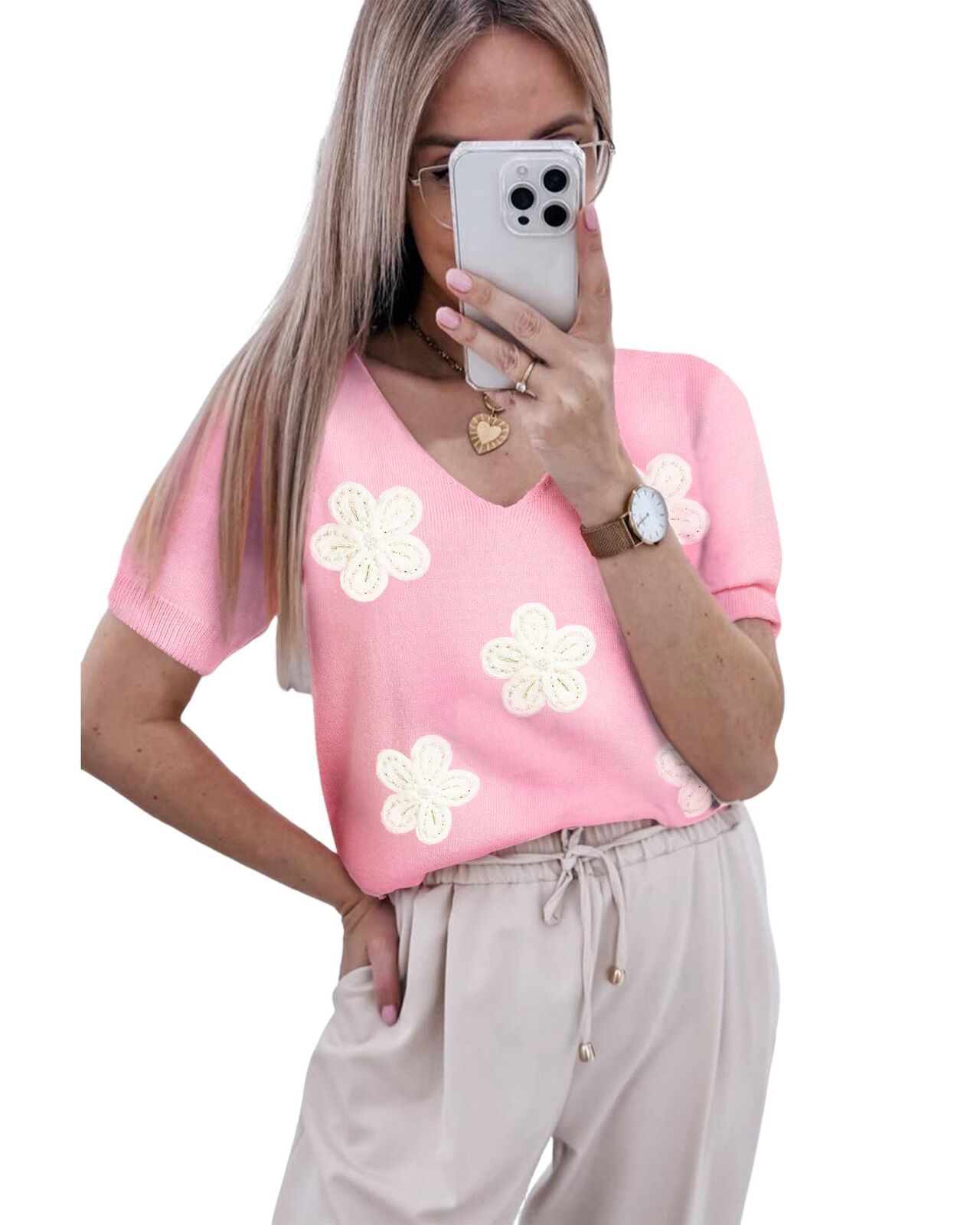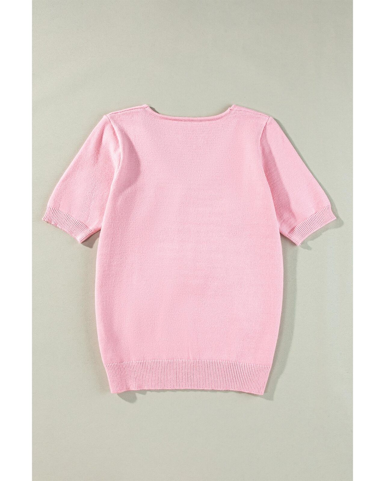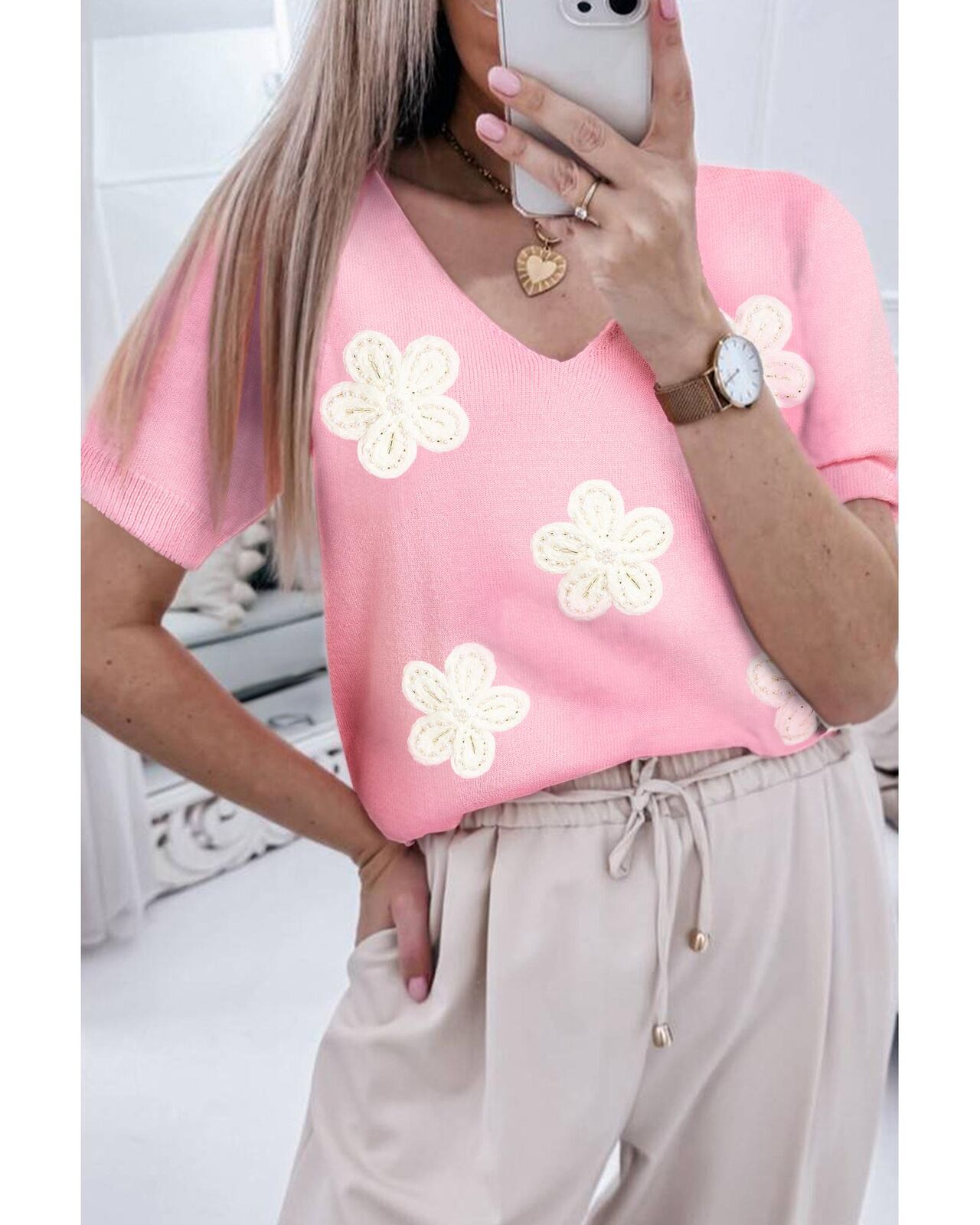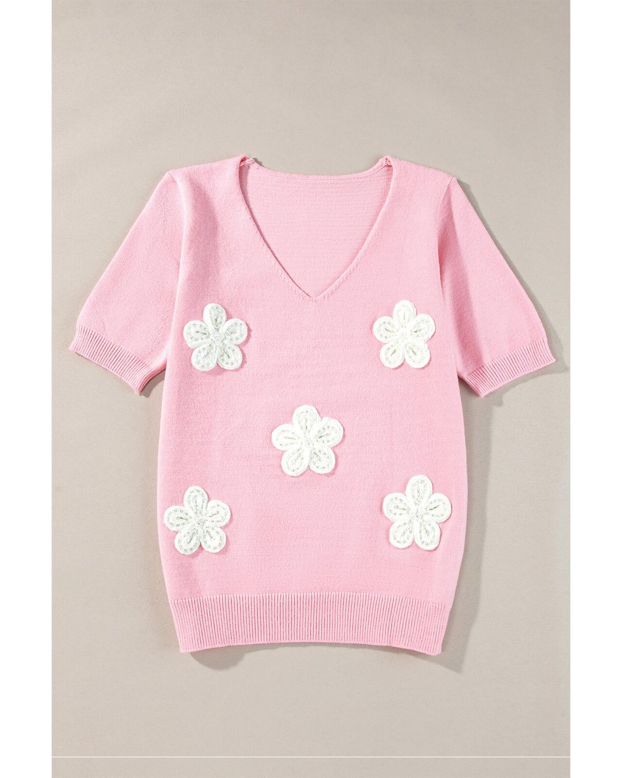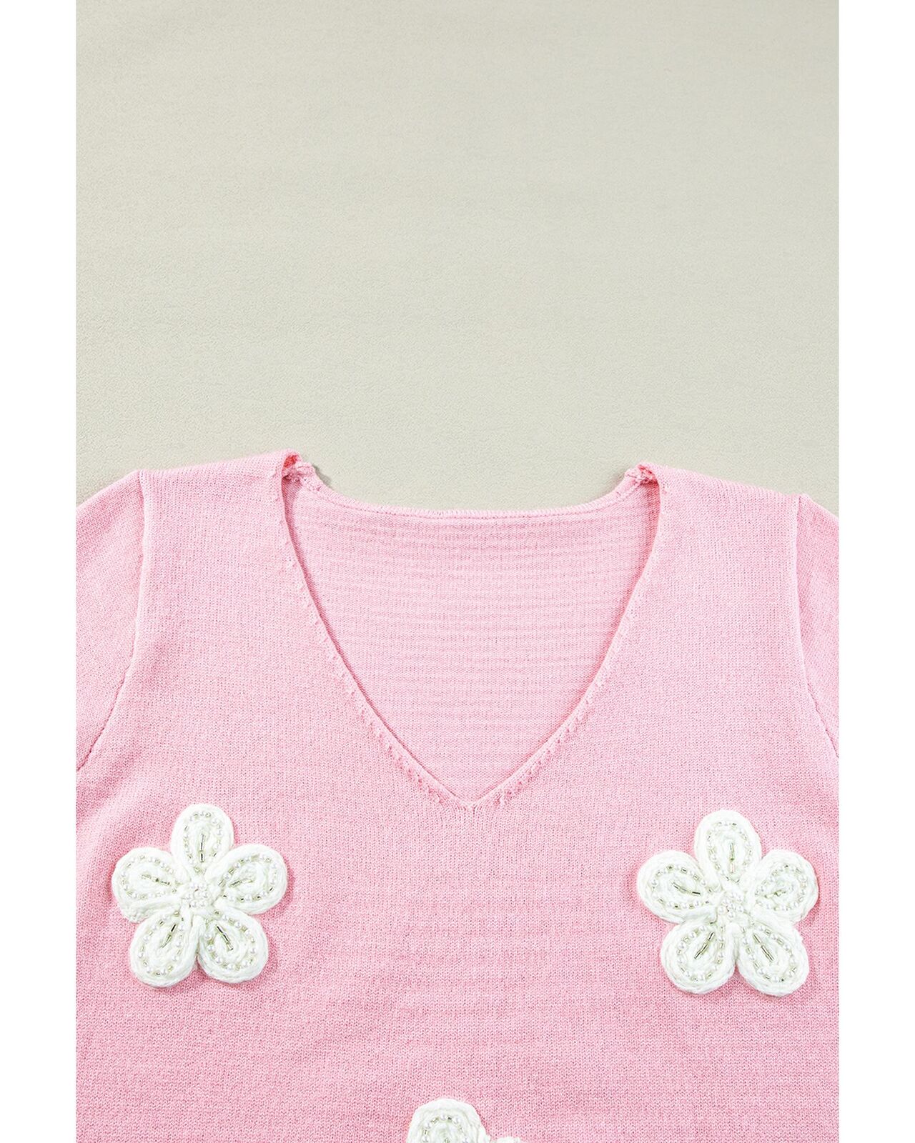 • Pink Flower Crochet V Neck Short Sleeve Sweater