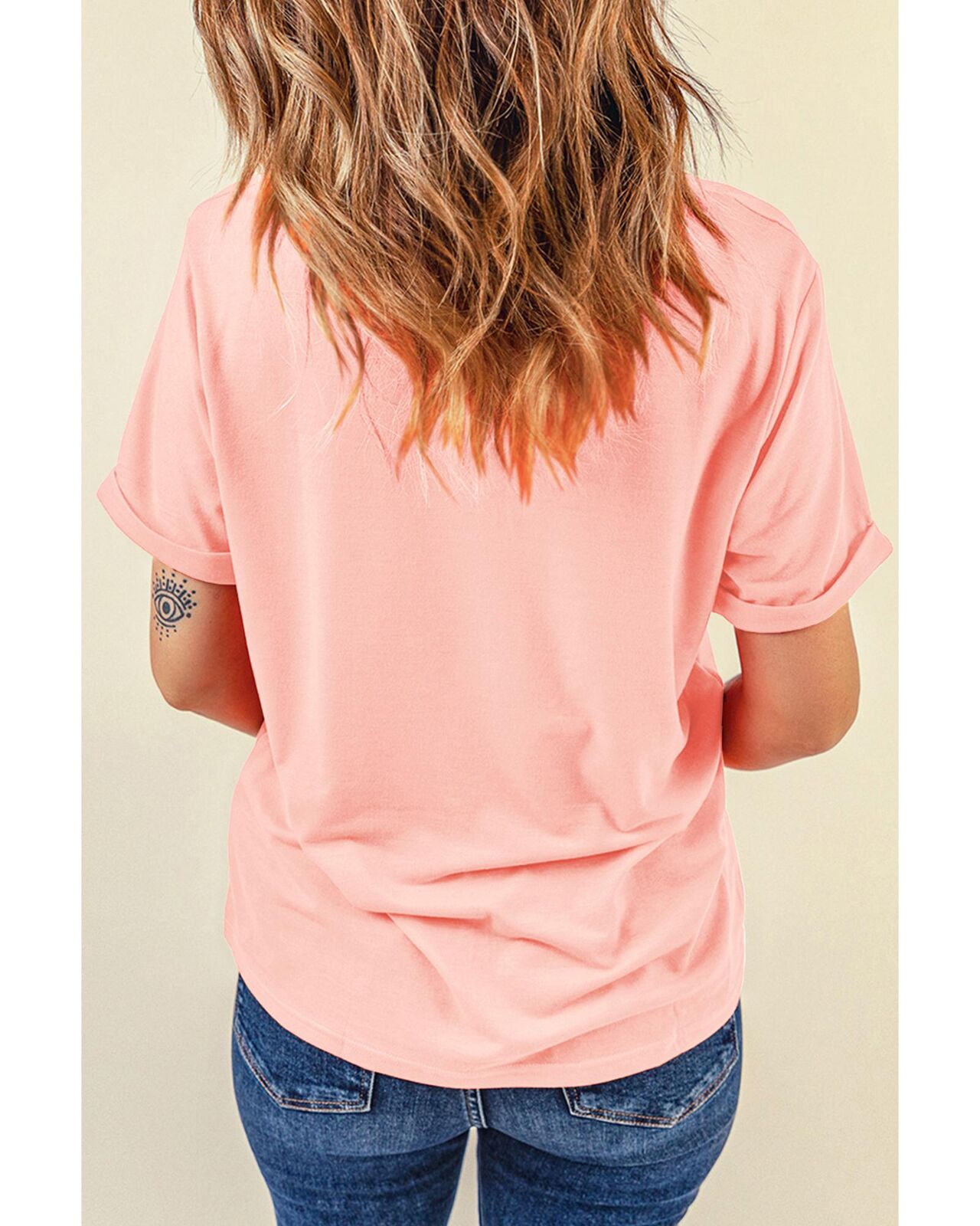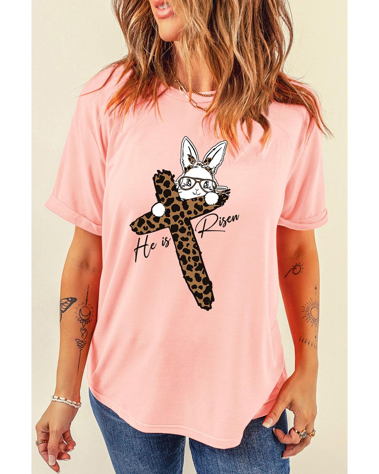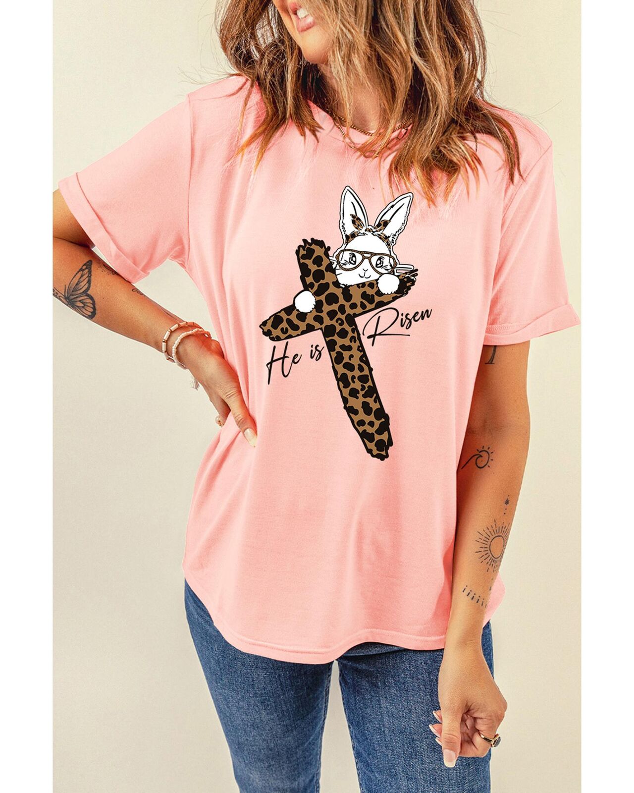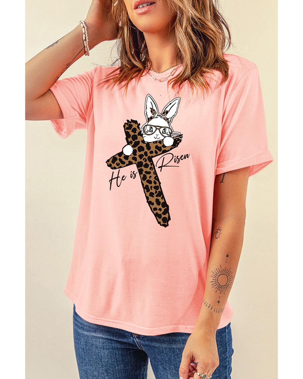 • Womens Pink He is Risen Easter Bunny Leopard Cross Graphic Tee