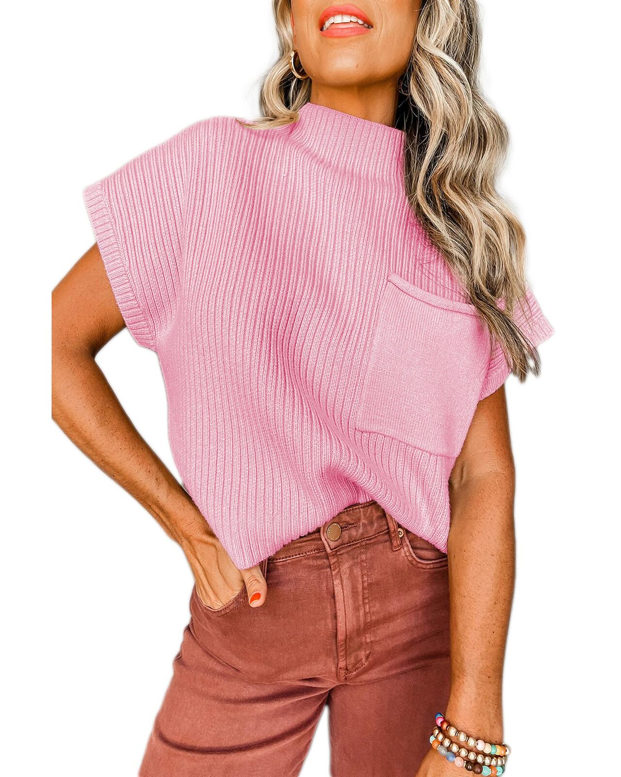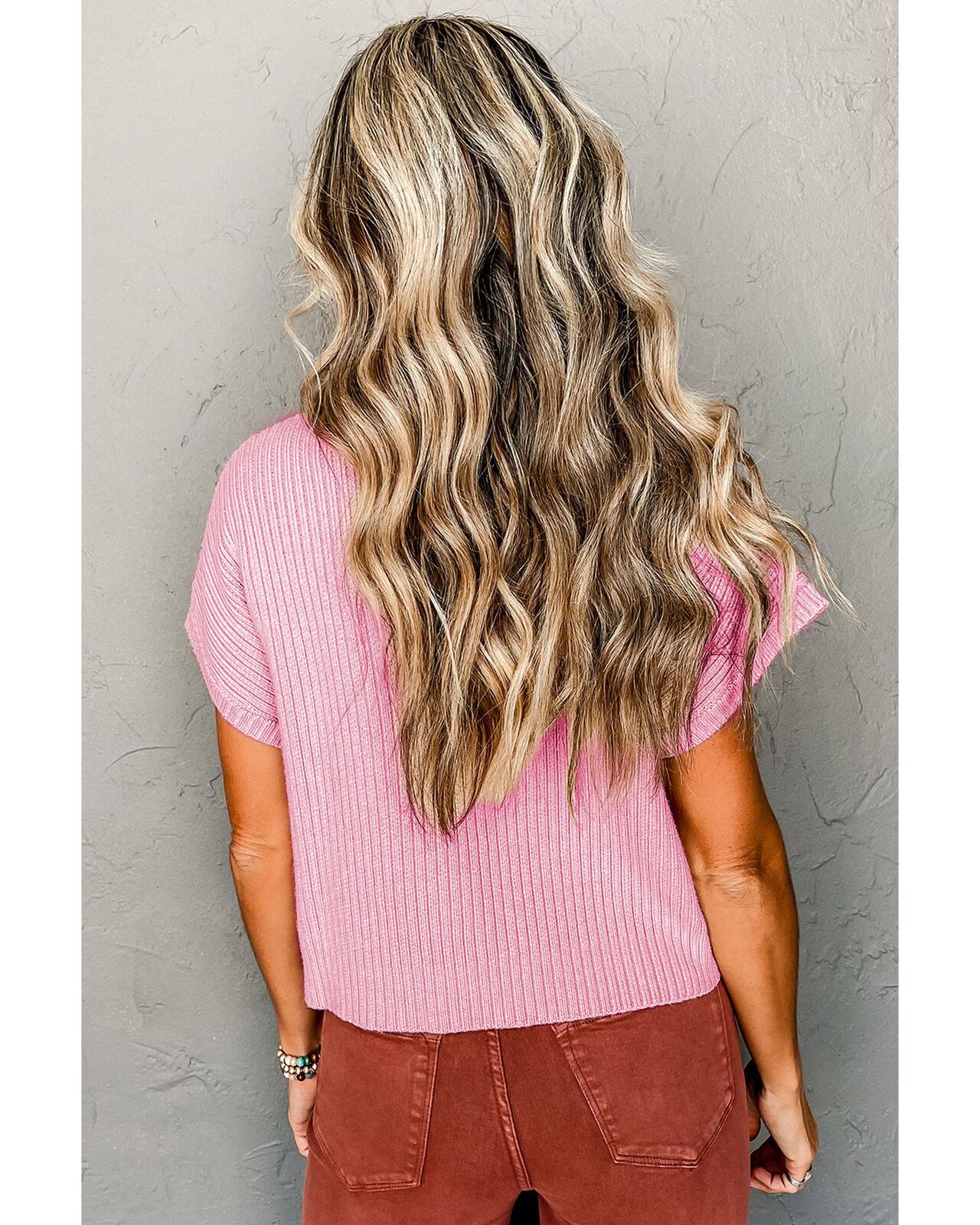 • Pink Patch Pocket Ribbed Knit Short Sleeve Sweater