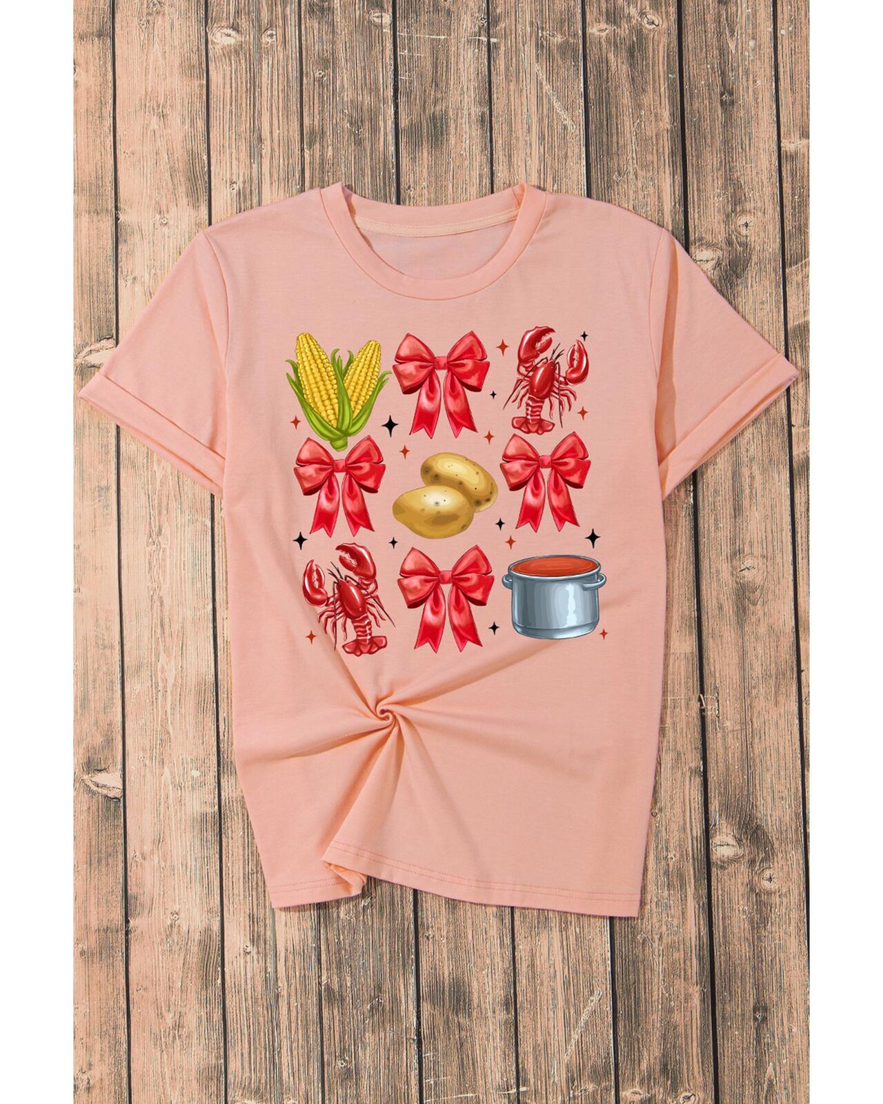 • Pink Summer Food Bow Crawfish Printed T Shirt