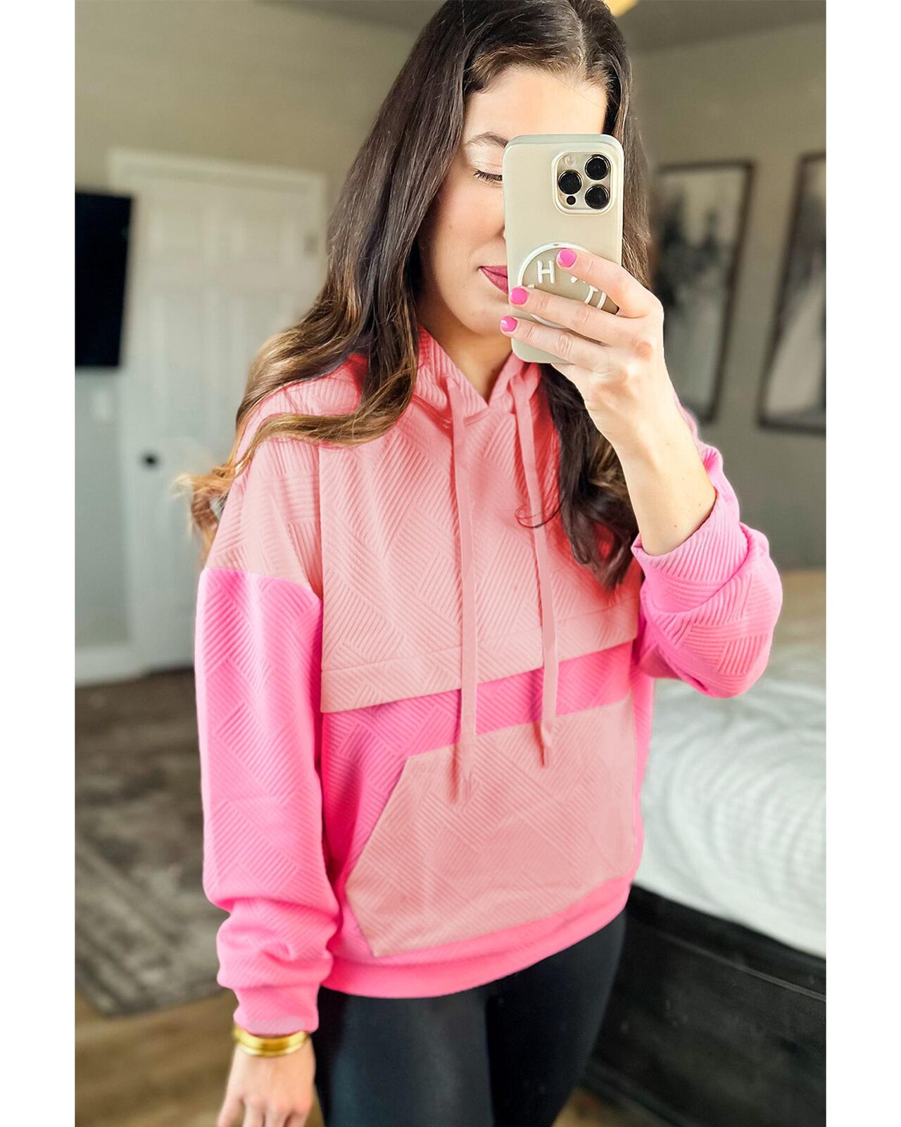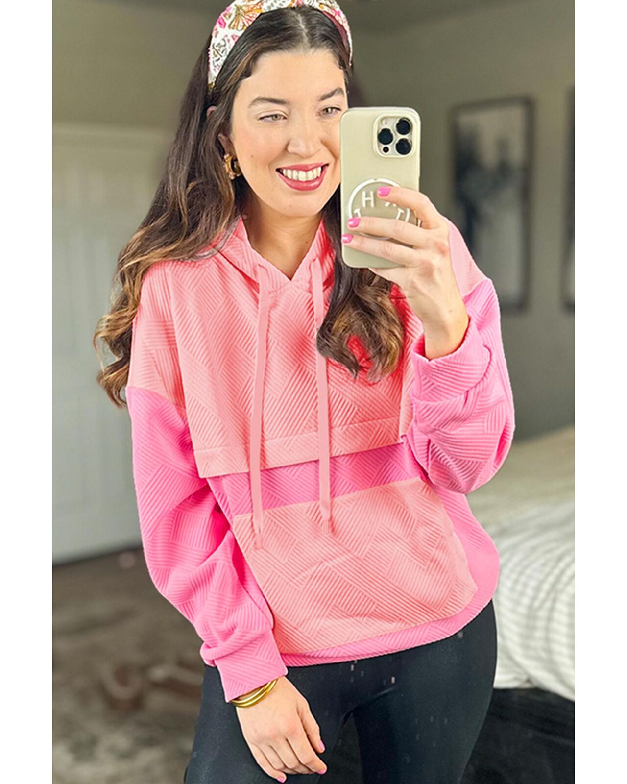 • Pink Textured Color Block Kangaroo Pocket Drop Shoulder Hoodie