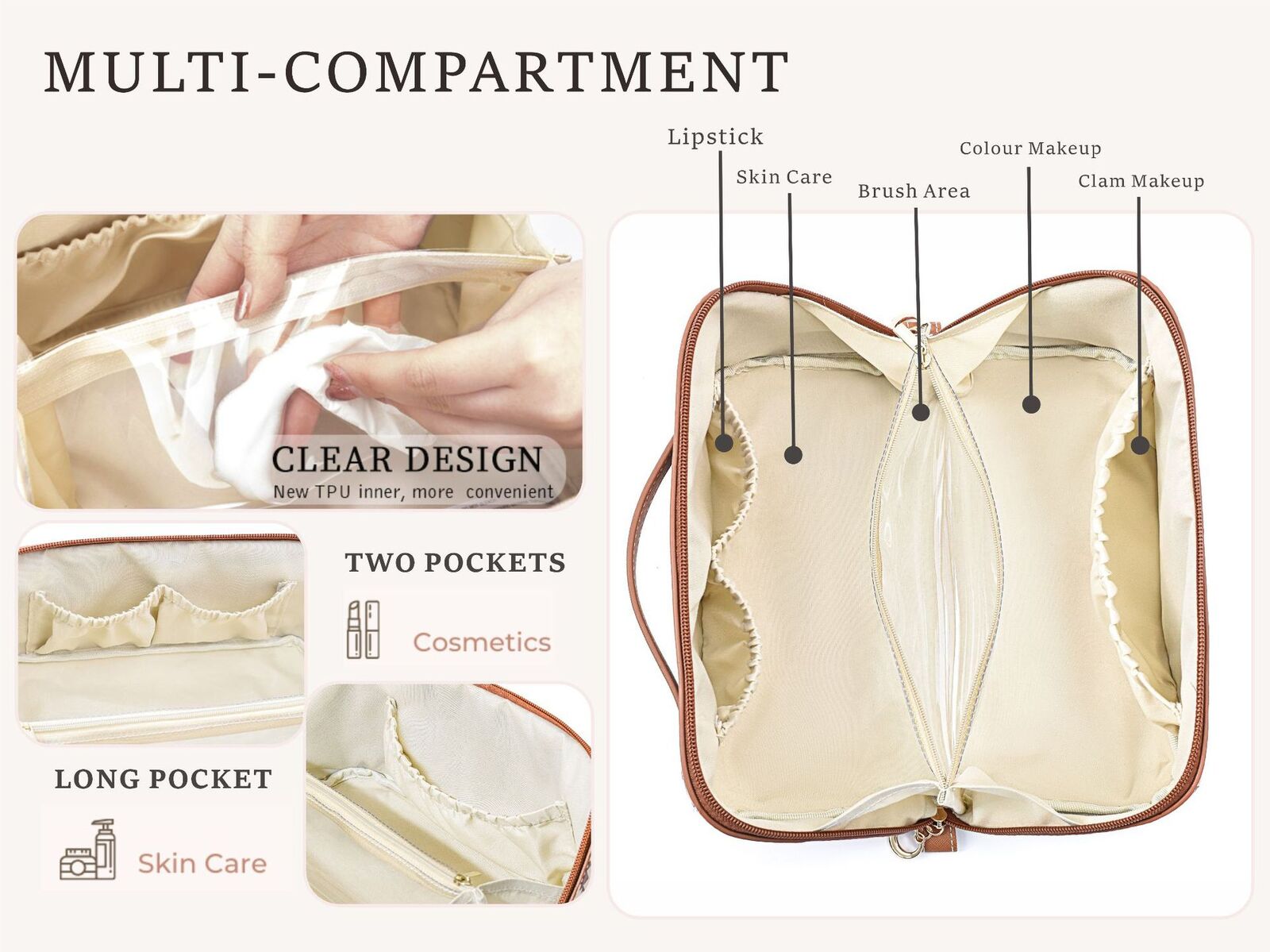 - Spacious Design: Large interior space with multiple compartments to store makeup, skincare, and toiletries.