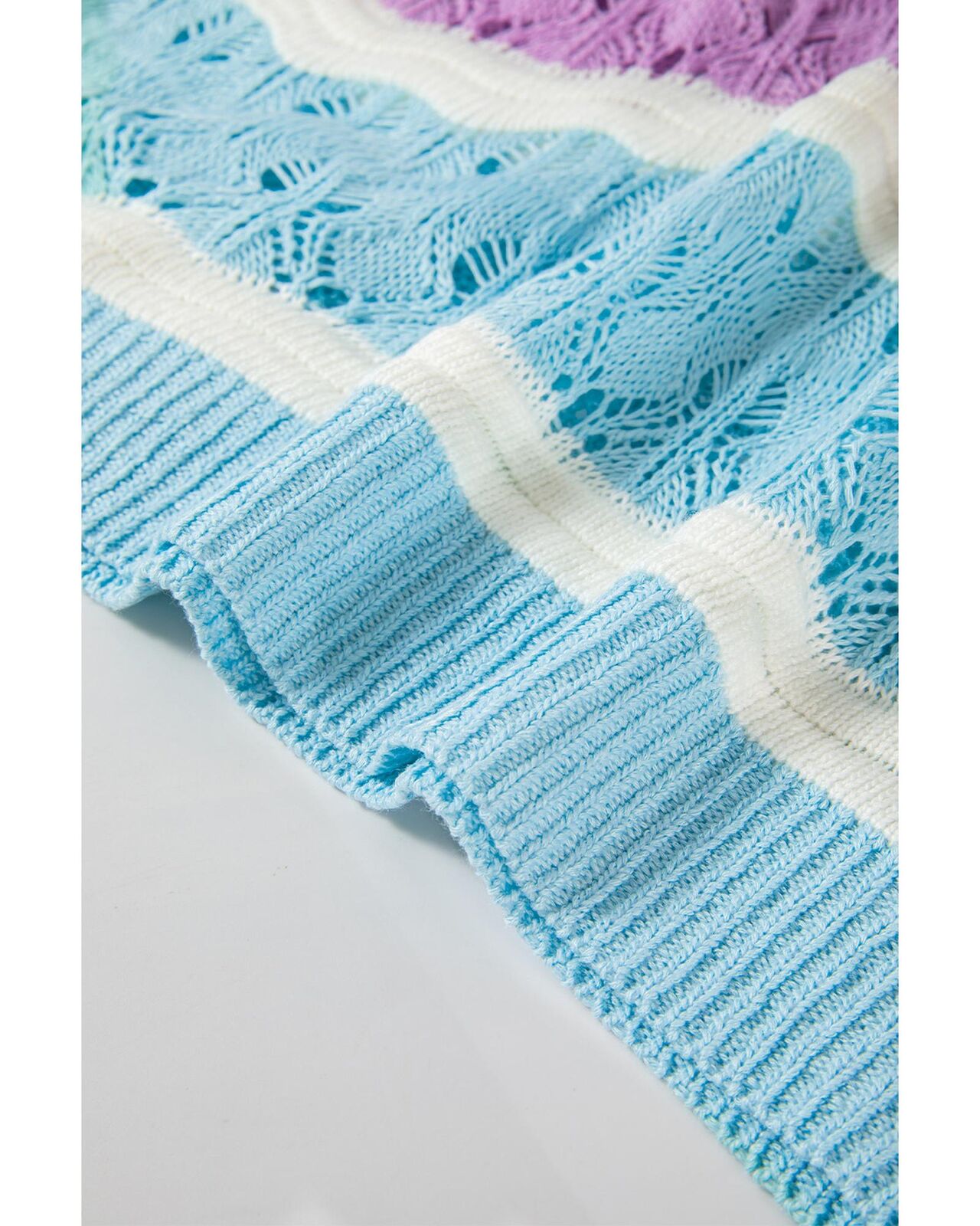 • Purple Stripe Color Block Hollow Out Crochet Half Sleeve Sweater