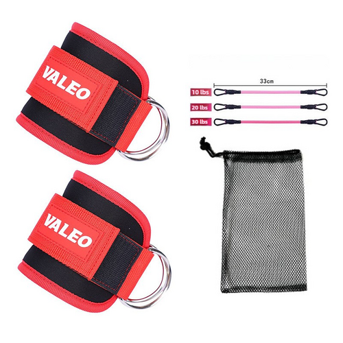 Red Set (2 Ankle Straps + 3 elastic ropes + 1 mesh bag) Adjustable Ankle Straps for Leg and Glute Training - EVA Padded Gym Foot Straps