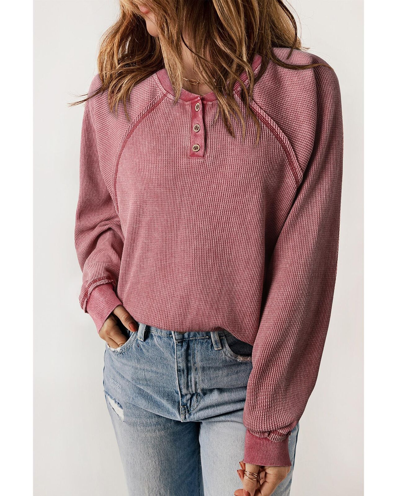 • Red Waffle Knit Raglan Sleeve Henley Sweatshirt