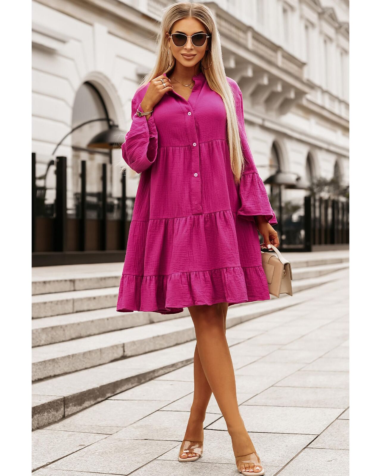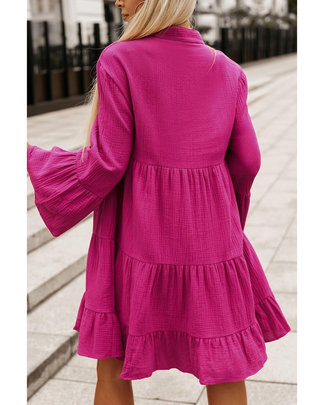 • Rose Crinkled Tiered Split Neck Shirt Dress