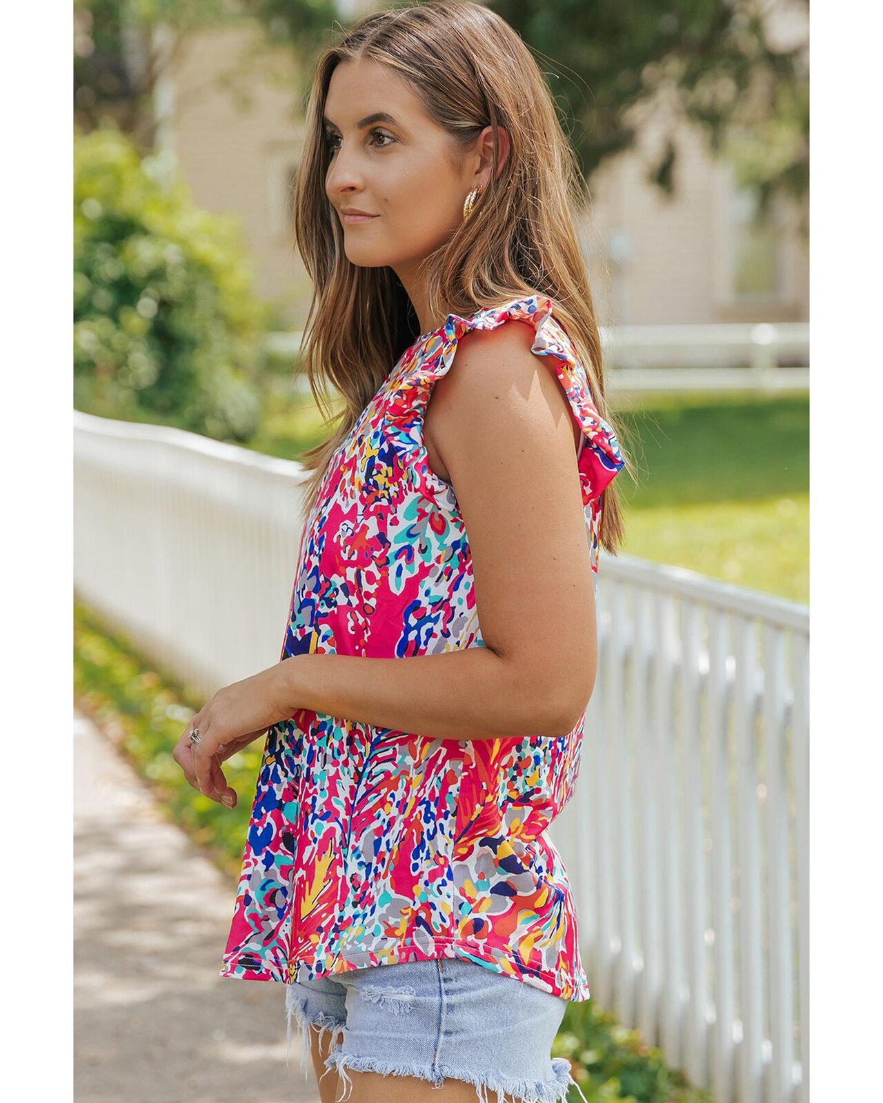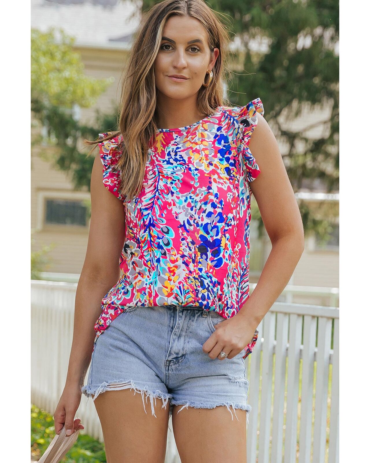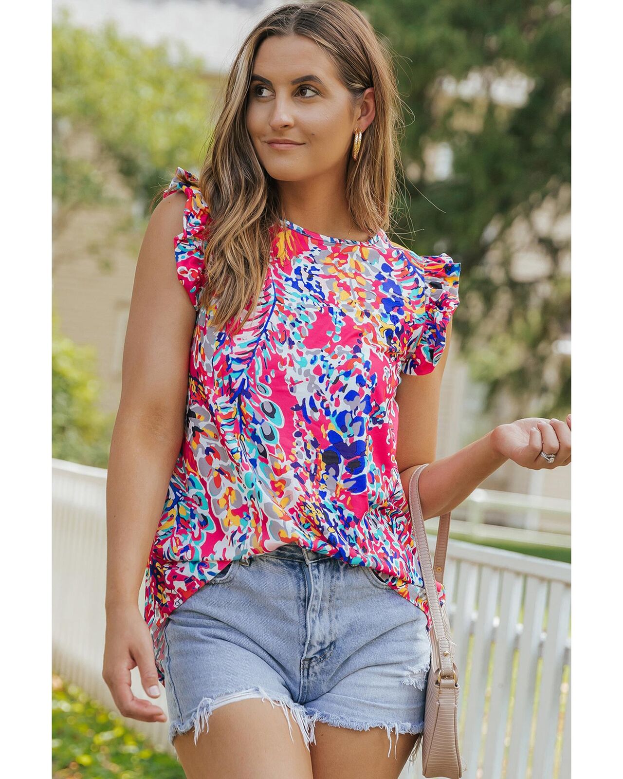 • Gorgeous tank top featuring a blooming floral print and flattering ruffle sleeves