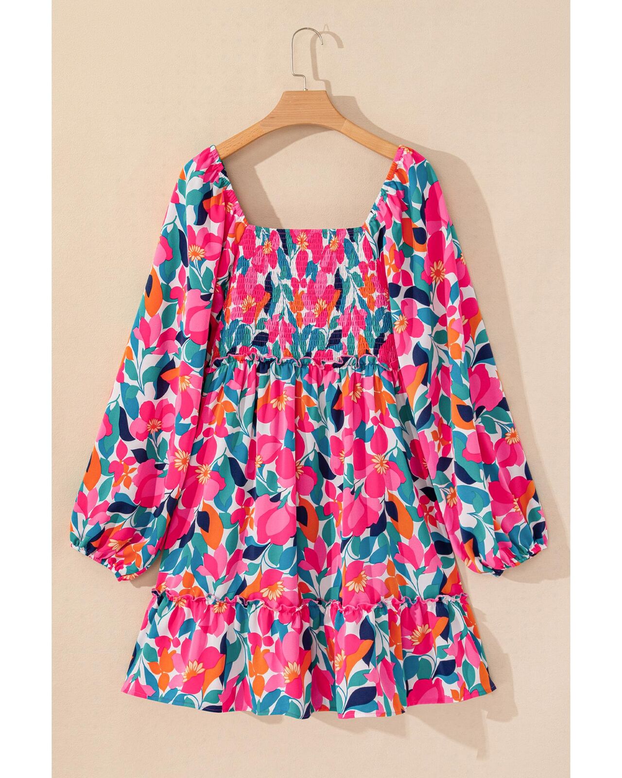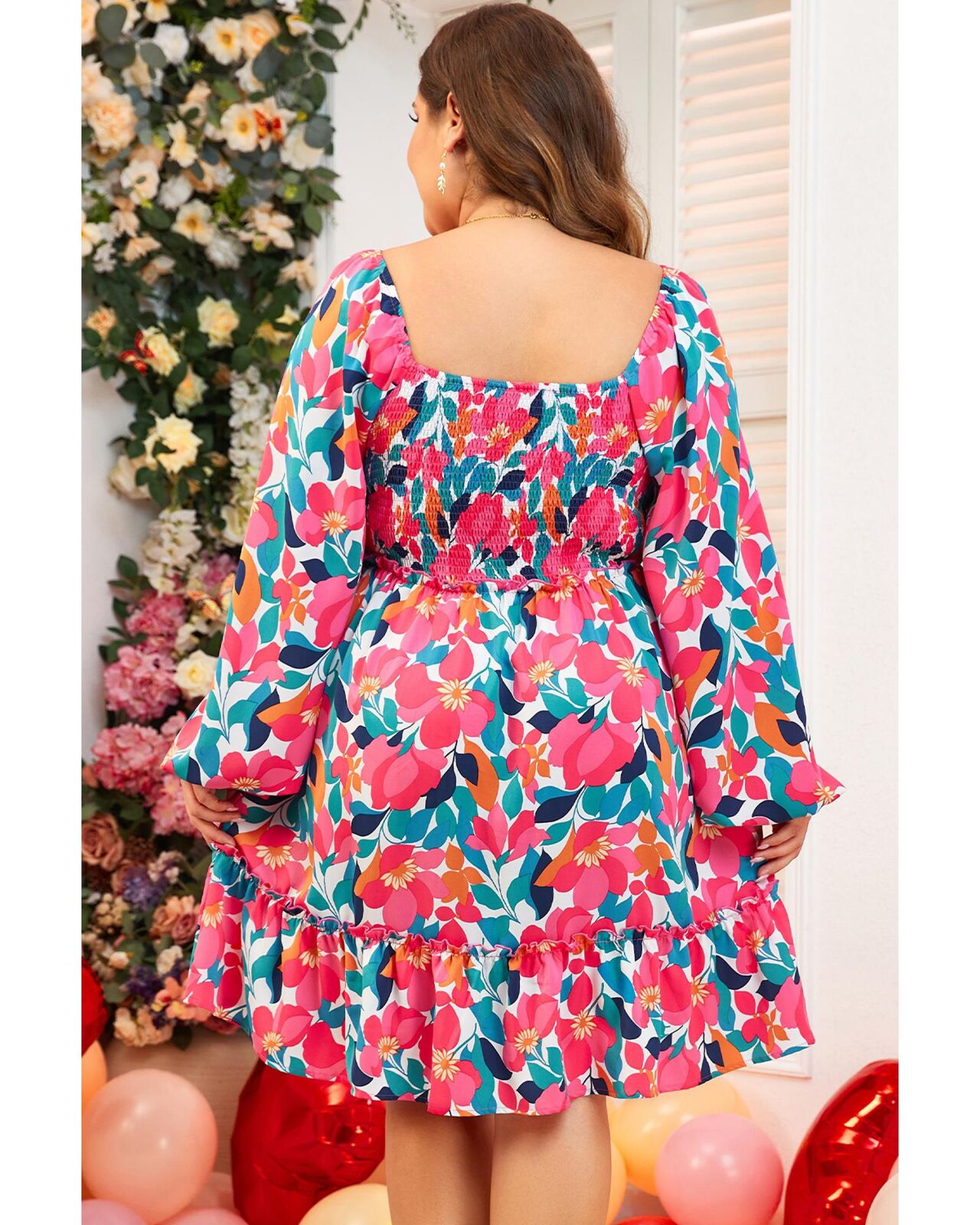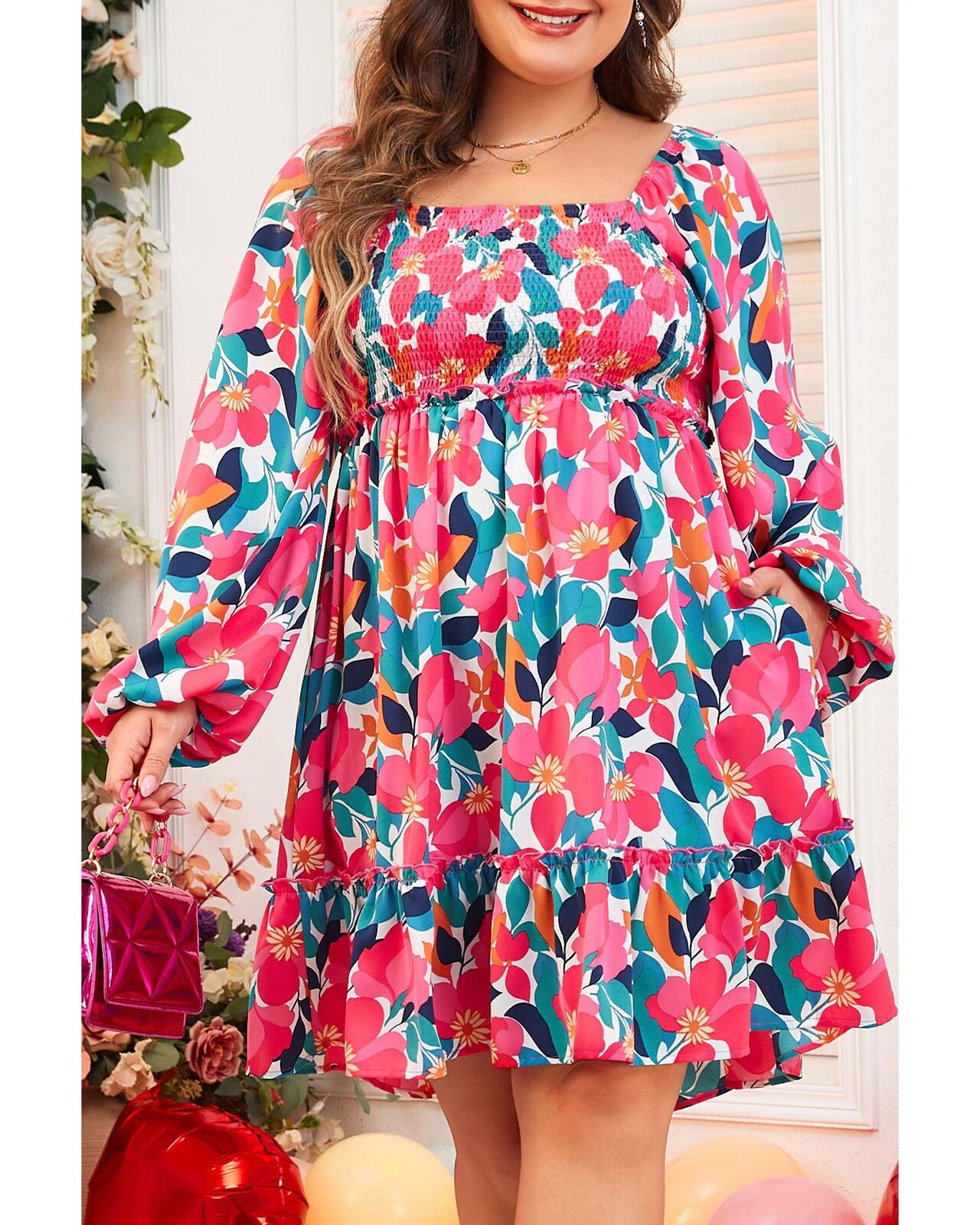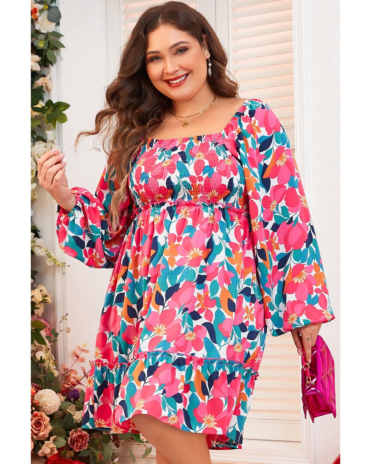 • Rose Flower Print Smocked Square Neck Plus Size Dress