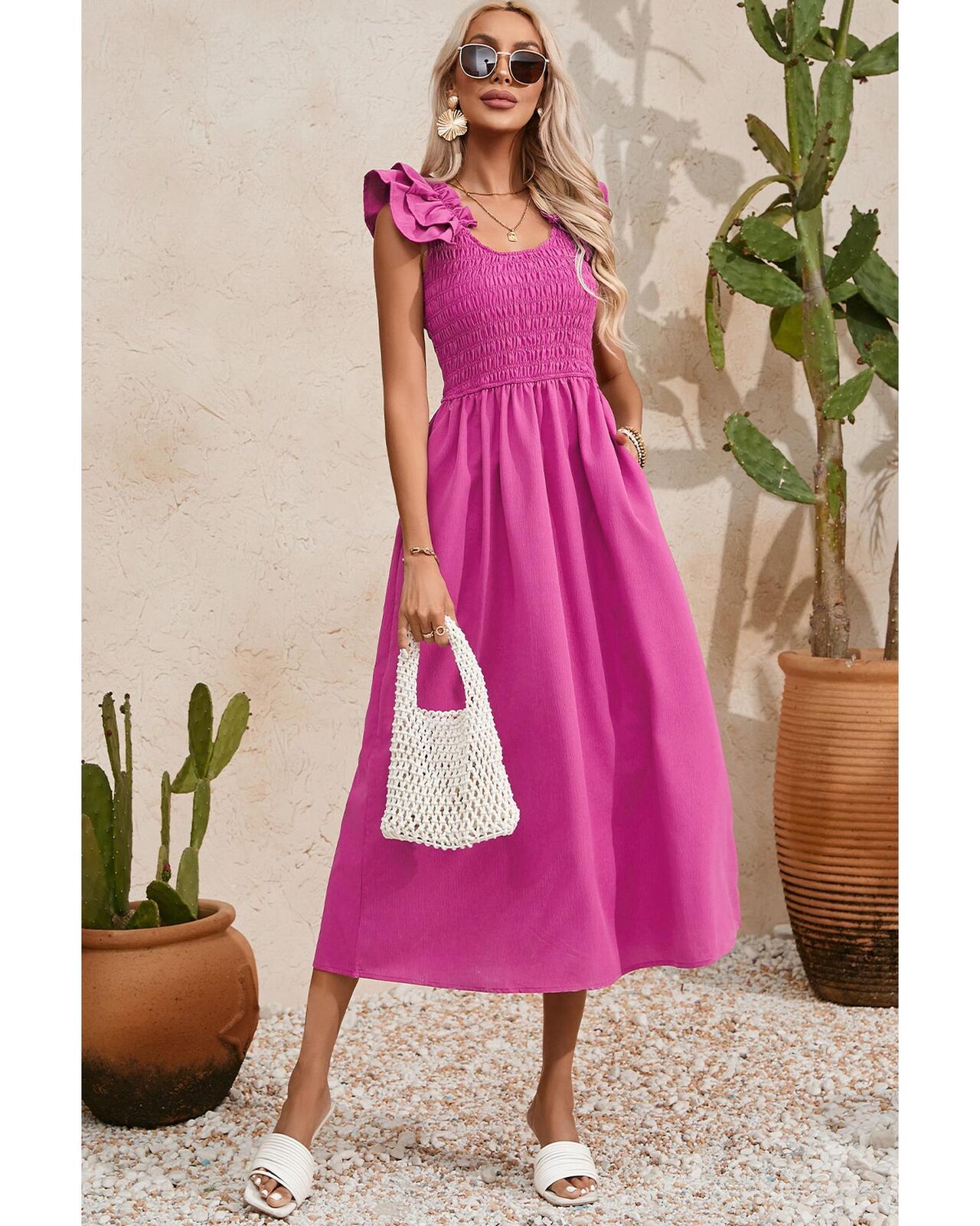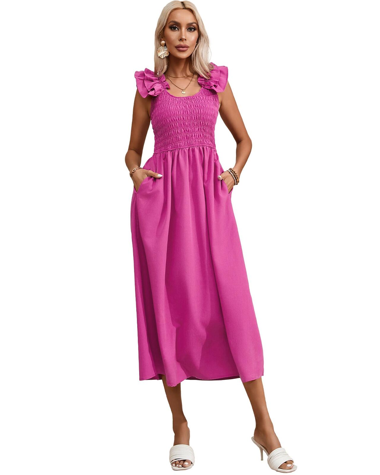 • Rose Red Solid Color Ruffled Straps Smocked Ruched Maxi Dress
