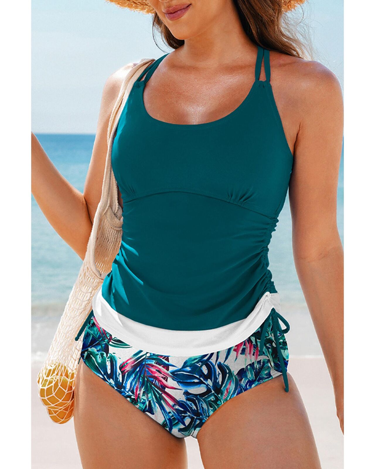 • Strappy back and drawstring sides