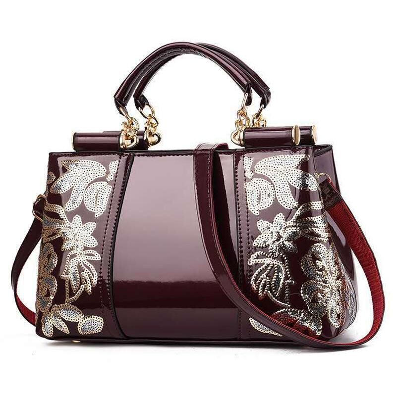 Shiny Leather Handbag with Single-sided Embroidery - Red Wine