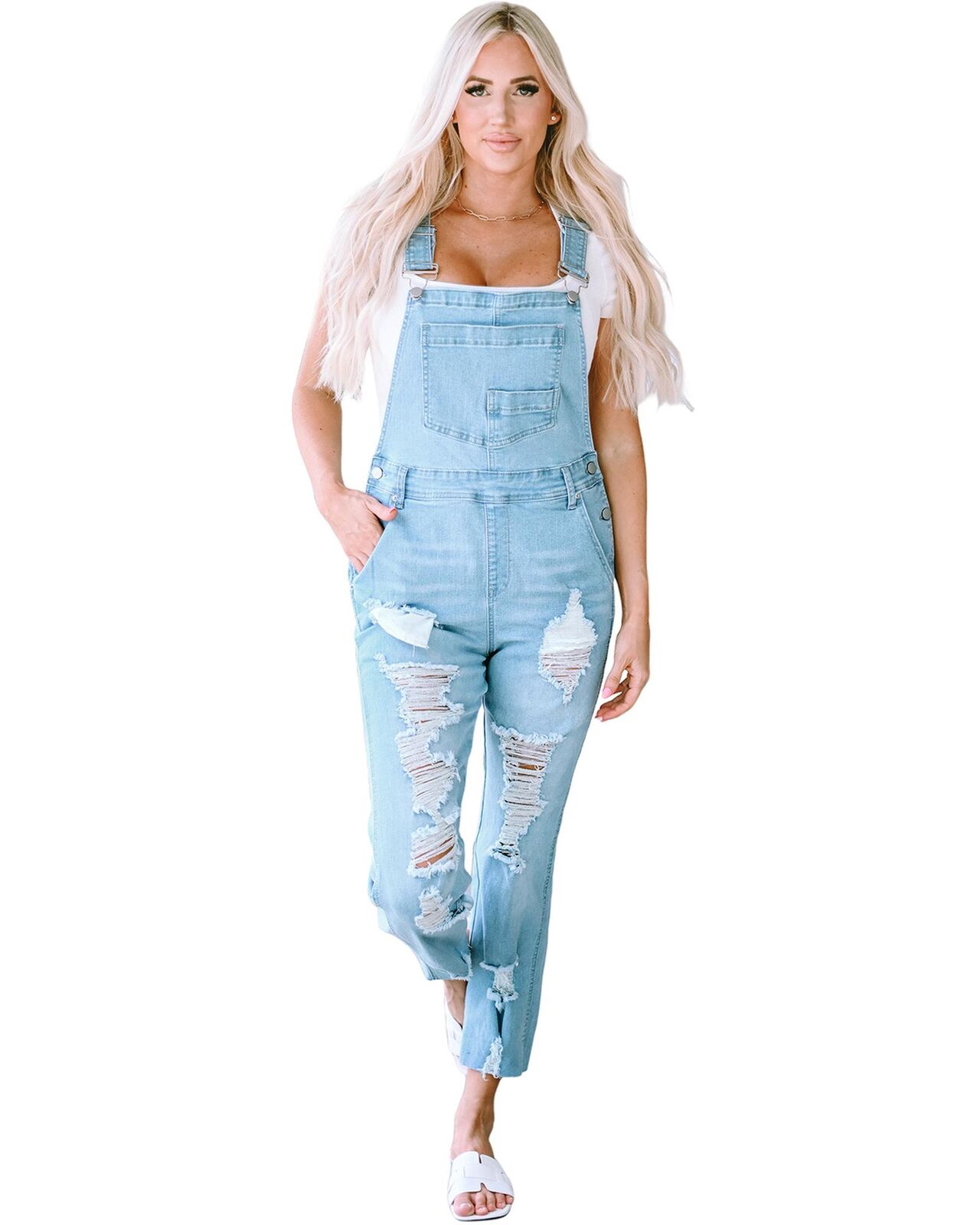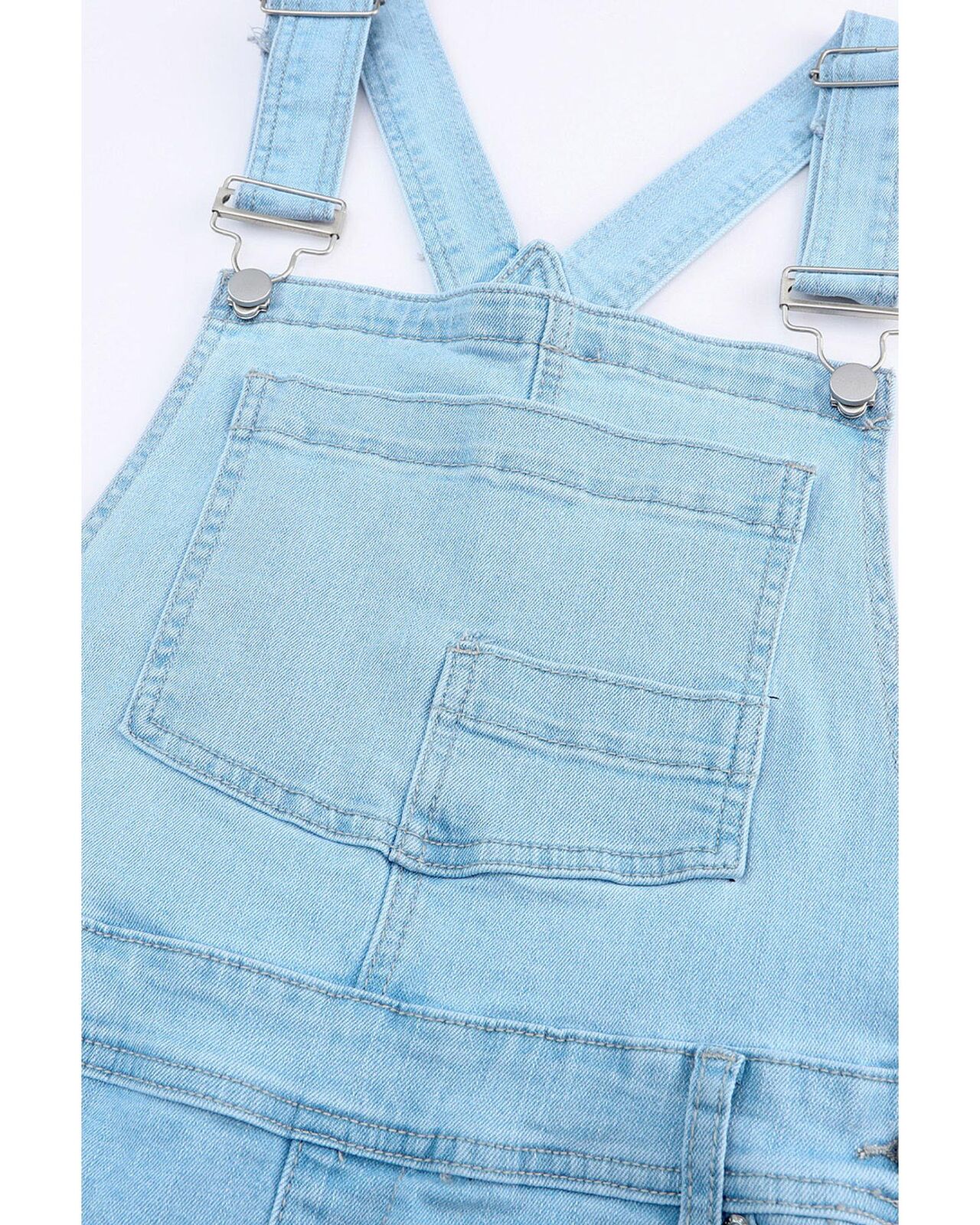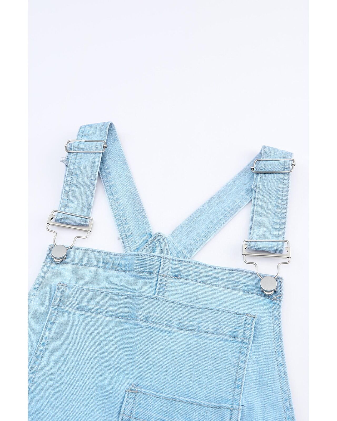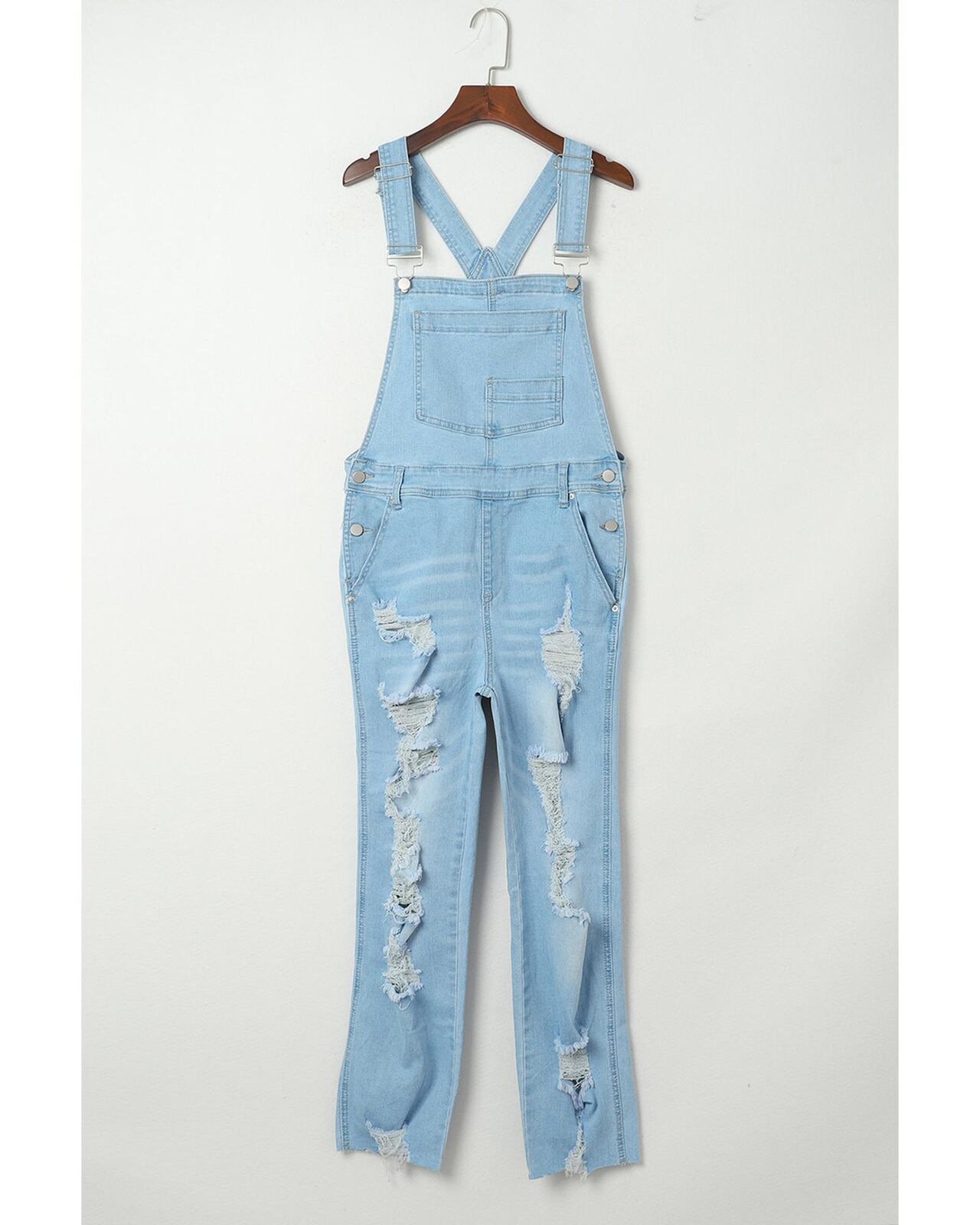 • Light denim overalls with distressed detail