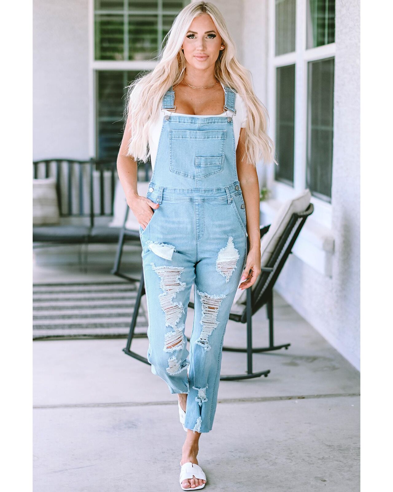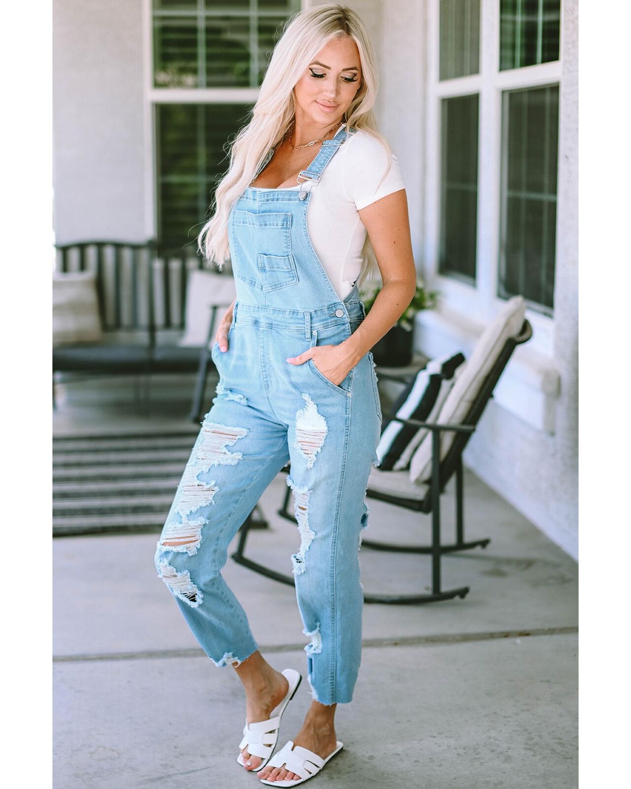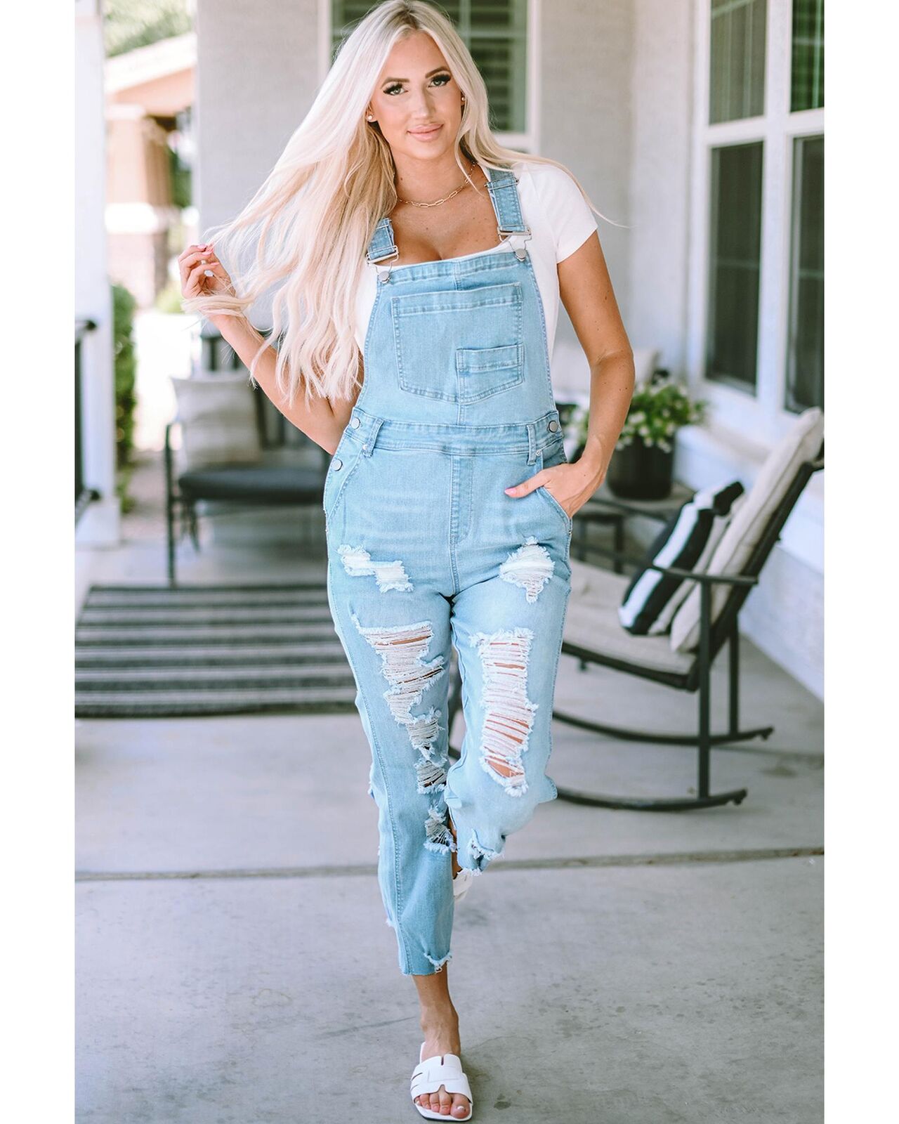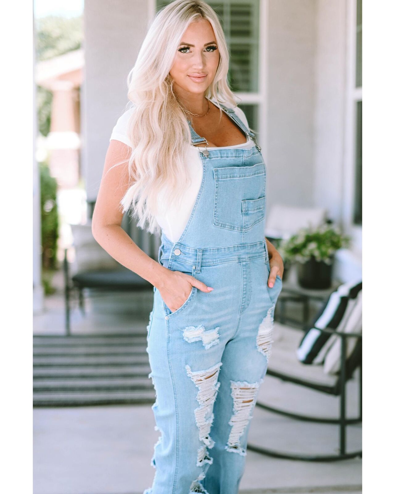 • Light denim overalls with distressed detail