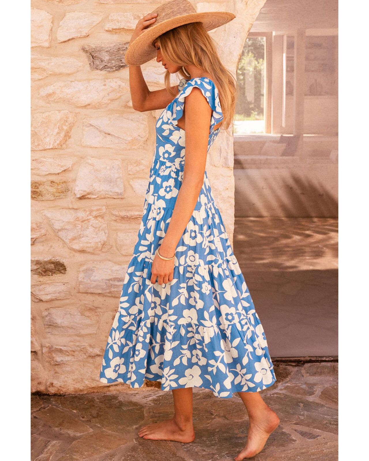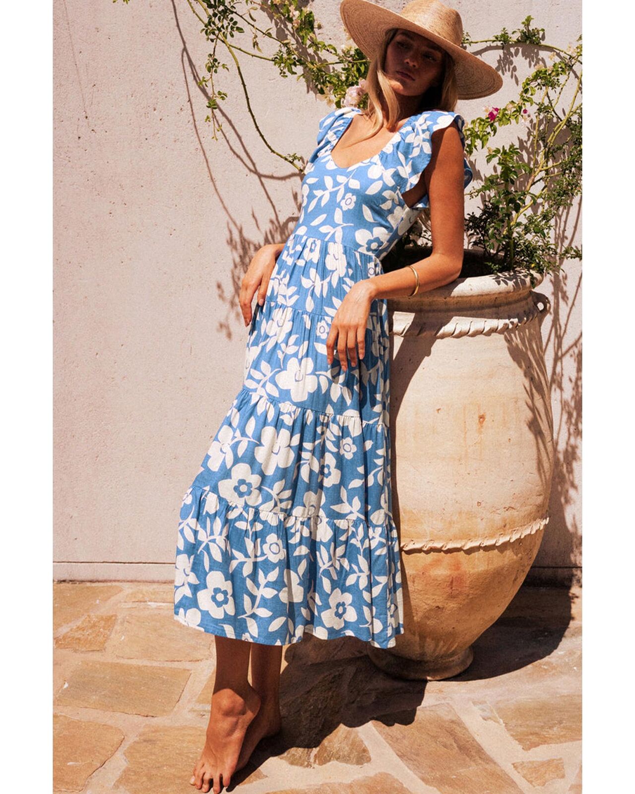 • Sky Blue U Neck Midi Dress with Floral Pattern