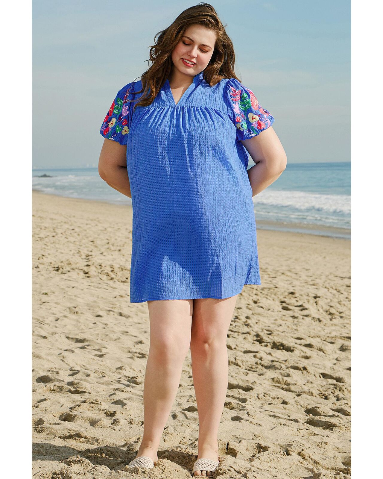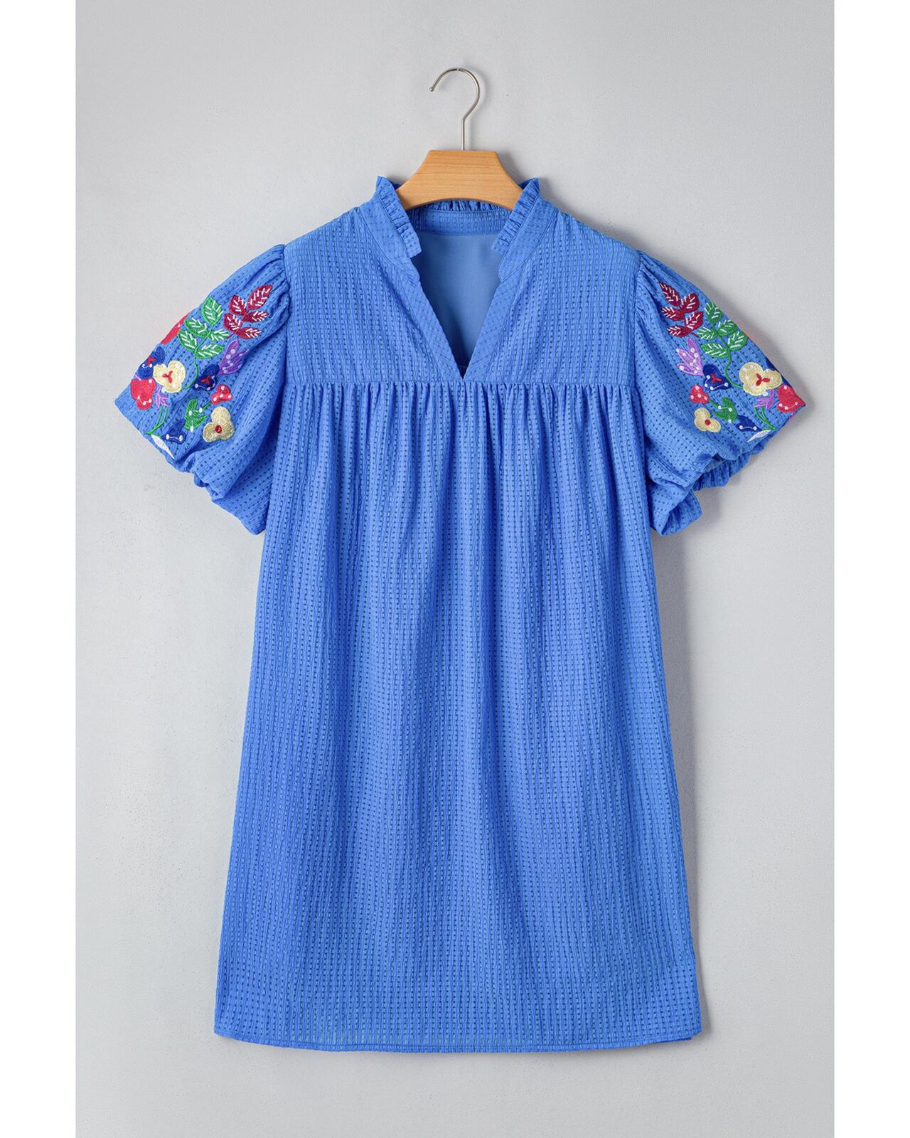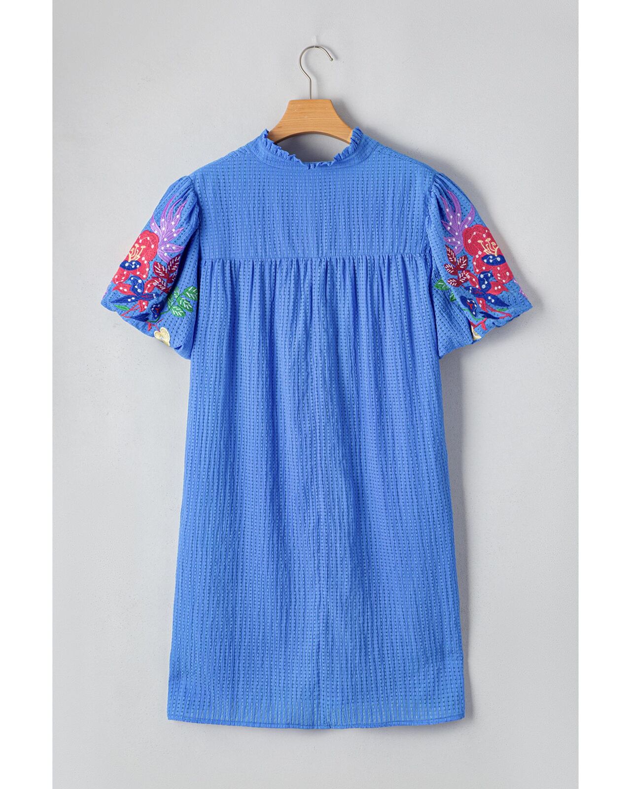 • Sky blue mini dress with floral embroidery