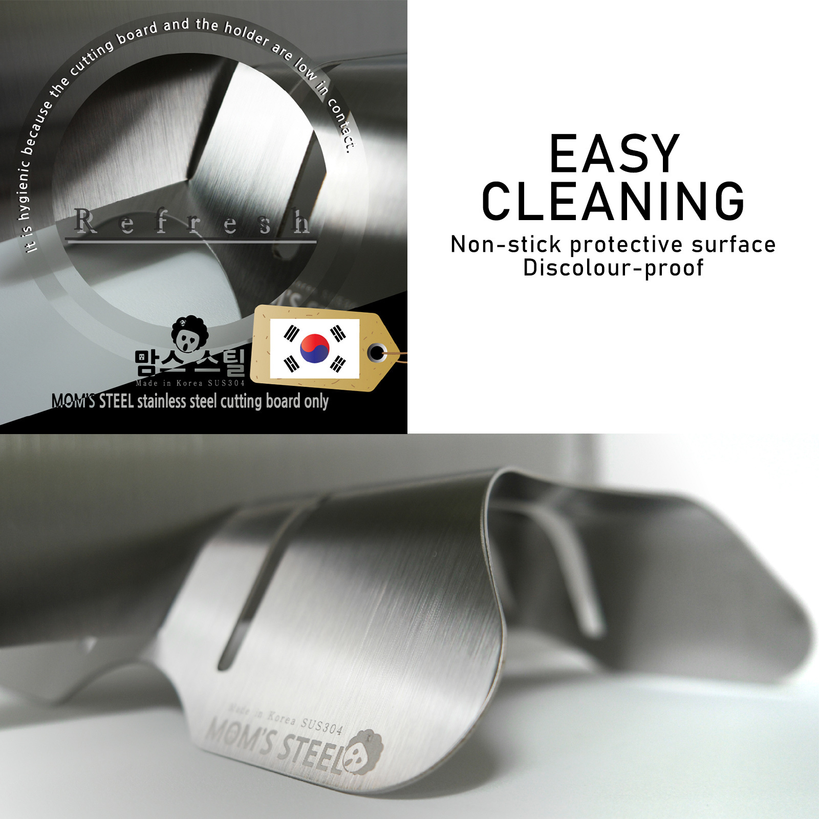 MOM'S STEEL "Antibacterial + Stainless Steel 304" Cutting Board HOLDER is made in Korea. It is a top trending quality health and wellness product that is hygienic and lifelong. In terms of material, it has 8.7 times improved antibacterial power compared to the existing 304 stainless steel.