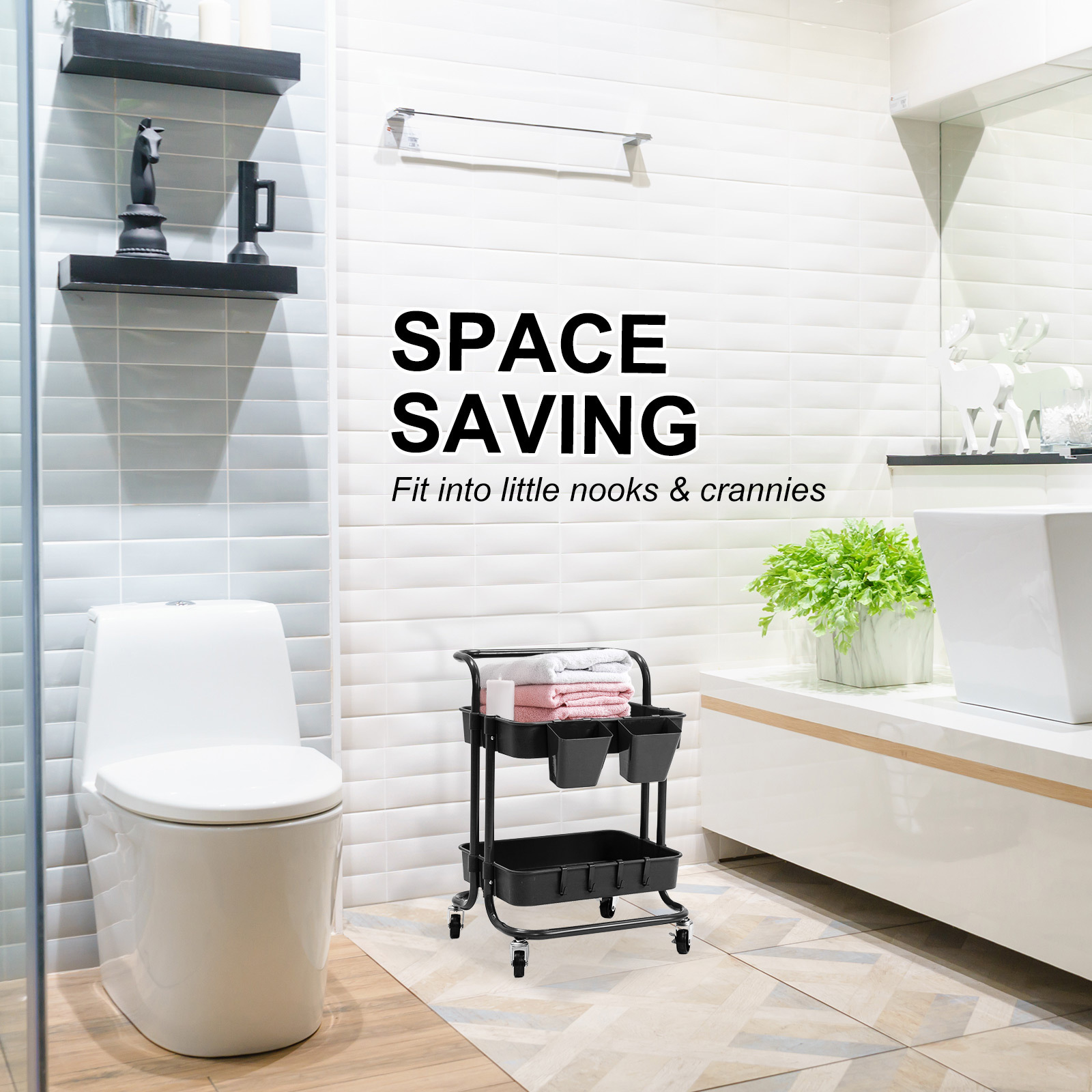 Spacious Storage Capacity: Equipped with removable hooks and hanging cups. Partition to store your various objects, neat and clear at a glance. This kitchen utility cart with wheels provides large storage space while saving you floor space to optimize the space utilization as much as possible; great storage solution for a kitchen, or use it for your pantry, office, garage, laundry supplies, toys, stationeries, or any other multitude of possibilities, etc.