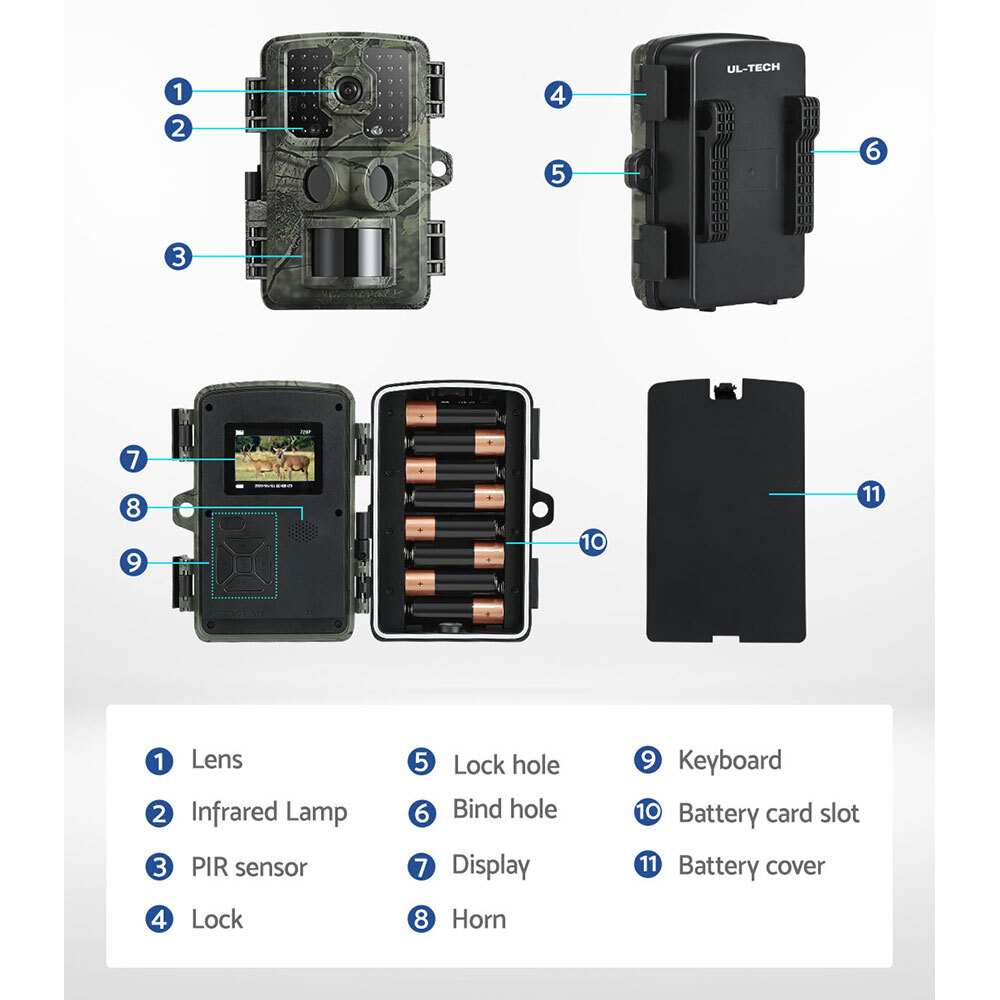 Capture the beauty of nature in razor-sharp focus with a UL-tech Trail Camera. With clear 16MP picture quality and 4K full HD video, you can capture the full spectrum of wild animals, plants and natural phenomena in any weather conditions, from anywhere, anytime. There are multiple ways to record in multiple scenarios, whether you are recording out in nature, on your farm, or at home for security. The camera features 42 high-quality infrared LEDs that are activated immediately when they detect a change in light settings, so you can have clear night vision that will not alert nearby animals. Pick up any activity immediately with the sensitive PIR motion detection. It has a fast 0.5s trigger speed and allows for time-lapse shooting so you can capture every moment. The camera is IP66-certified waterproof for use in any weather and is resistant to cold, heat, dust and even lightning. It has room for up to 8 AA batteries giving it a standby time of up to 6 months of low power consumption and supports microSD cards of up to 32GB storage for long-term recording. Supports 11 operating languages so you can choose the best support for your area. Best of all, the device is easy to install and blends into the environment thanks to its camouflage design. Observe nature in its purest form with a UL-tech Trail Camera.