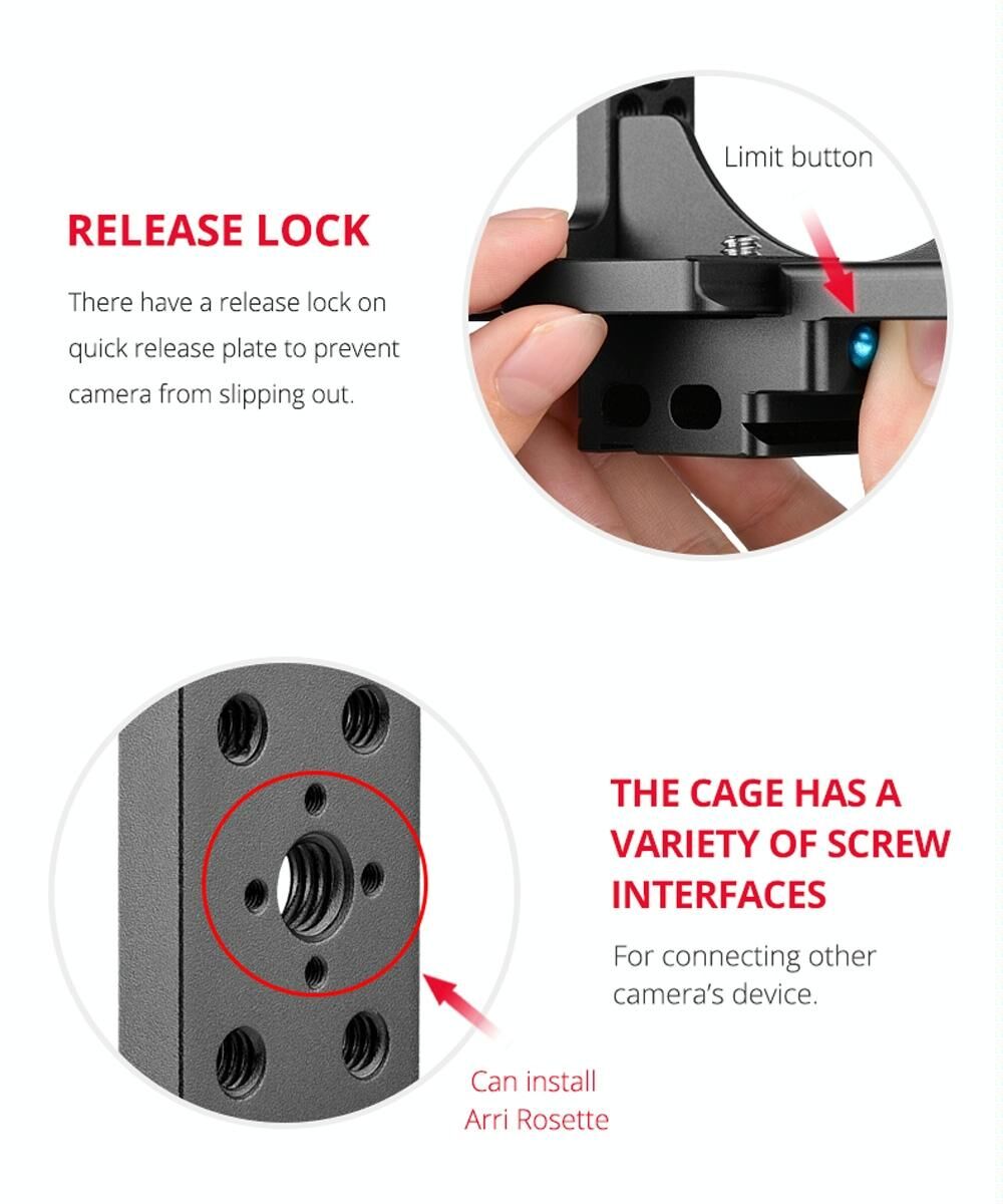 • 1/4 and 3/8 screw holes, cold shoe, and Arri stop holes interface.