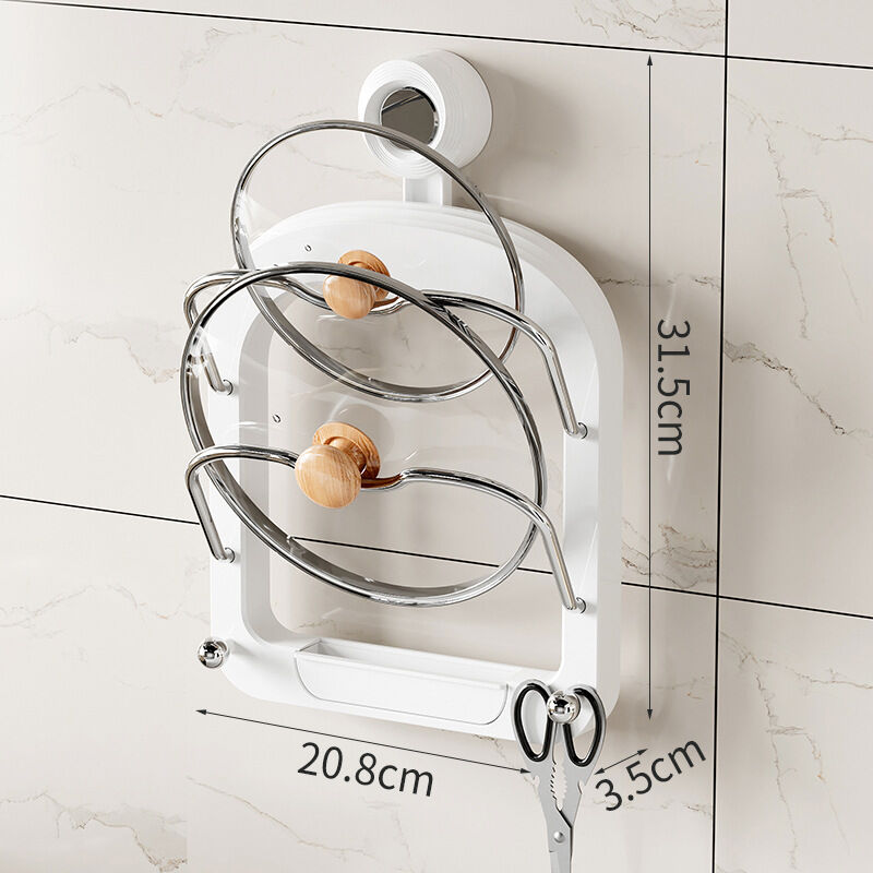 Optimize your kitchen space with this wall-mounted pot lid organizer rack, designed to hold multiple pot lids securely and save valuable countertop space. Measuring 31.5 cm in height, 20.8 cm in width, and 3.5 cm in thickness, this sleek and sturdy rack easily mounts to your wall with a strong adhesive, eliminating the need for drilling. Ideal for organizing pot lids, it also features an additional hook for kitchen tools like scissors, making it a practical and space-saving solution for any kitchen.