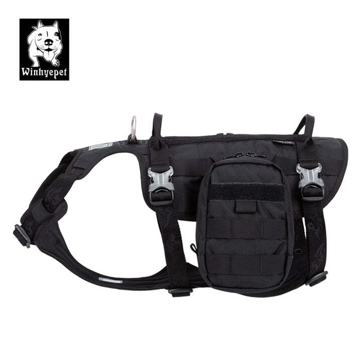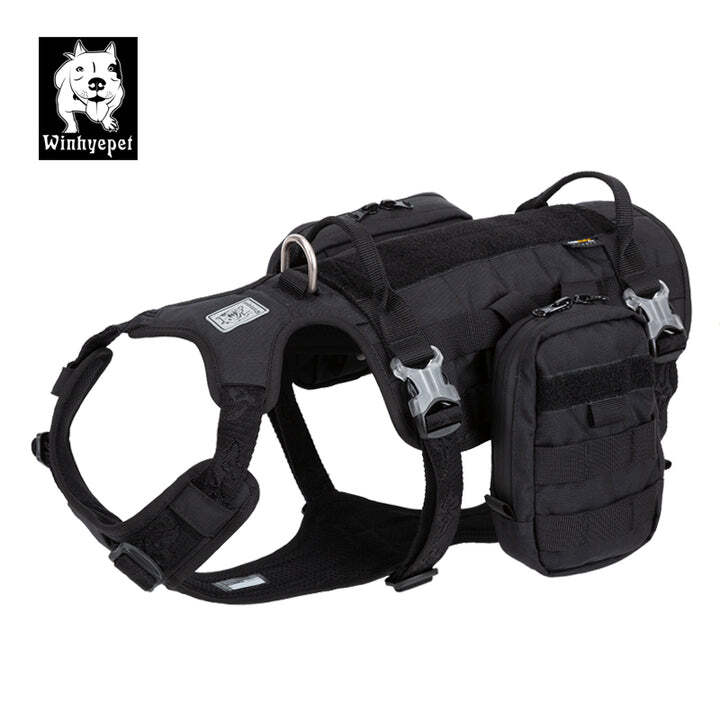 Military Harness Backpack. This High-performance tactical training military harness features adjustable buckles to provide superior comfort for your dog and a side pocket for treats or other items. The backpack is detachable and looks great if you want to use it just as a harness. The Military harness backpack is waterproof and made from Codura fabric which makes it perfect for all seasons. It features an aluminum Alloy D ring and nylon webbing. The Backpack harness is easy to take on and off.