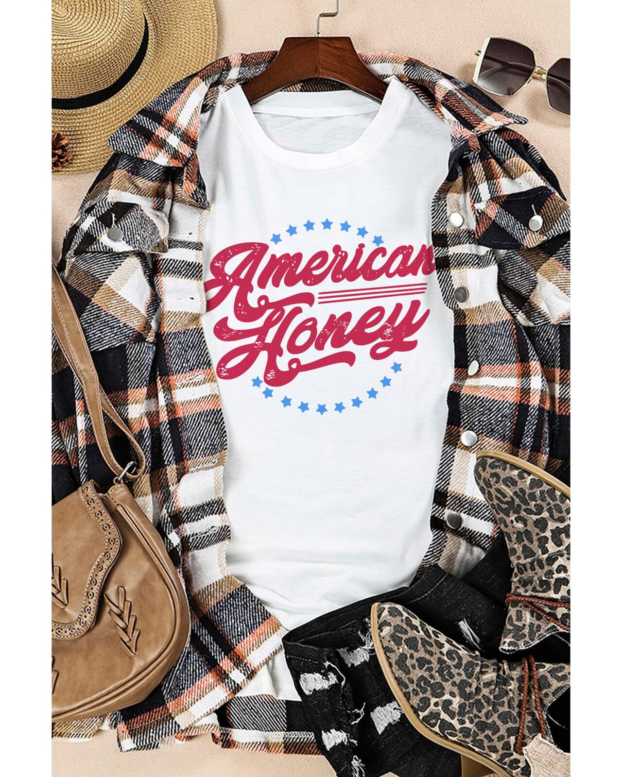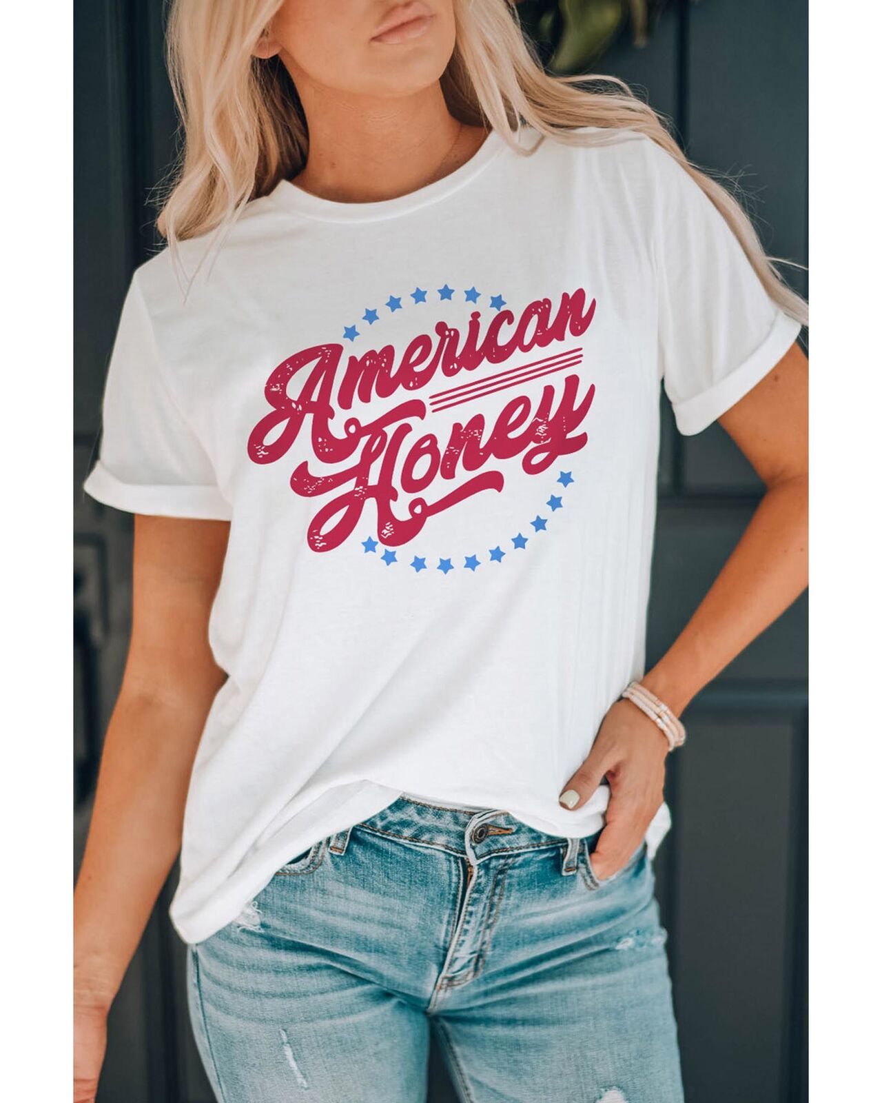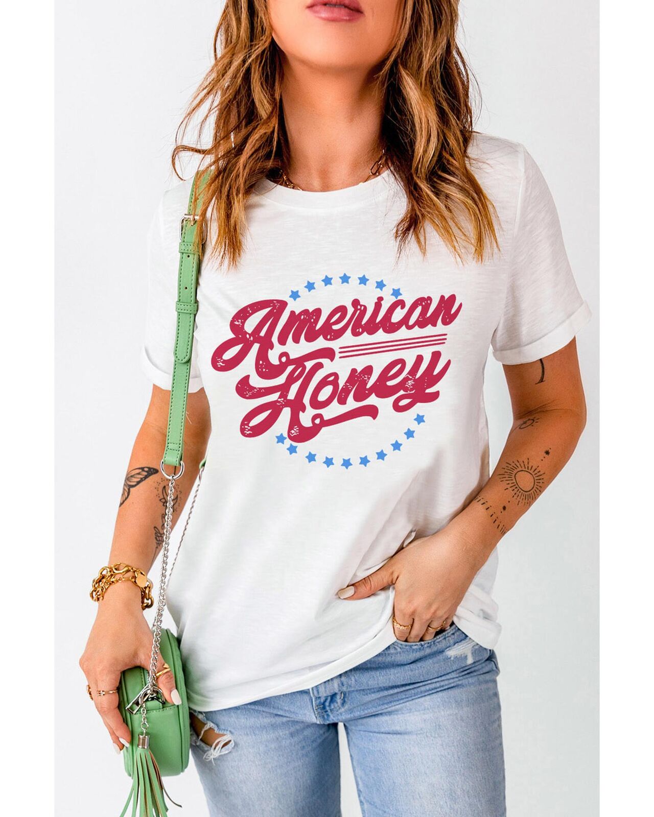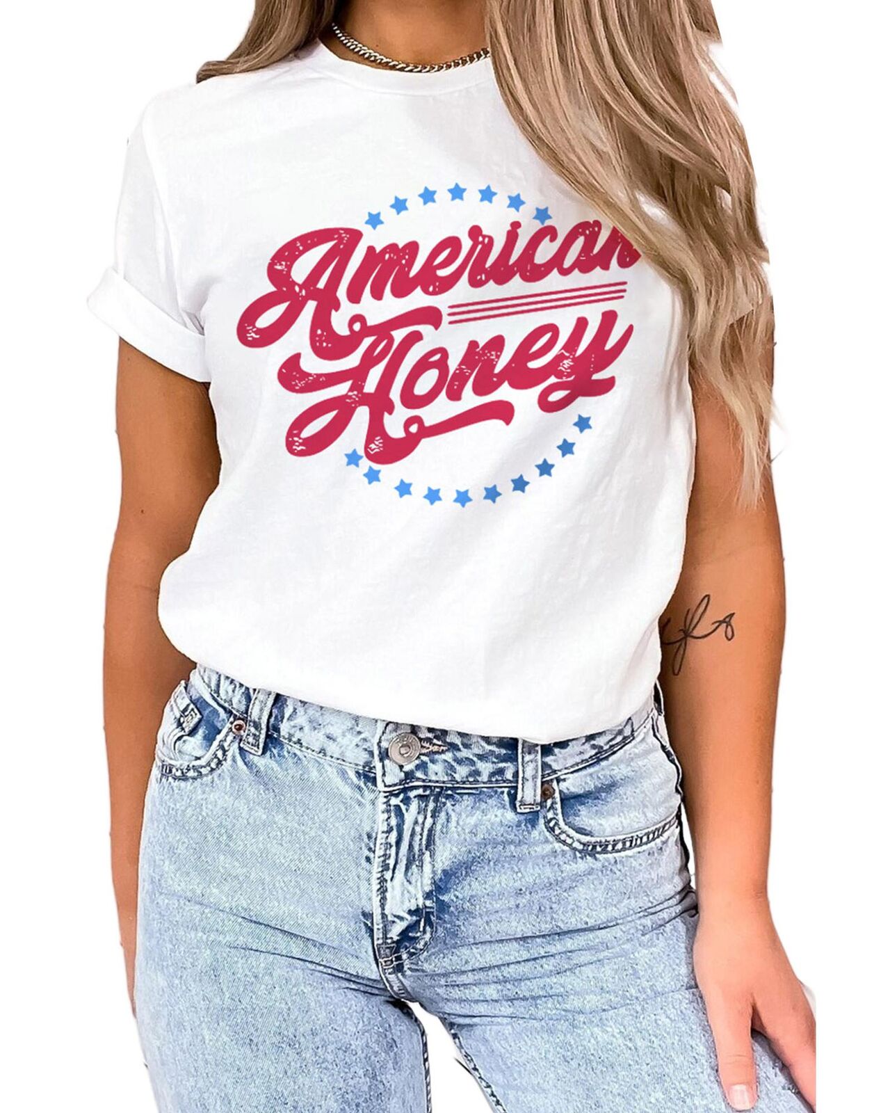 • Our styles are designed with a trendy fitted look in mind following an international size standard. For the best fit we suggest choosing one size up from your usual. Be sure to check our sizing chart to find your perfect match! Stylish and trendy White American Honey Graphic Tee Short sleeve design with American Honey Stars print Made with high
