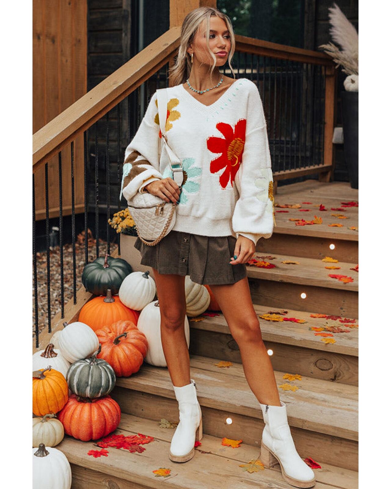 • White Big Flower Pattern V Neck Drop Shoulder Sweater