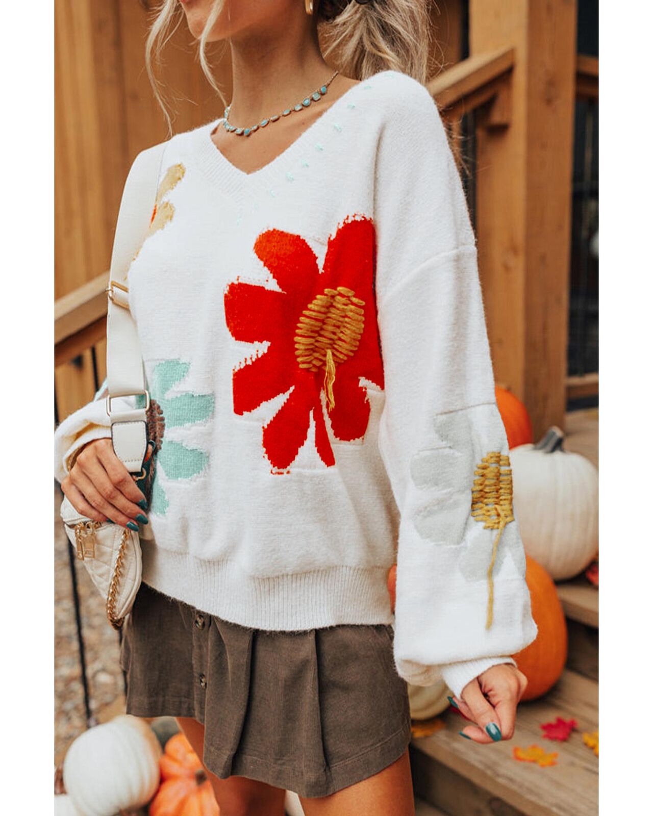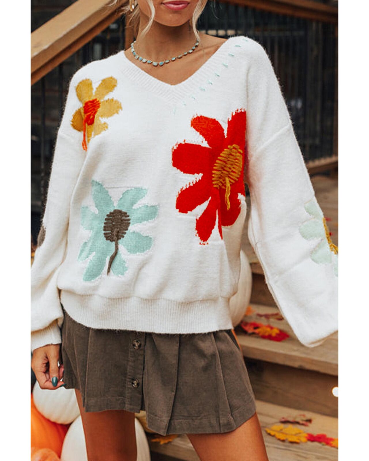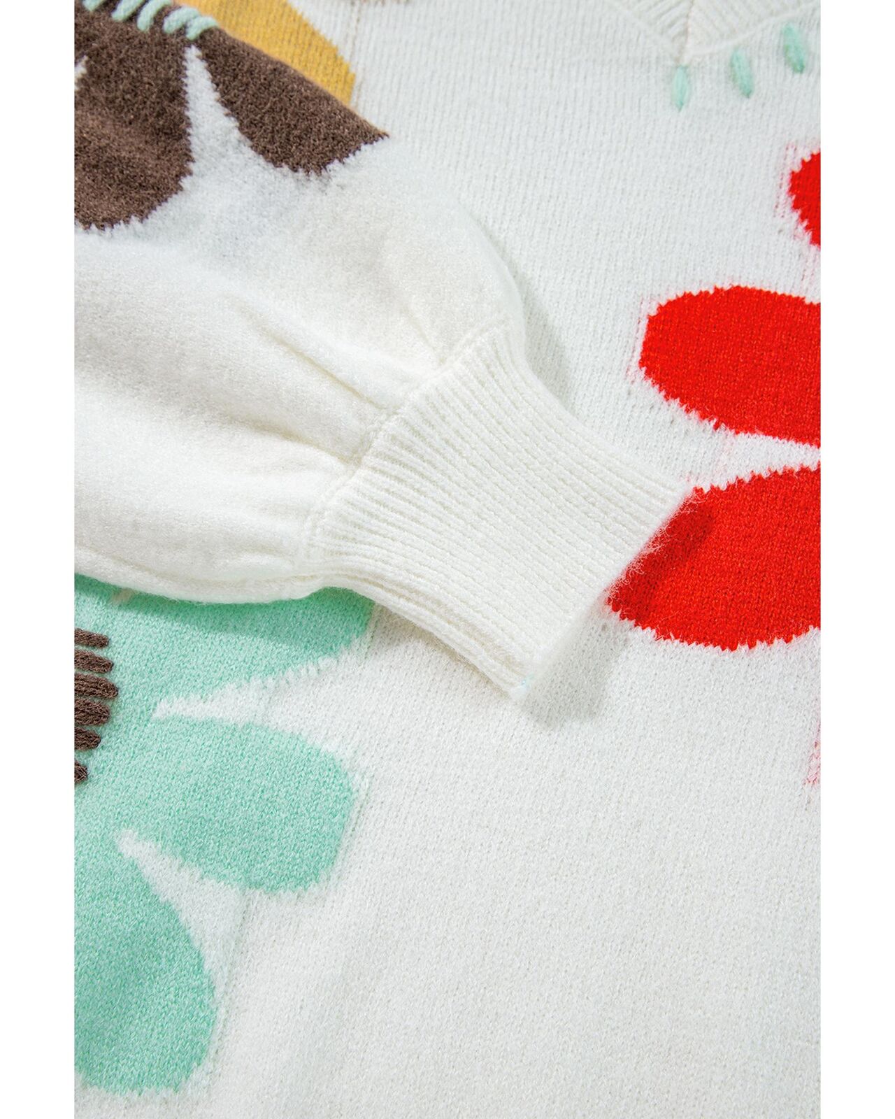 • White Big Flower Pattern V Neck Drop Shoulder Sweater