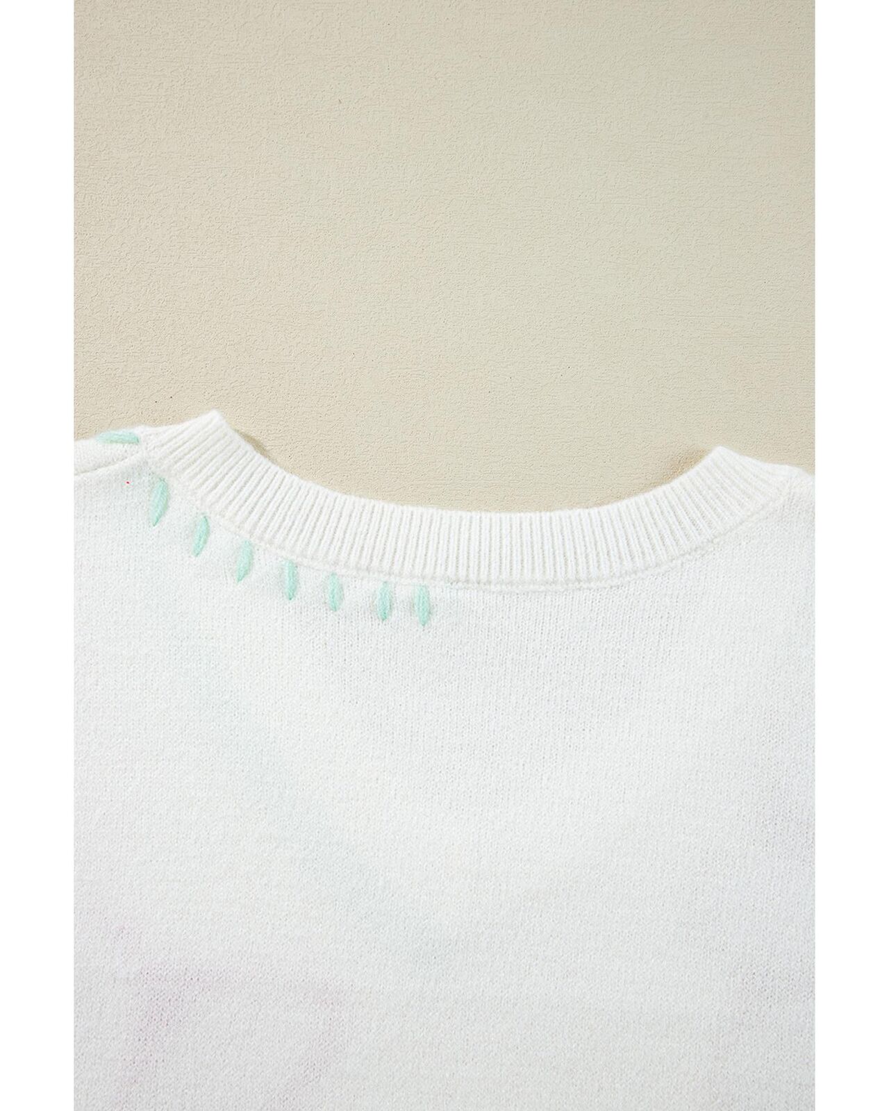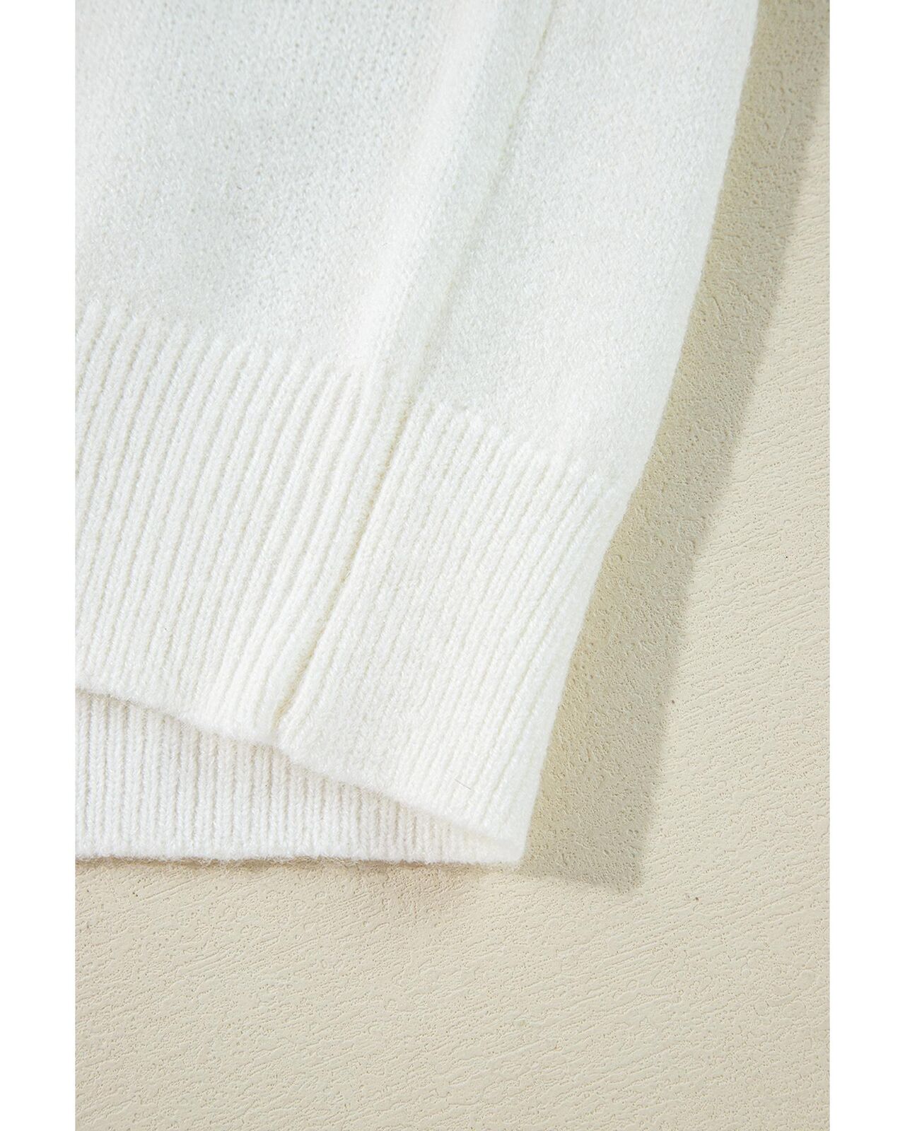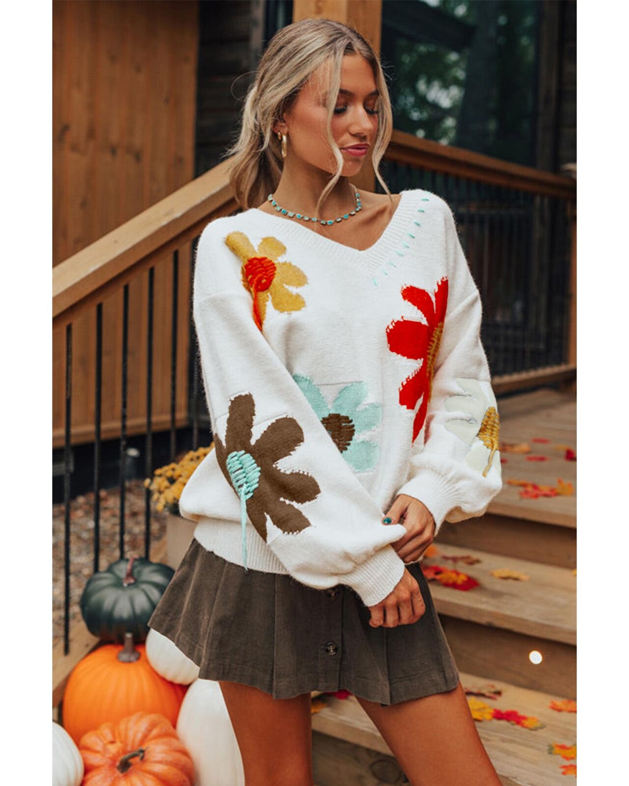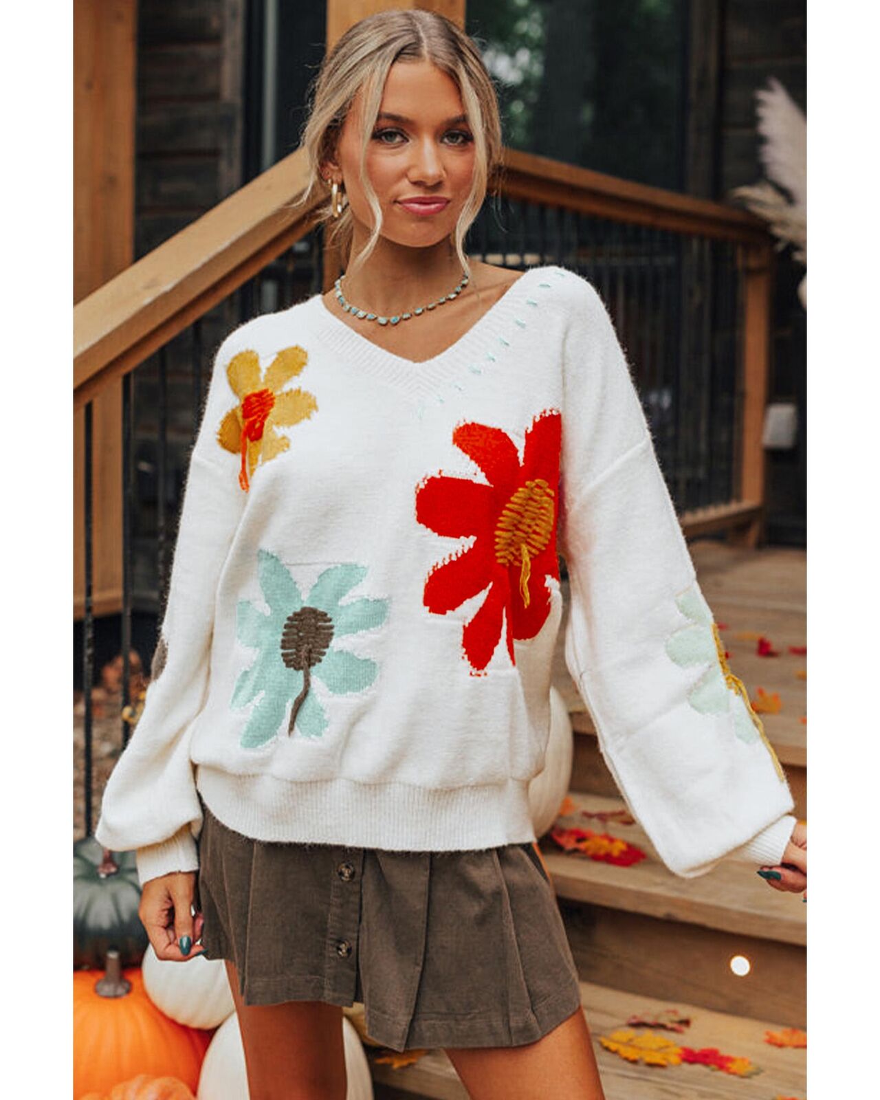 • White Big Flower Pattern V Neck Drop Shoulder Sweater