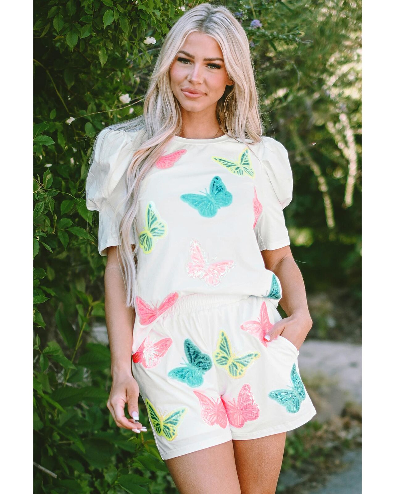 • White Colorful Sequin Butterfly Puff Sleeve Top Shorts Set
