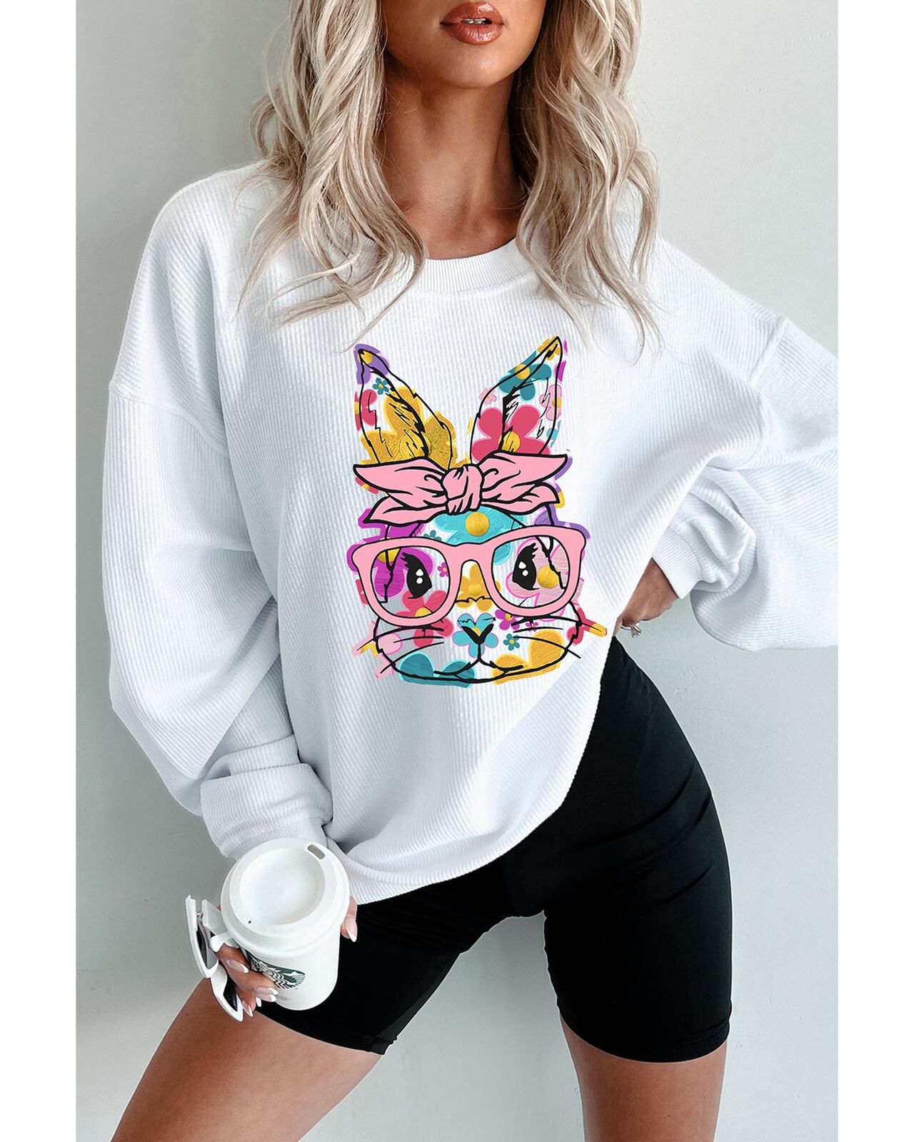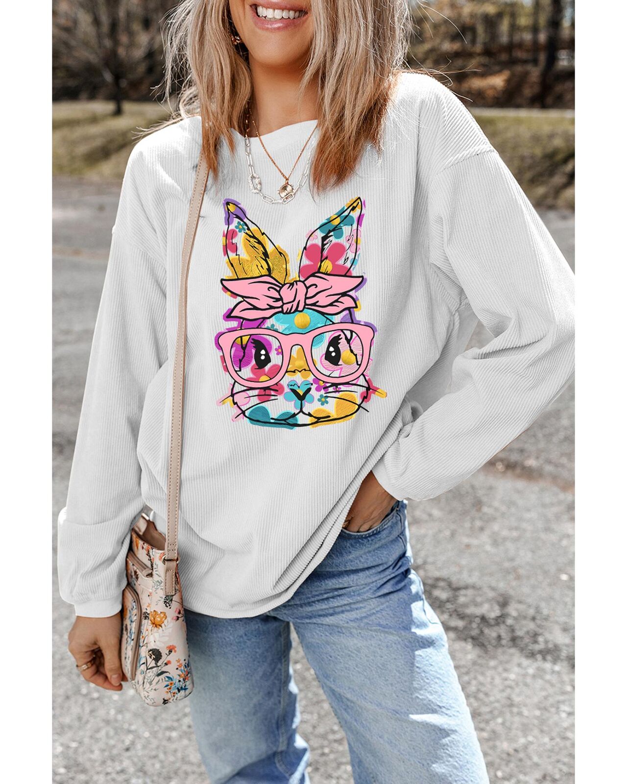 • White Floral Rabbit with Glasses Graphic Corded Easter Sweatshirt
