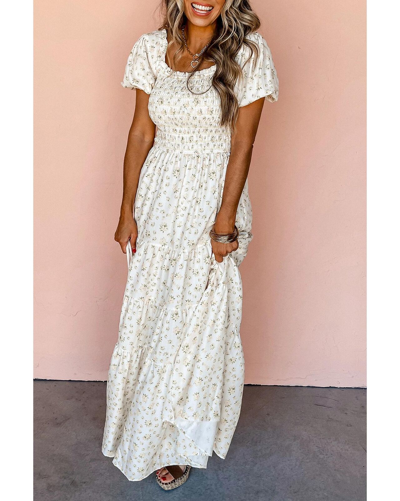 • White Frilly Shirred Bodice Tiered Floral Maxi Dress
