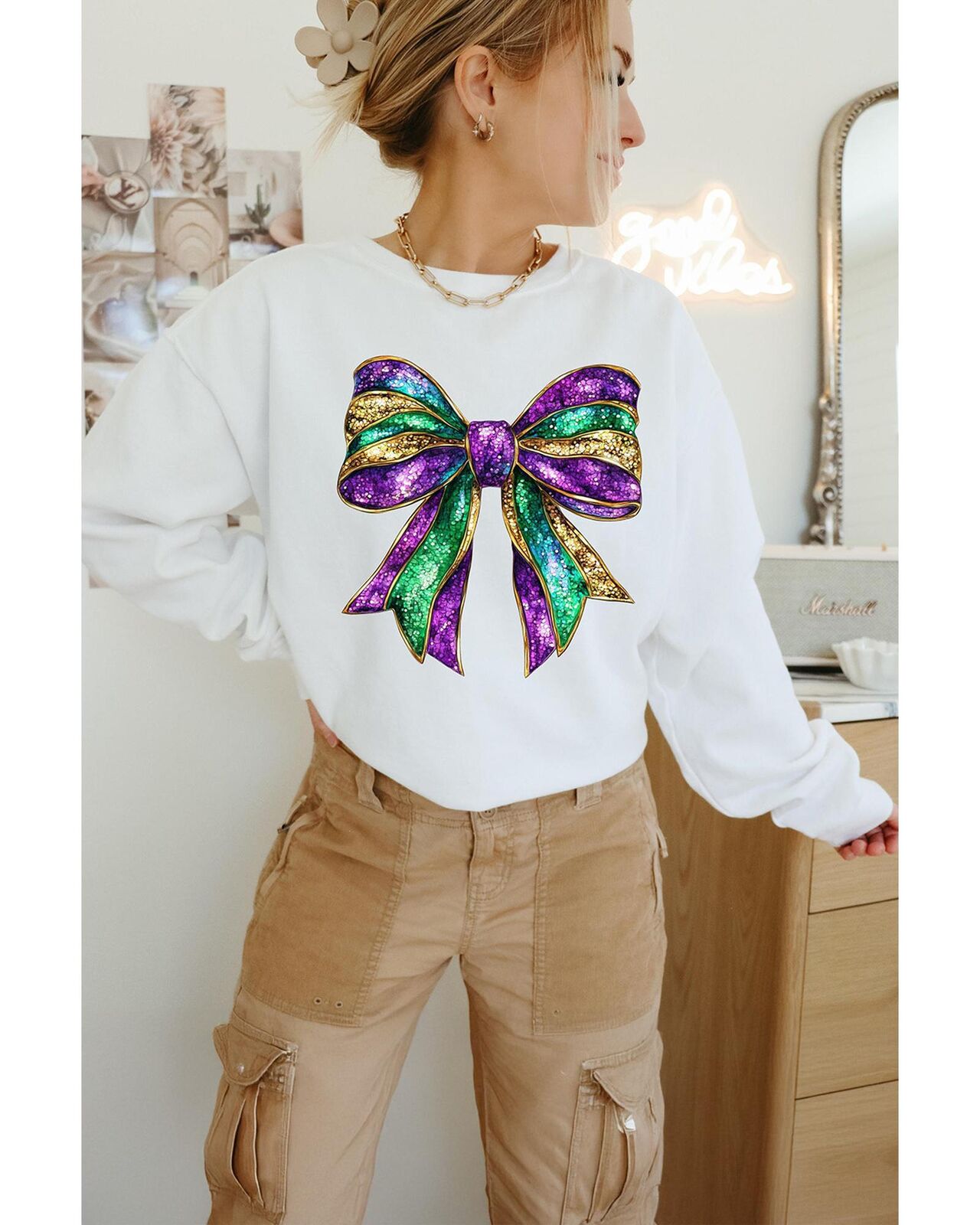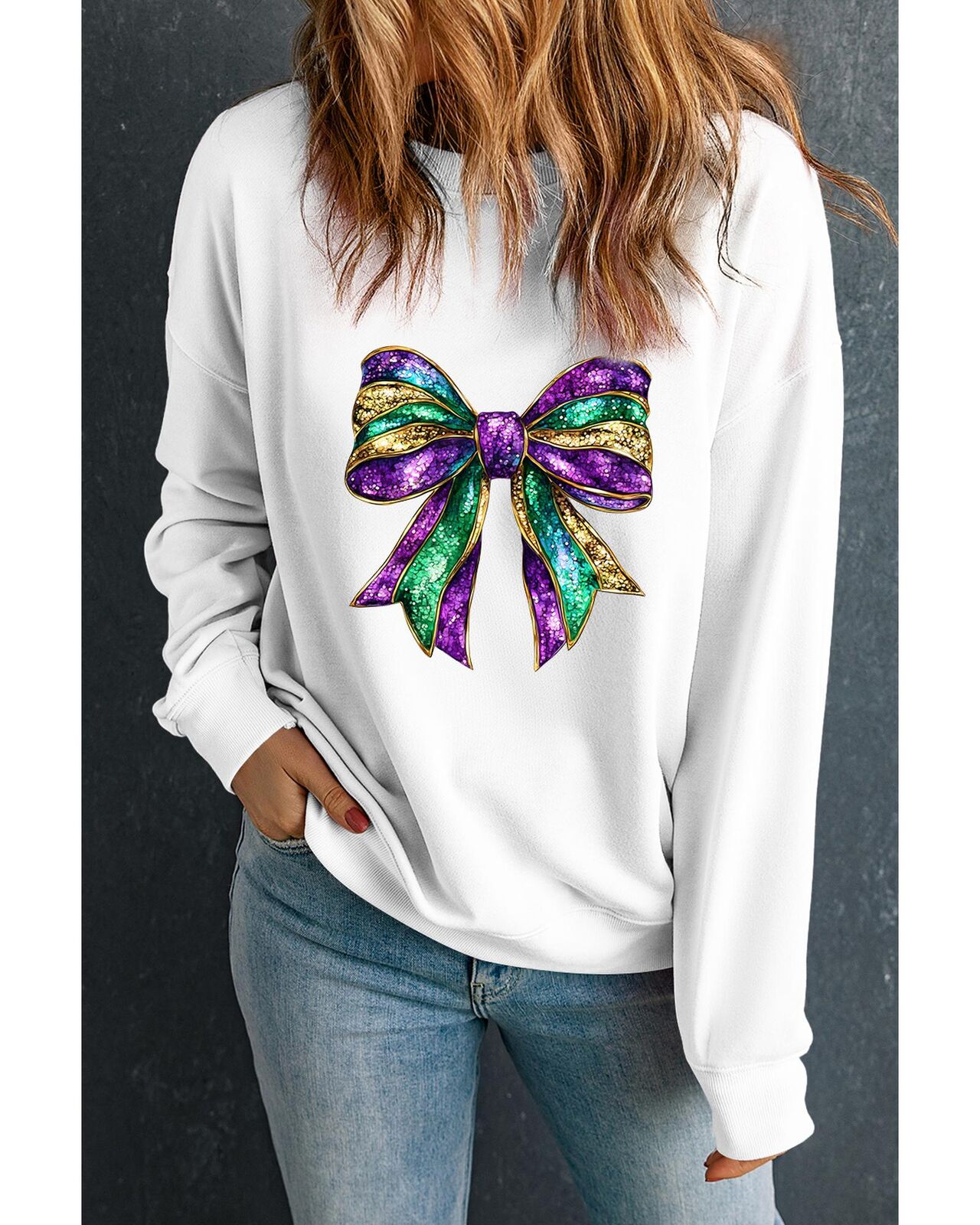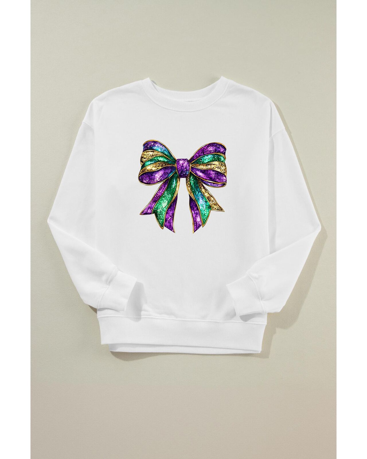 • Mardi Gras bow graphic brings the festive spirit to this sweatshirt