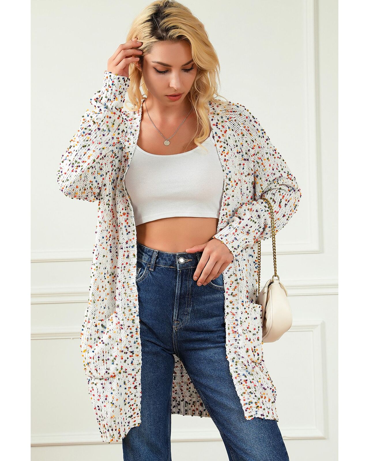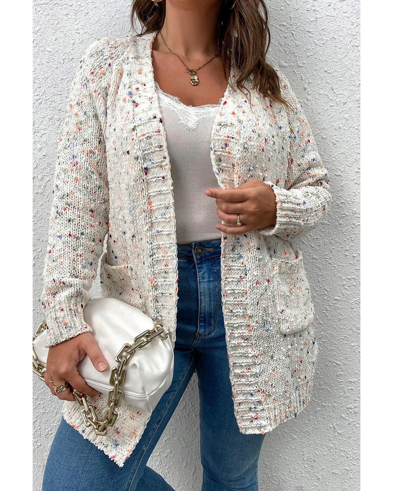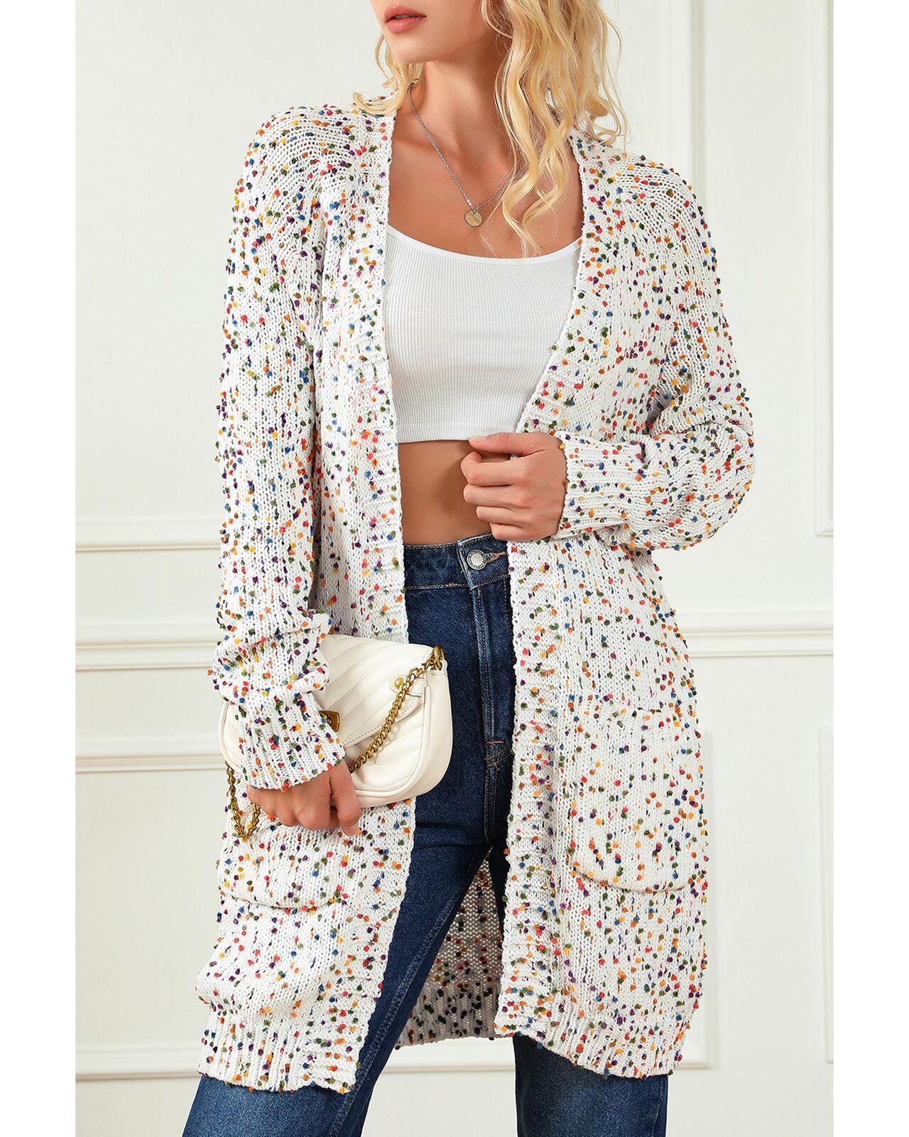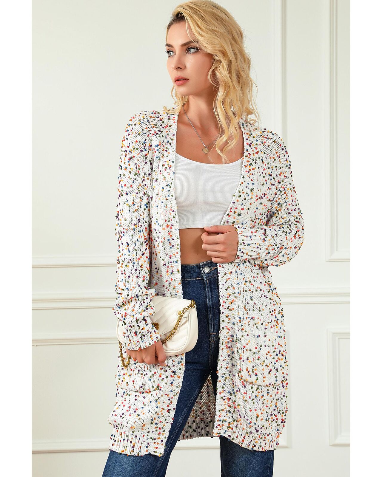 • Our styles are designed with a trendy fitted look in mind following an international size standard. For the best fit we suggest choosing one size up from your usual. Be sure to check our sizing chart to find your perfect match! Charming cardigan with vibrant and playful colorful speckles Knitted construction for warmth and comfort Open