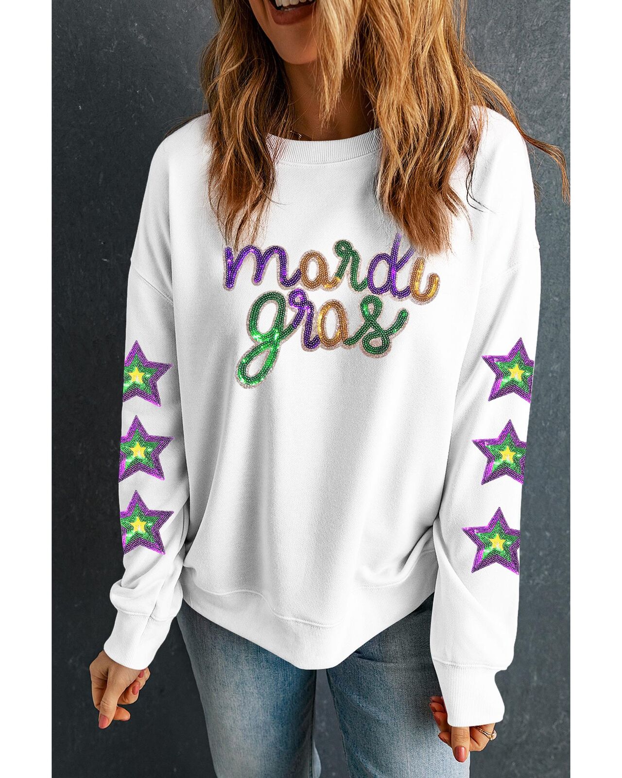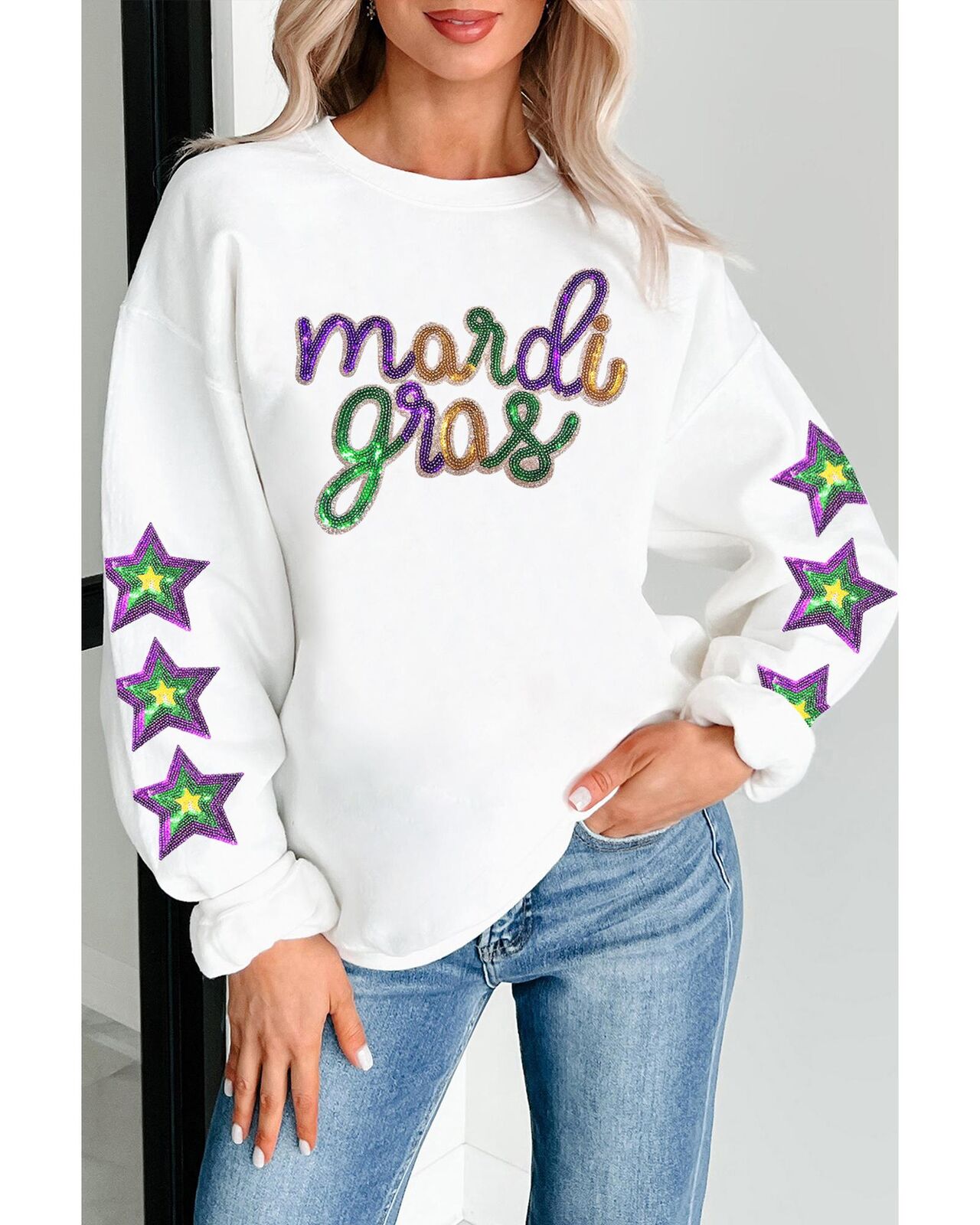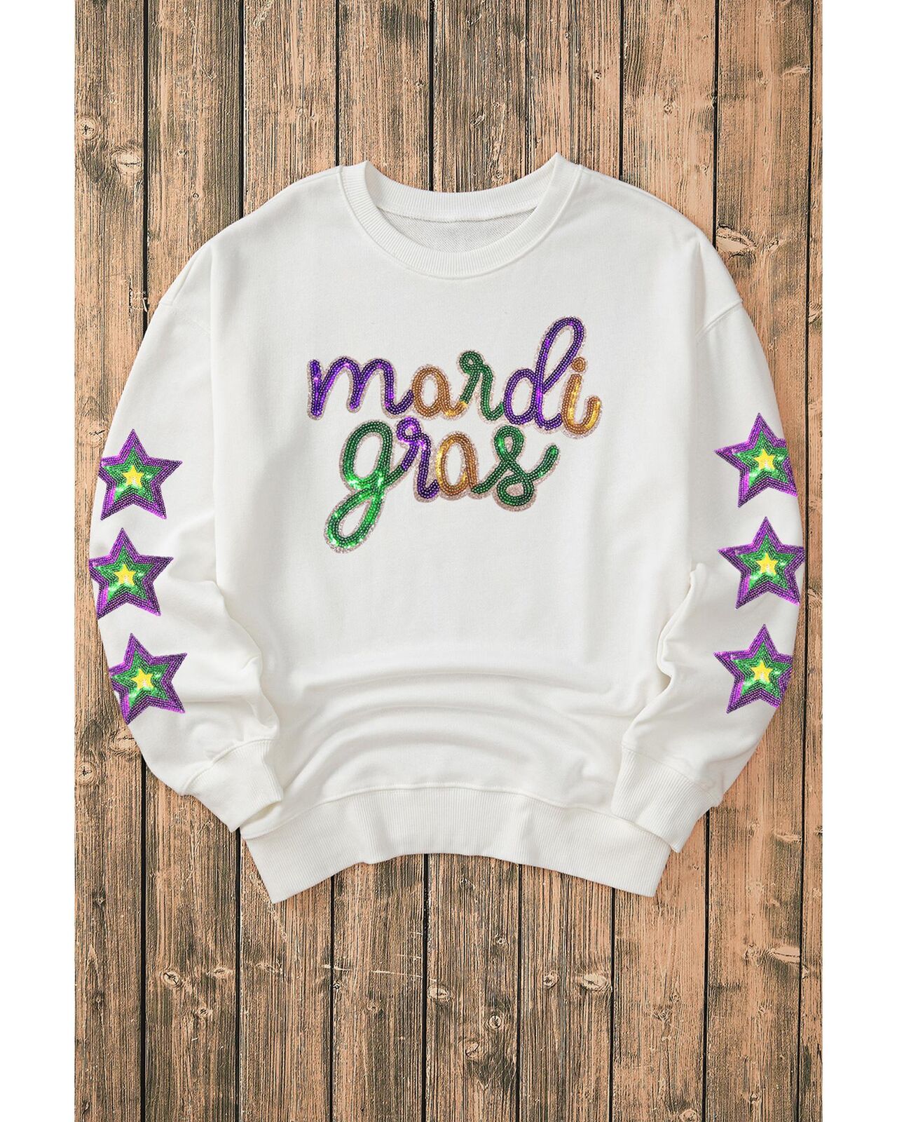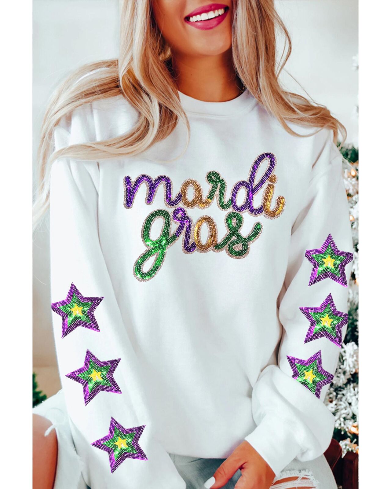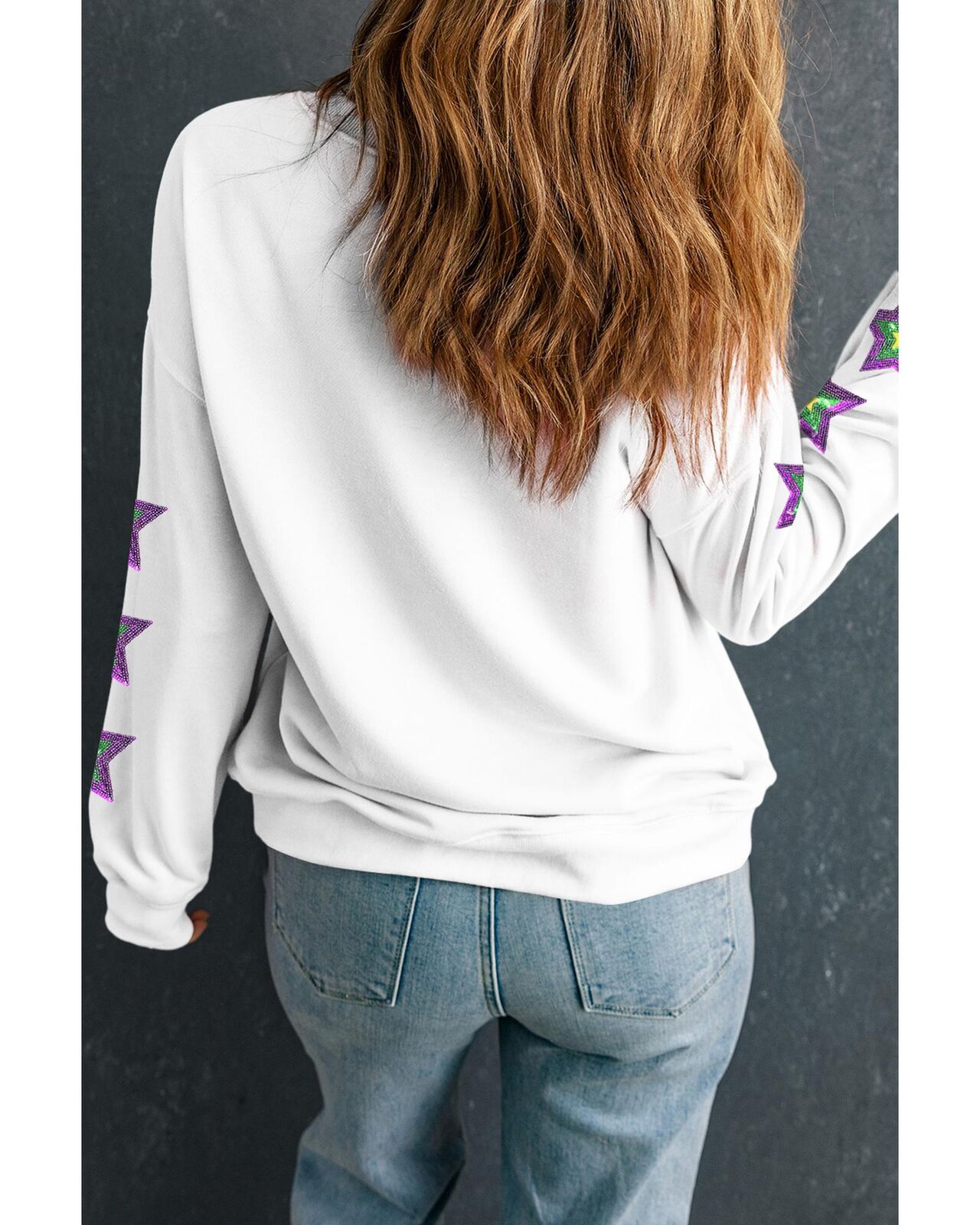 • White Sequin Mardi Gras Graphic Star Sleeve Pullover Sweatshirt