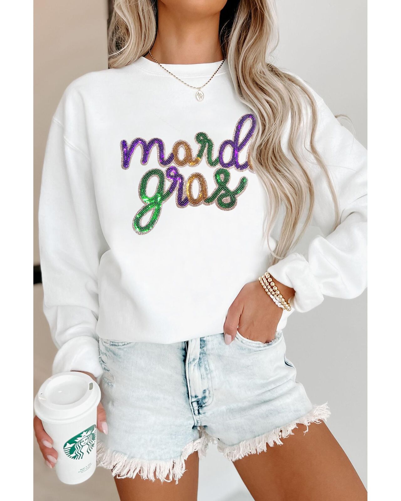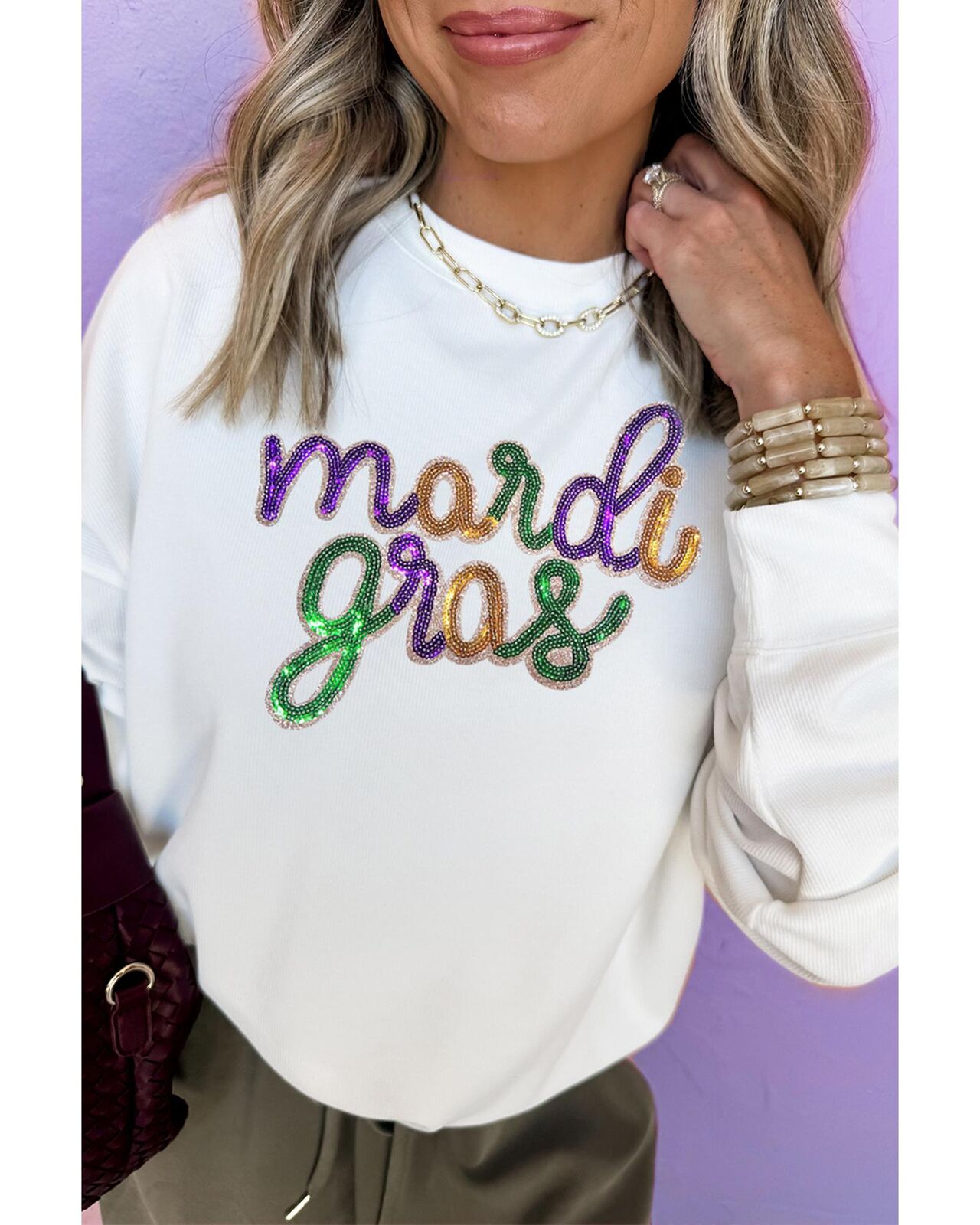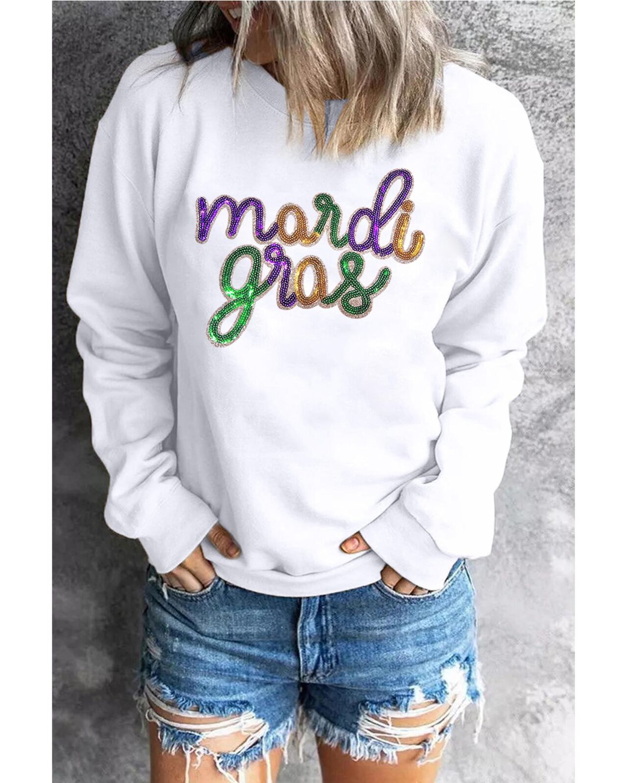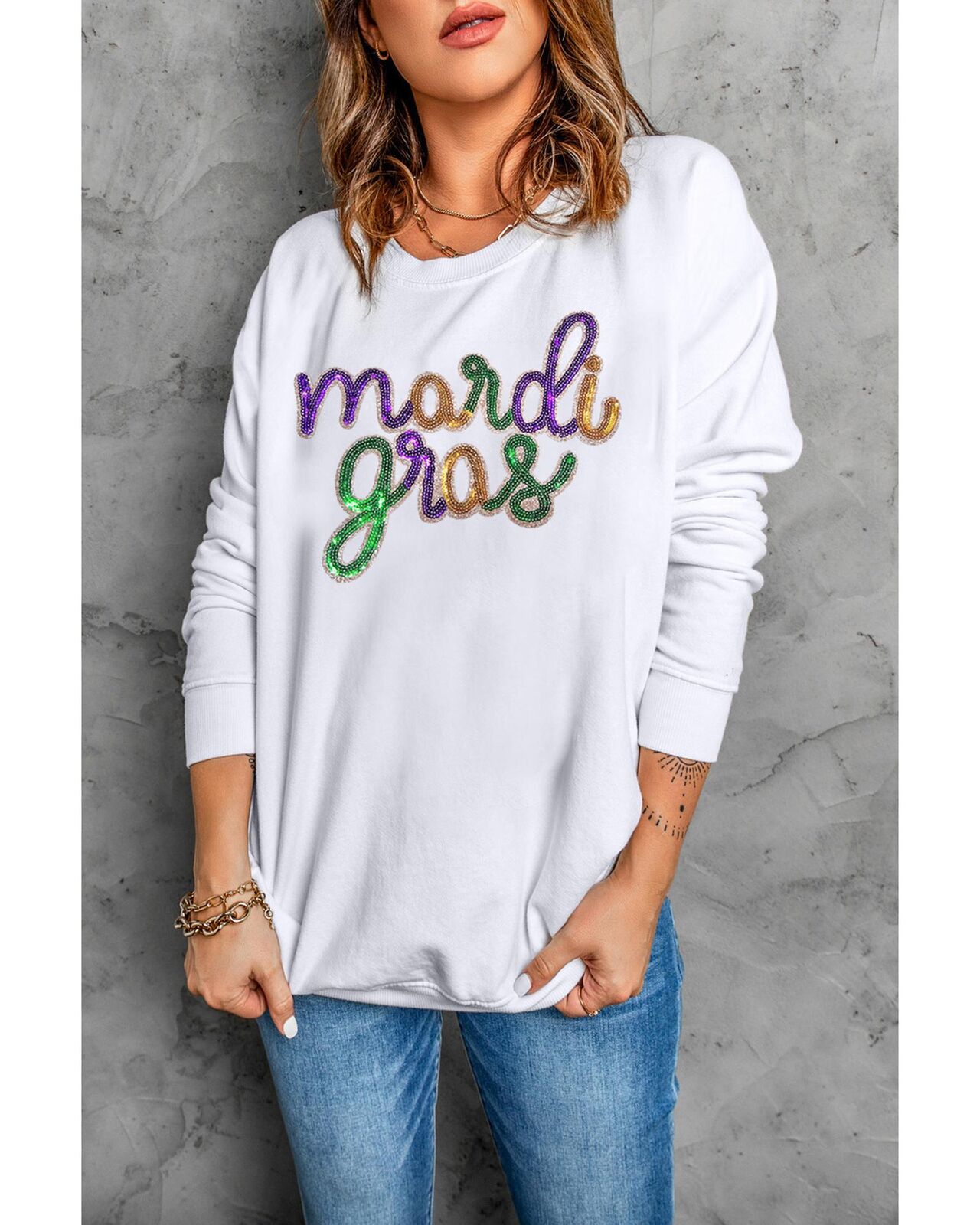 • White sequined Mardi Gras graphic crew neck drop shoulder sweatshirt